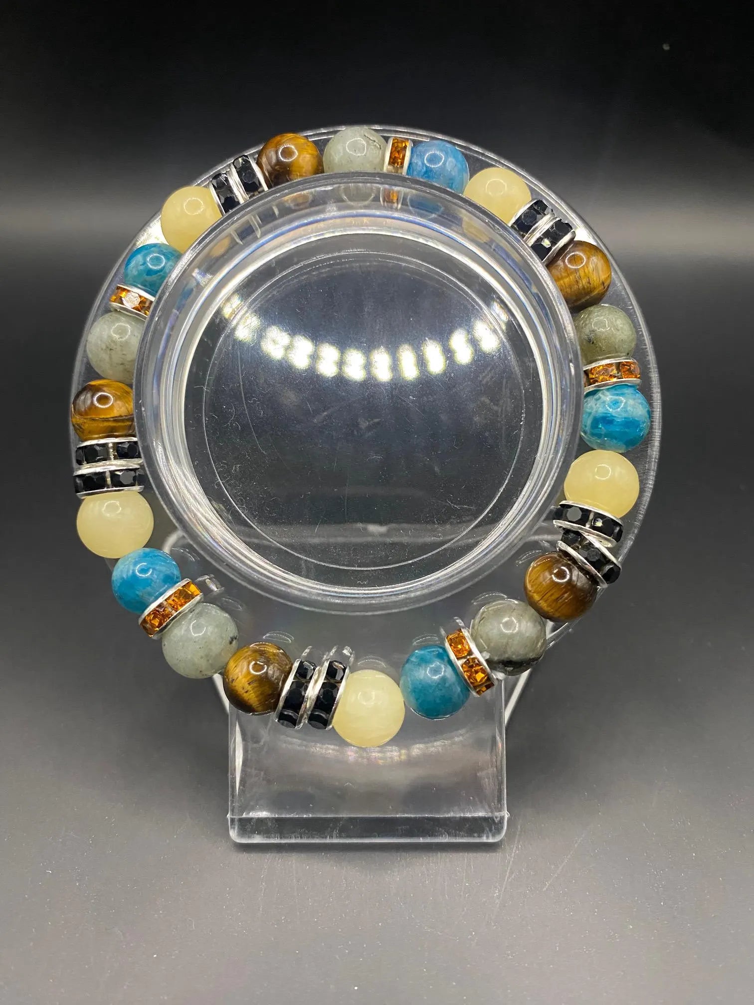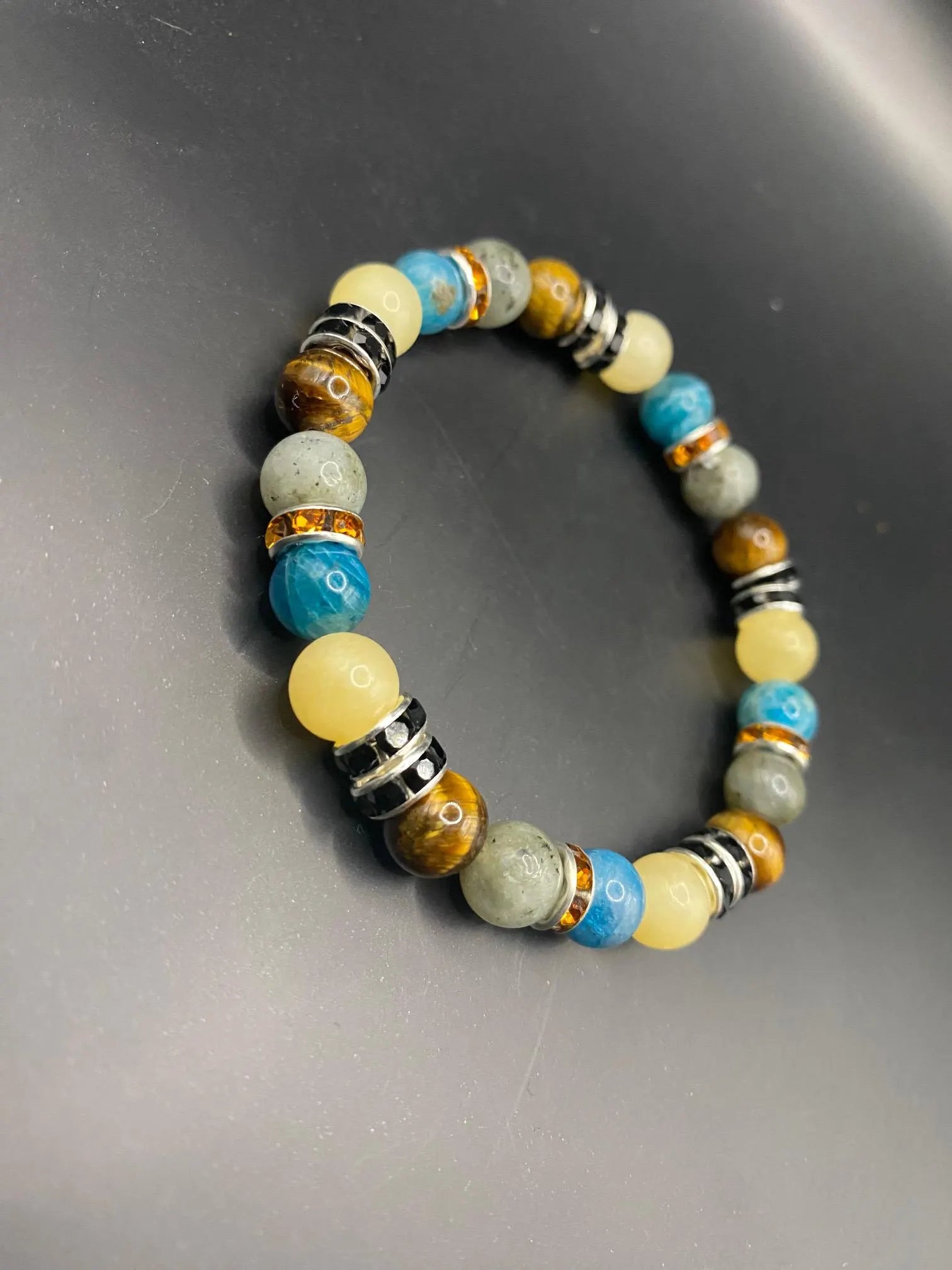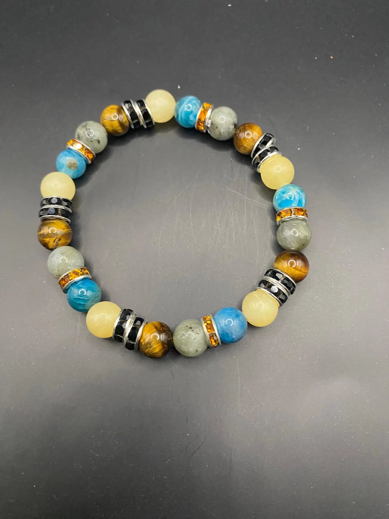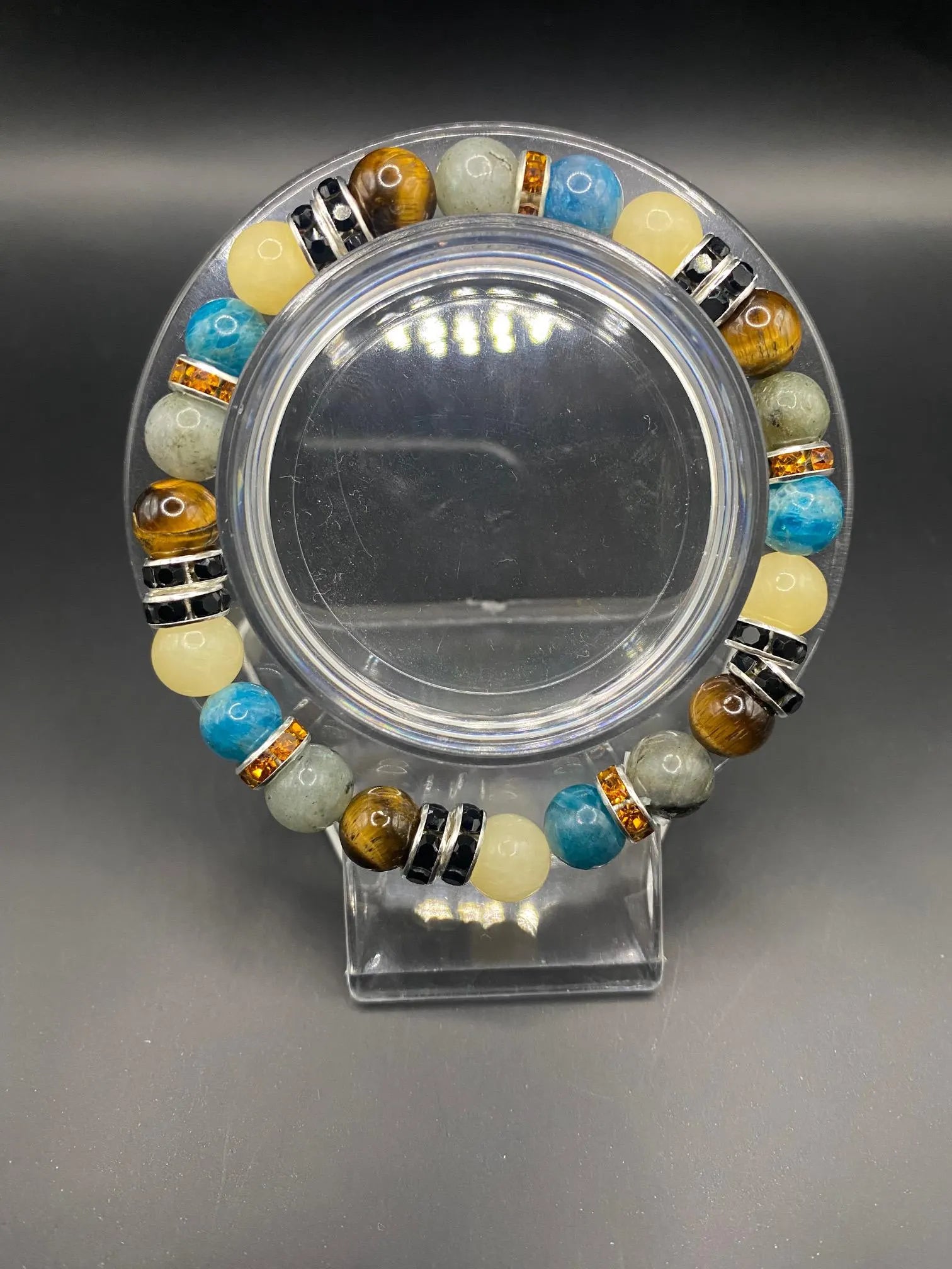 It's made with labradorite, blue apatite, honey calcite and tigers eye stones and gold spacers <3