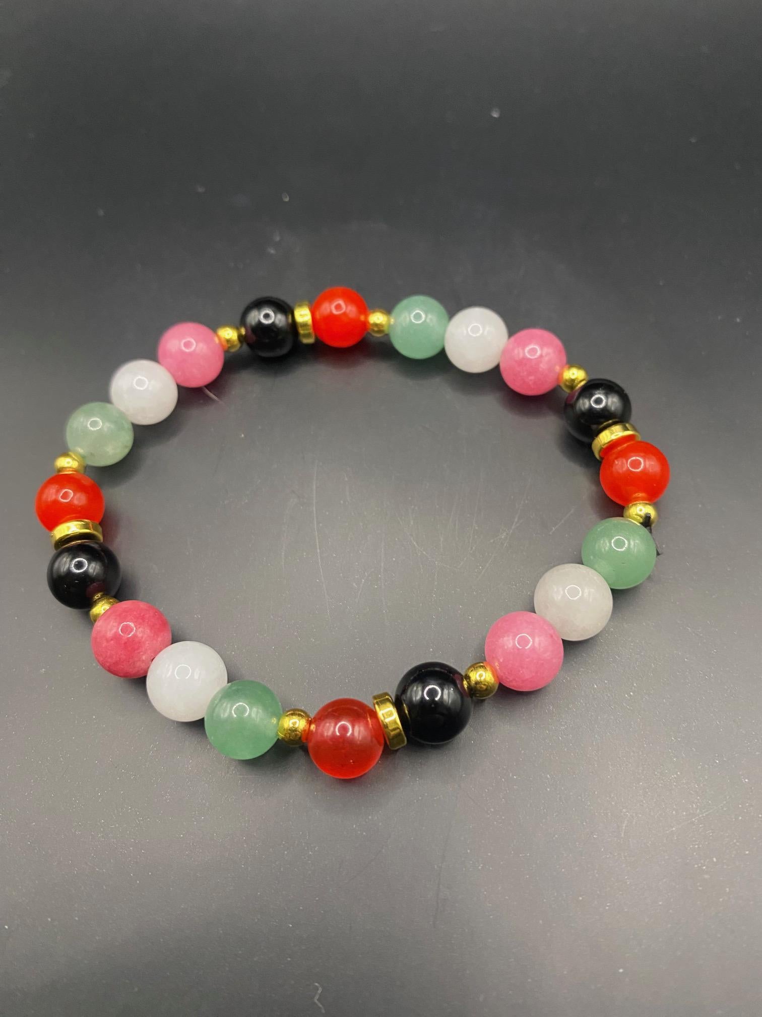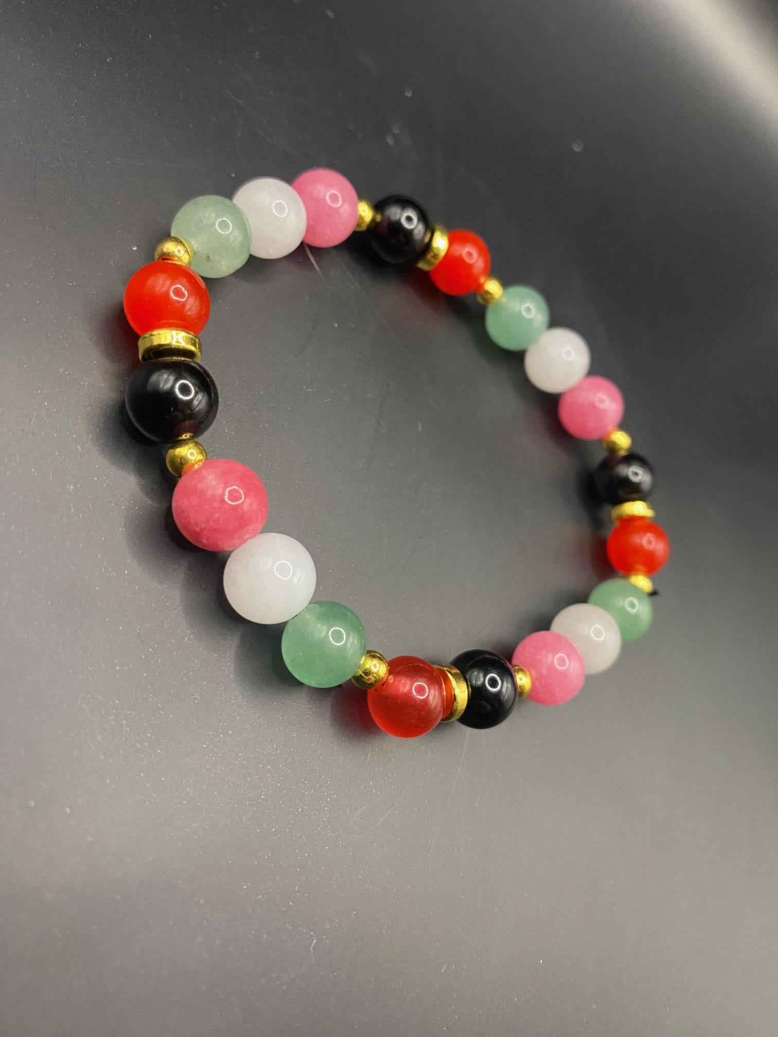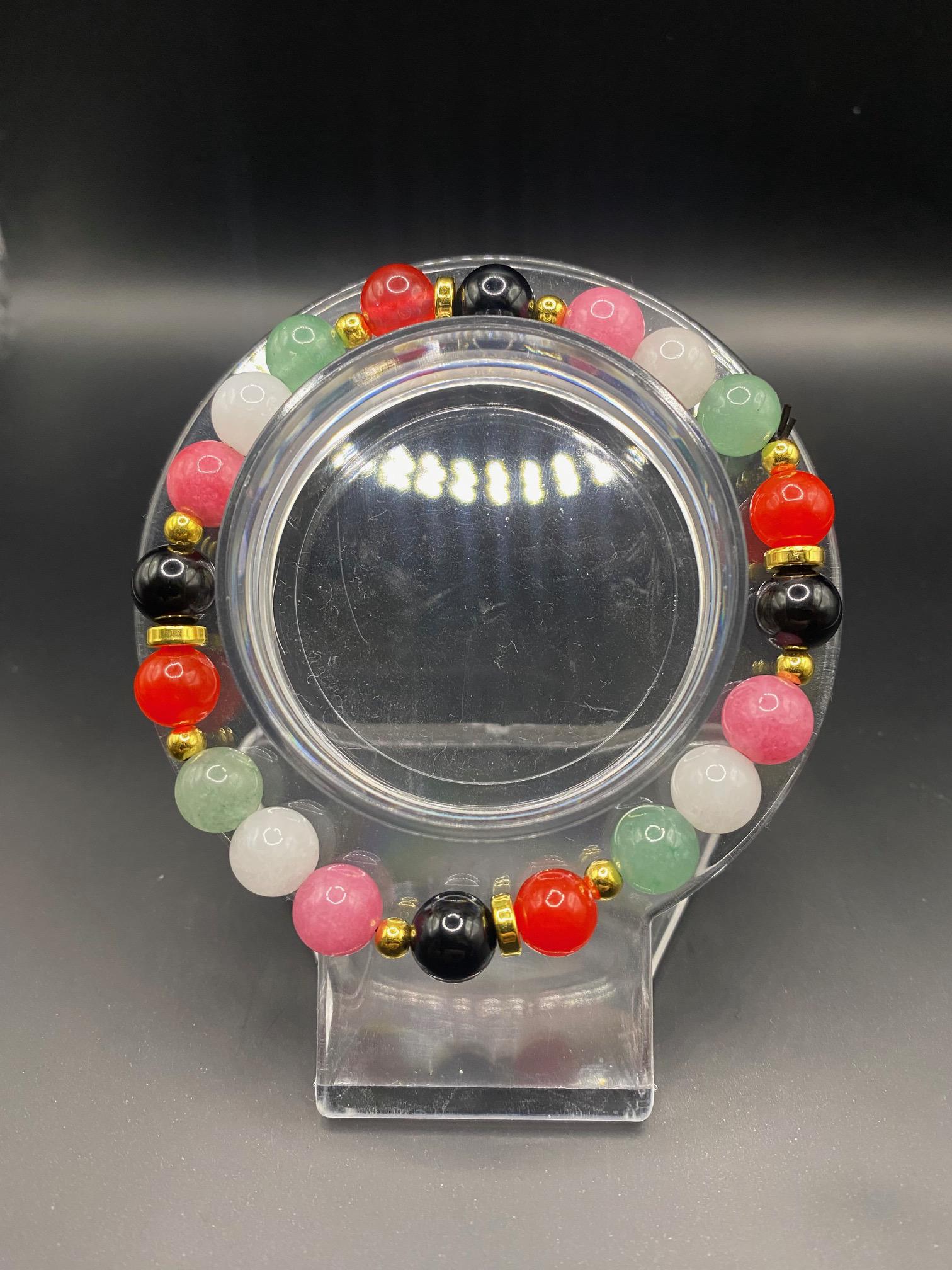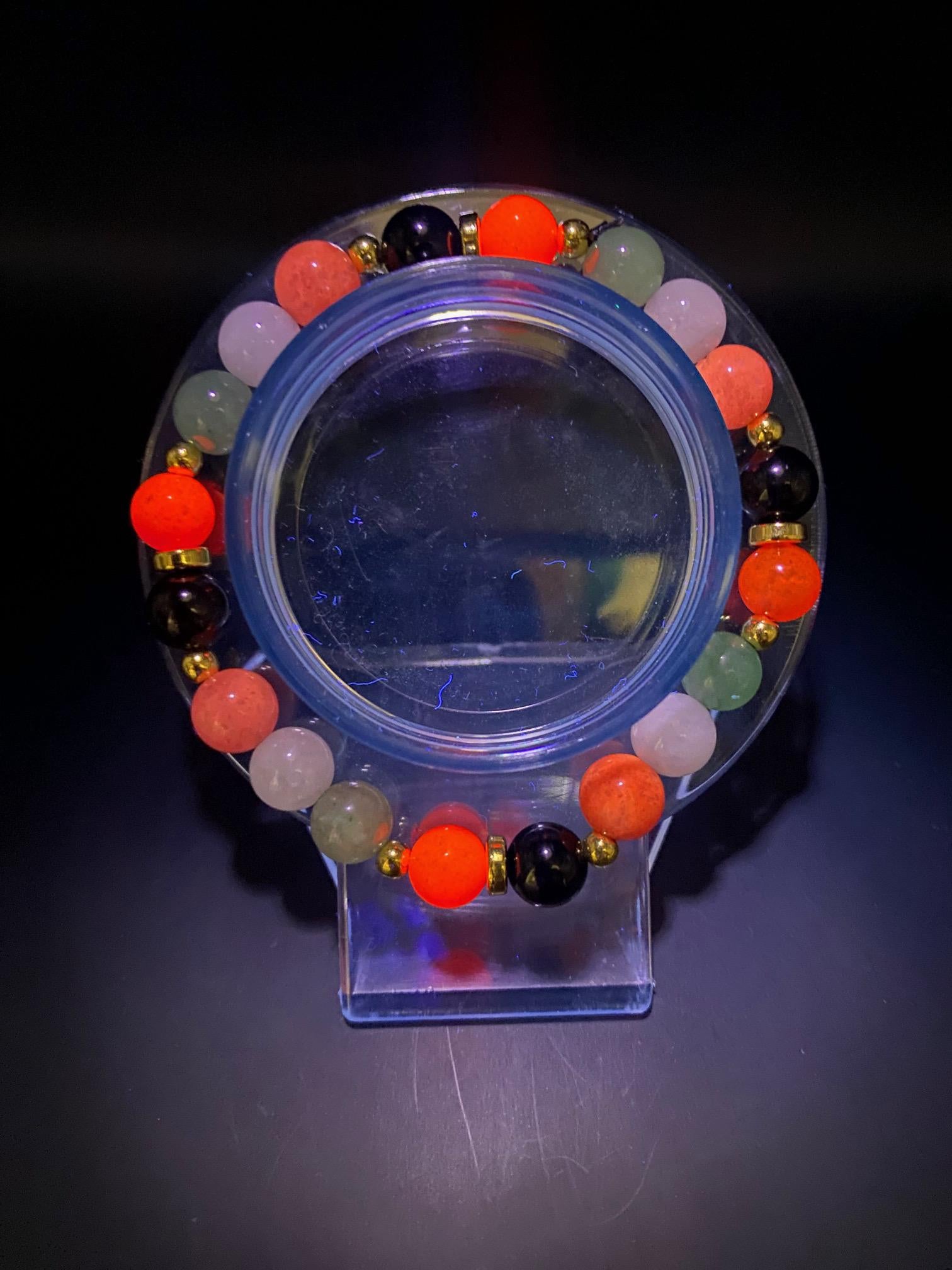 It's made with obsidian, white jade, red chalcedony (GLOWS under UV!), pink chalcedony and green aventurine beads and gold spacers <3
