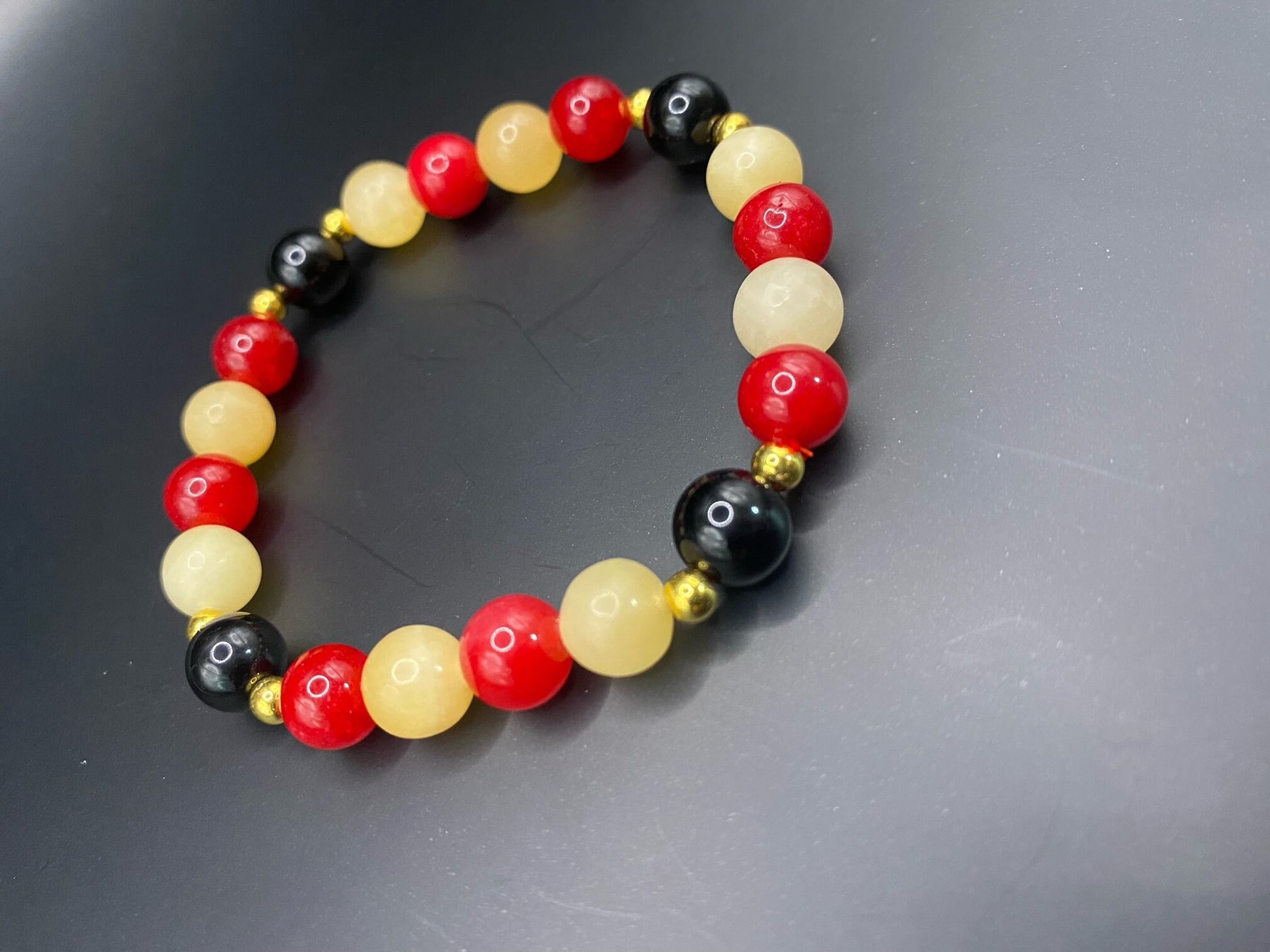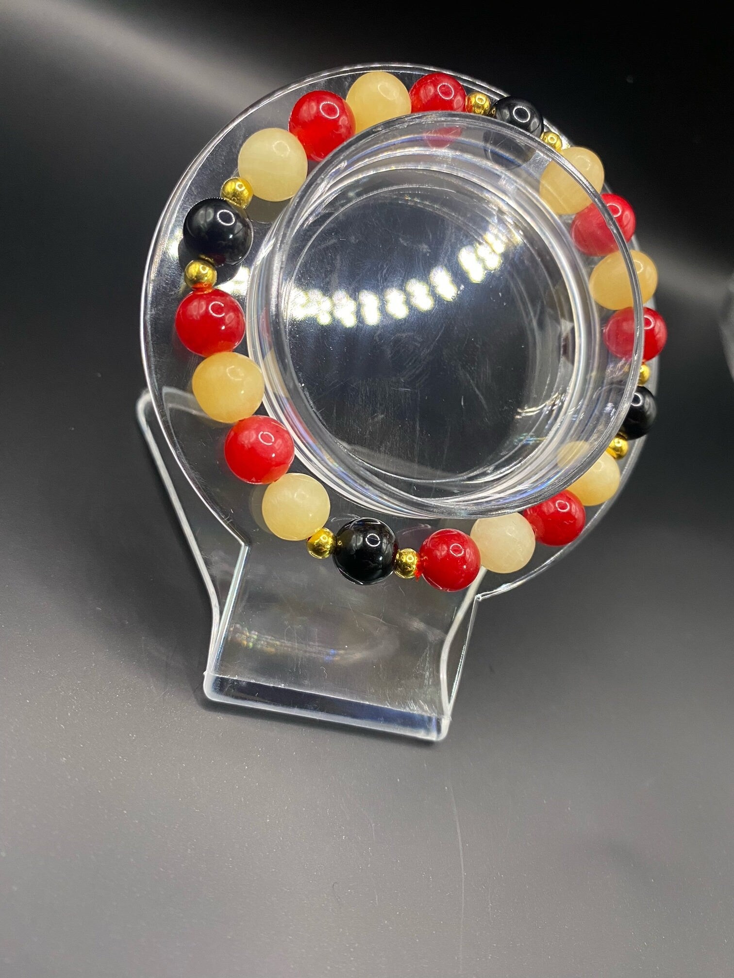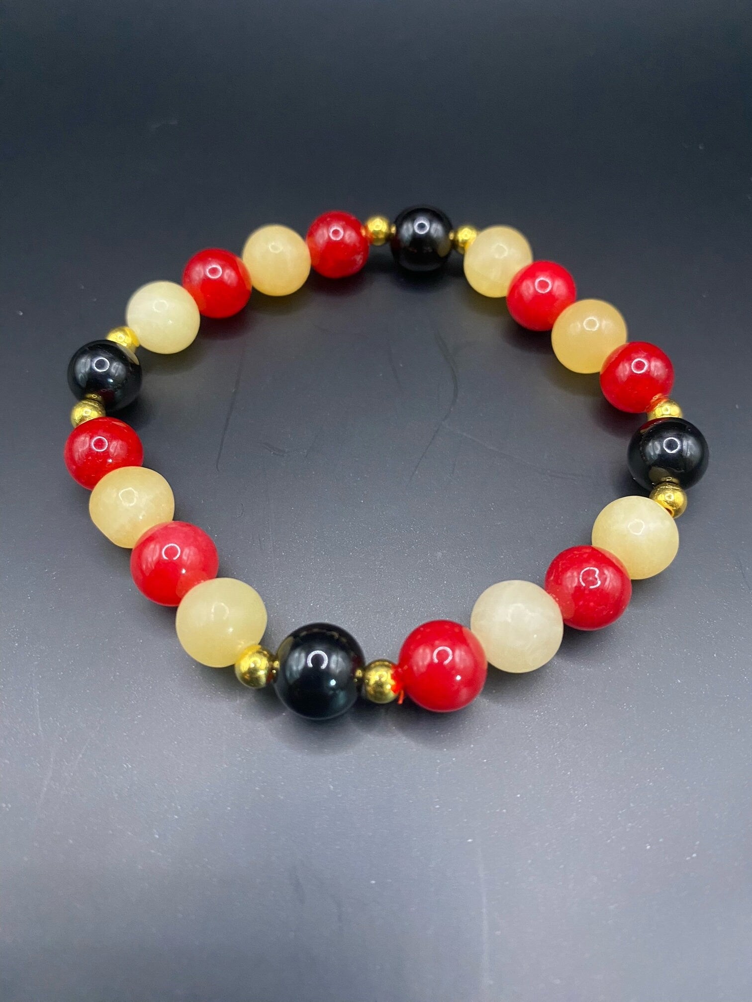 It's made with red coral jade, honey calcite and obsidian stone beads with gold colored spacers <3