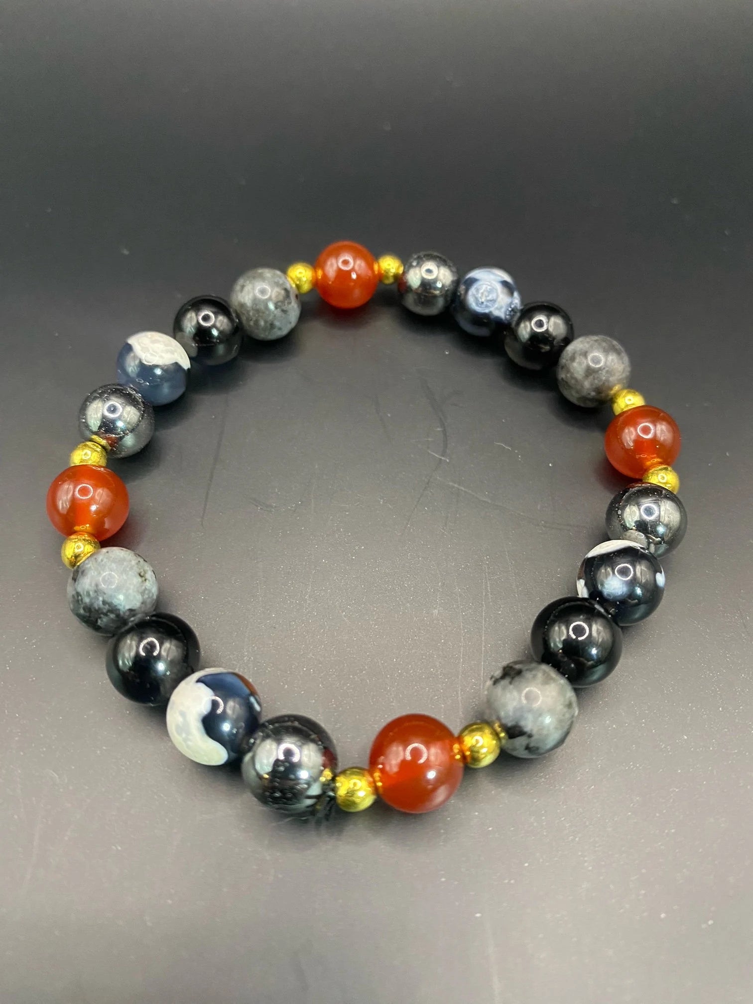 It's made with larvikite, obsidian, hematite, orca agate and carnelian stone beads with gold spacers <3