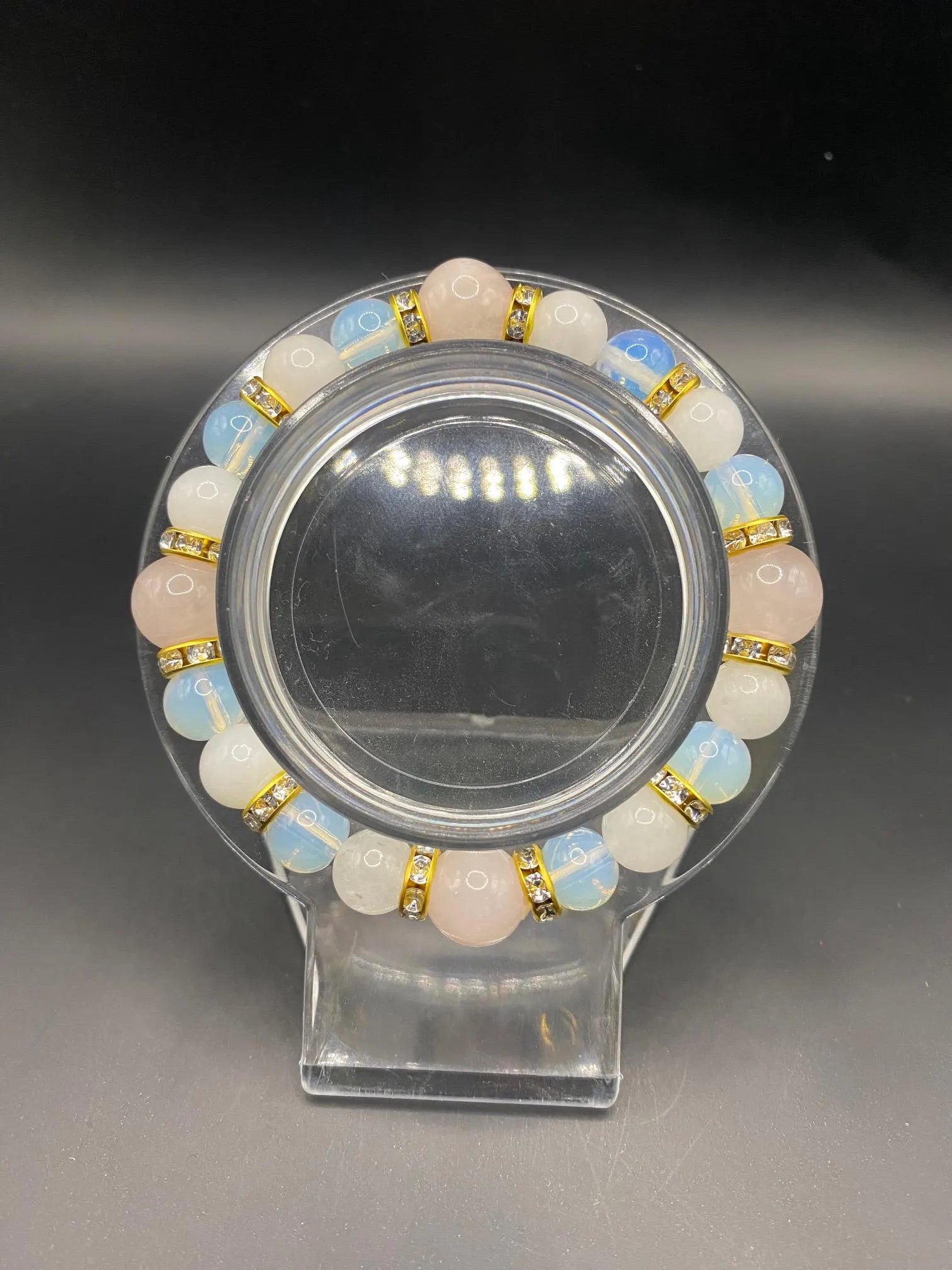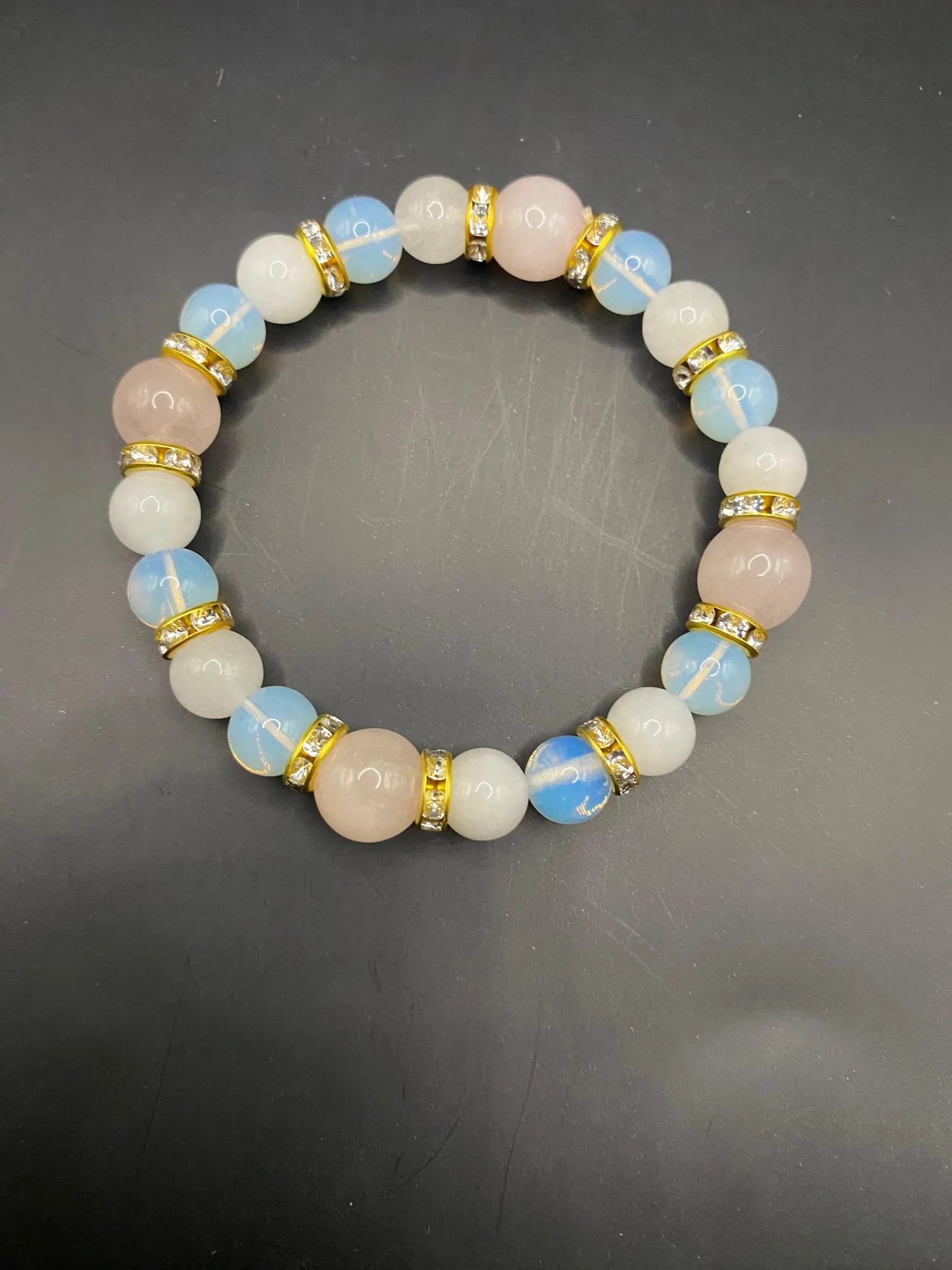 It's made with rose quartz, white jade and opalite beads with gold colored spacers <3