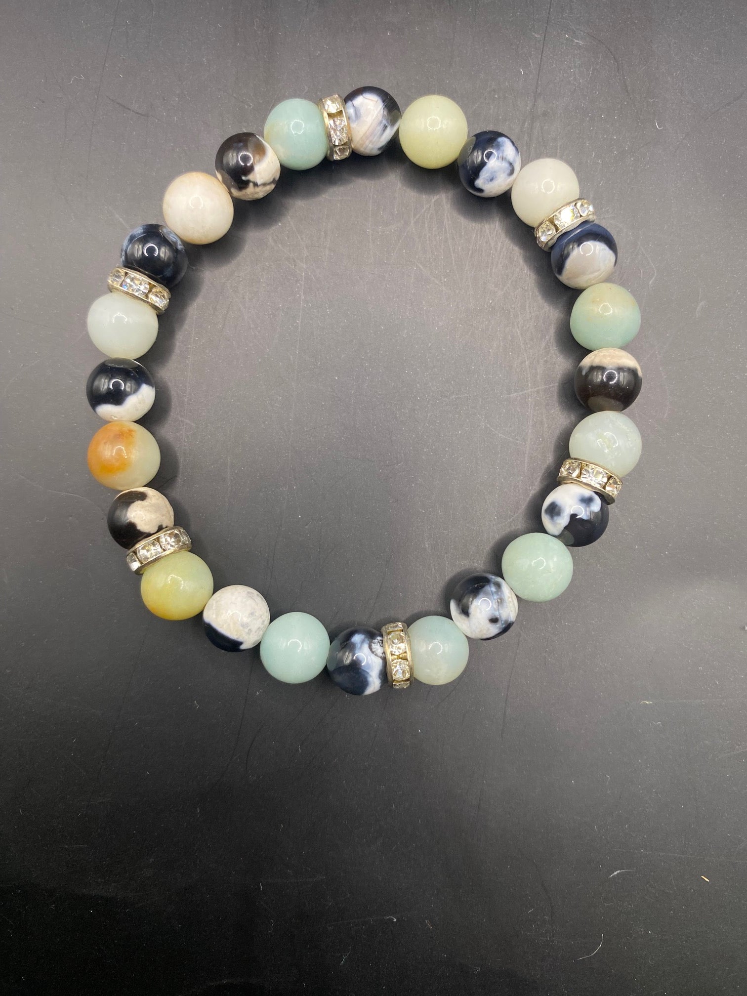 This piece is made using rainbow amazonite and orca agate with silver colored spacers <3