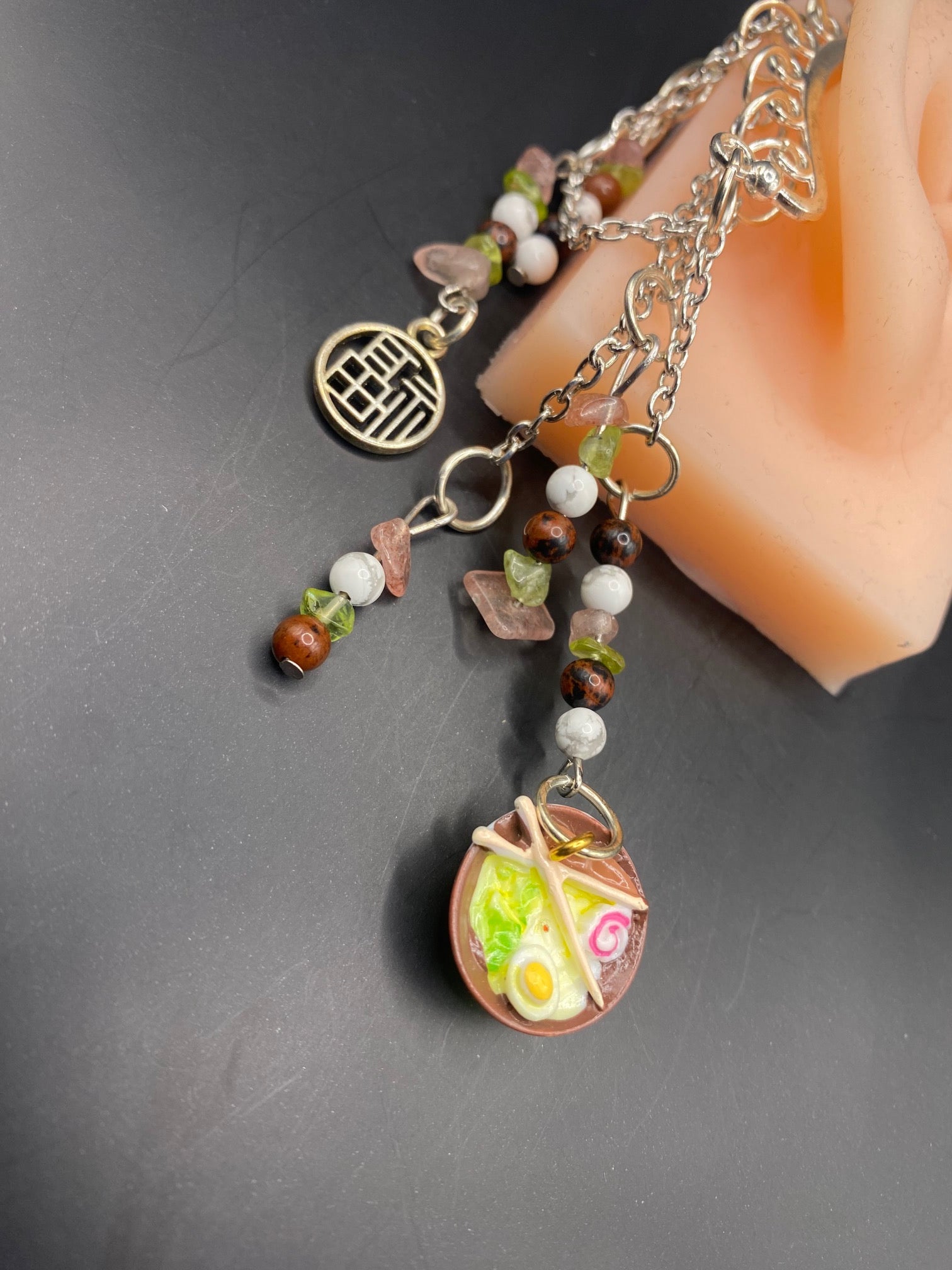 This piece is made with howlite, red snowflake obsidian, strawberry quartz and peridot with one metal charm and one resin charm <3