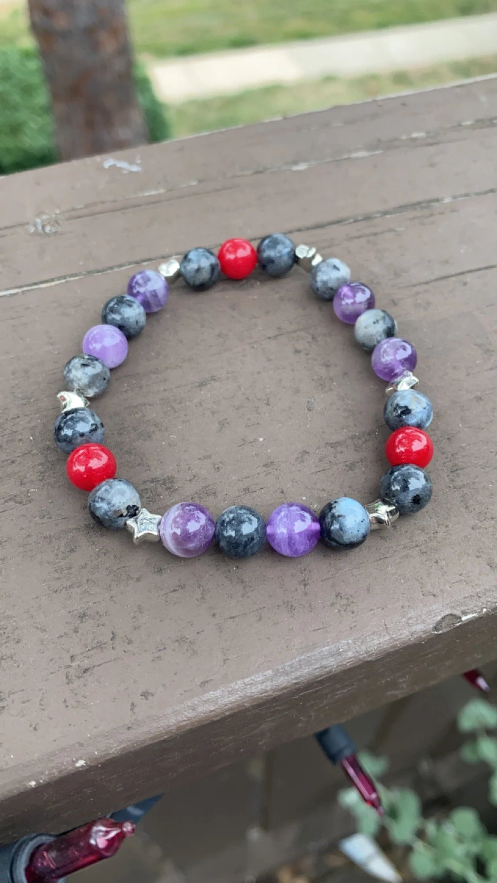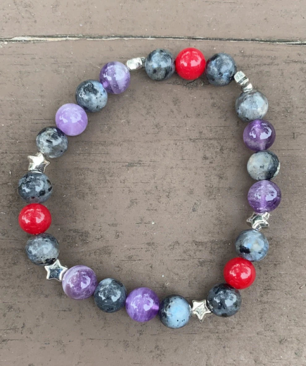 It's made with red coral, dream amethyst and larvikite beads with silver star shaped spacers