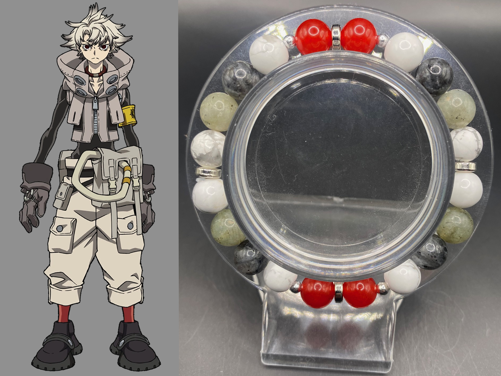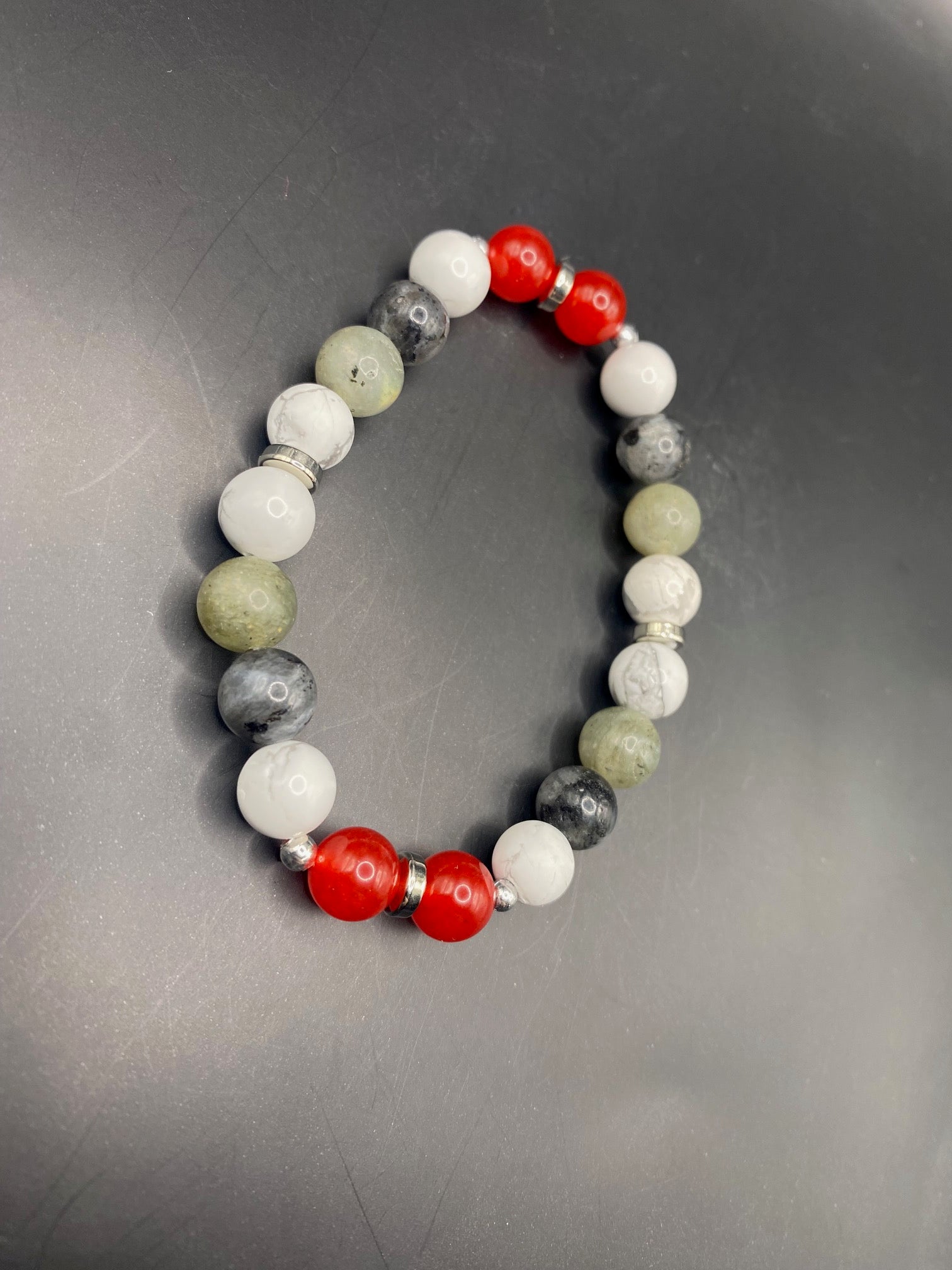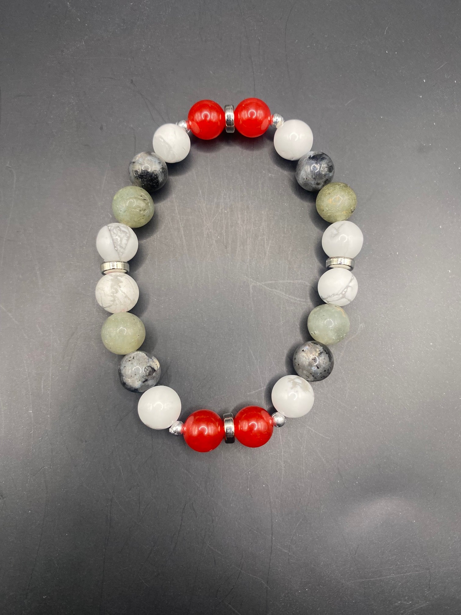 It's made with white jade, labradorite, larvikite and red coral jade stone beads with silver colored spacers <3