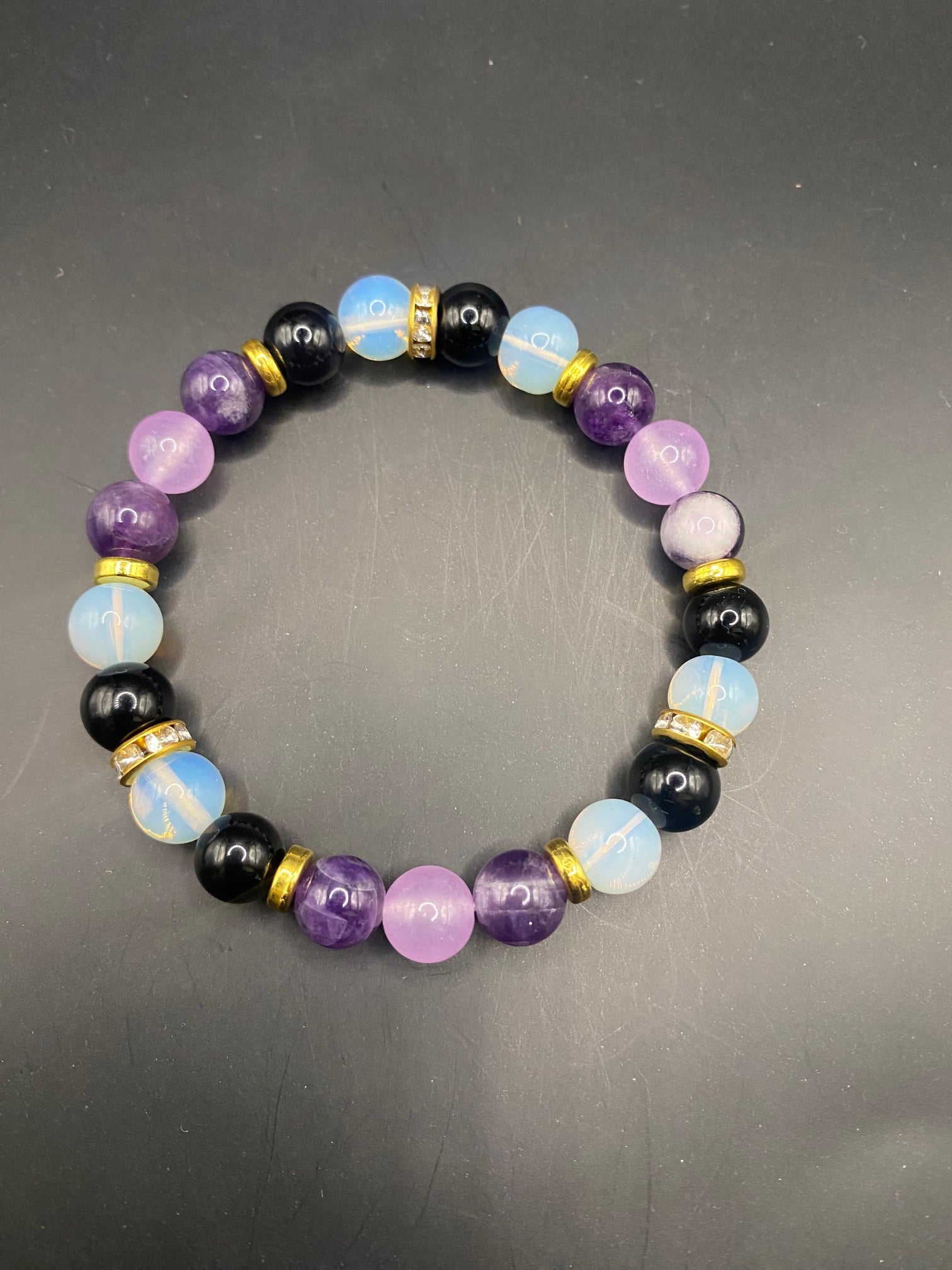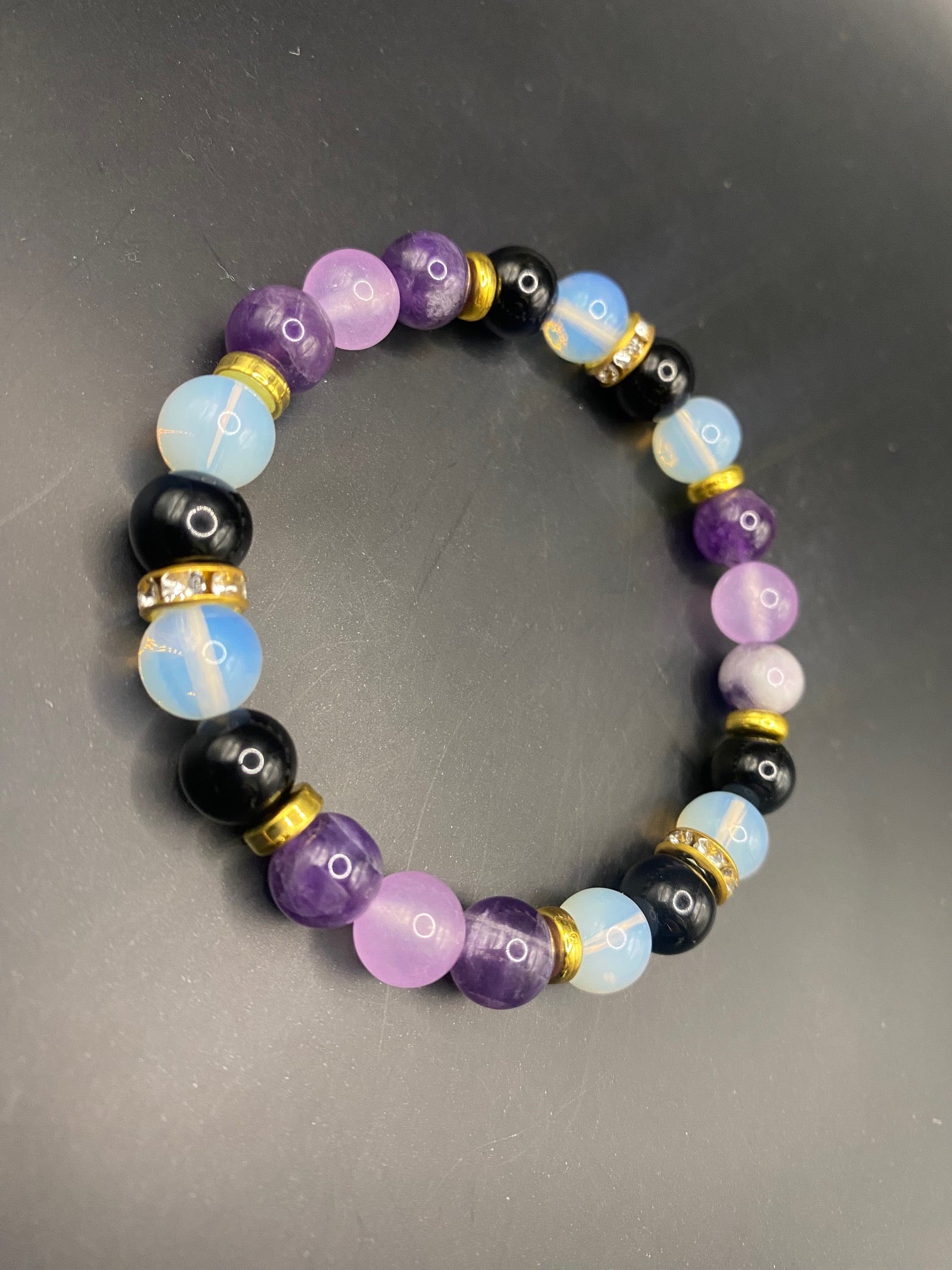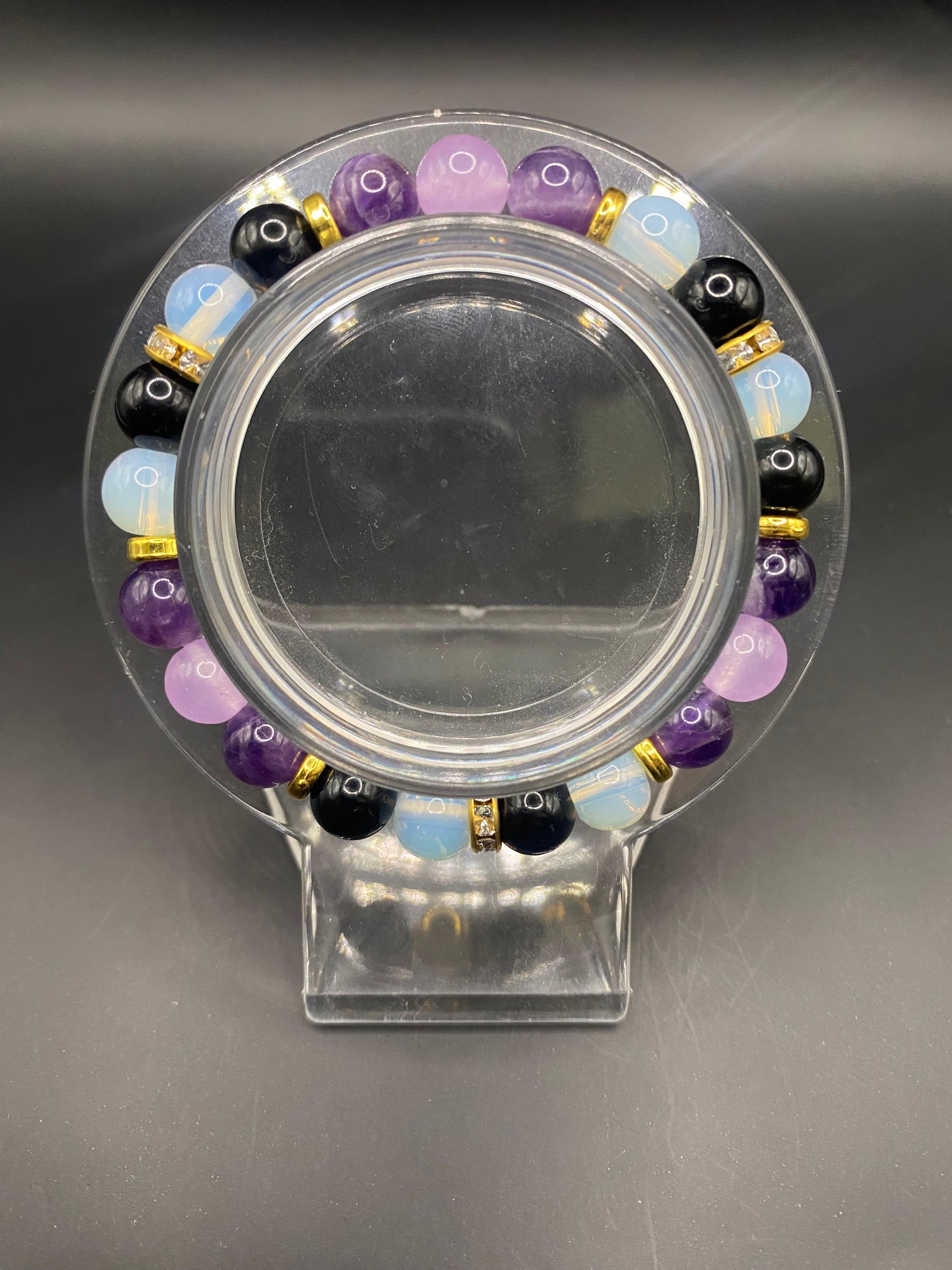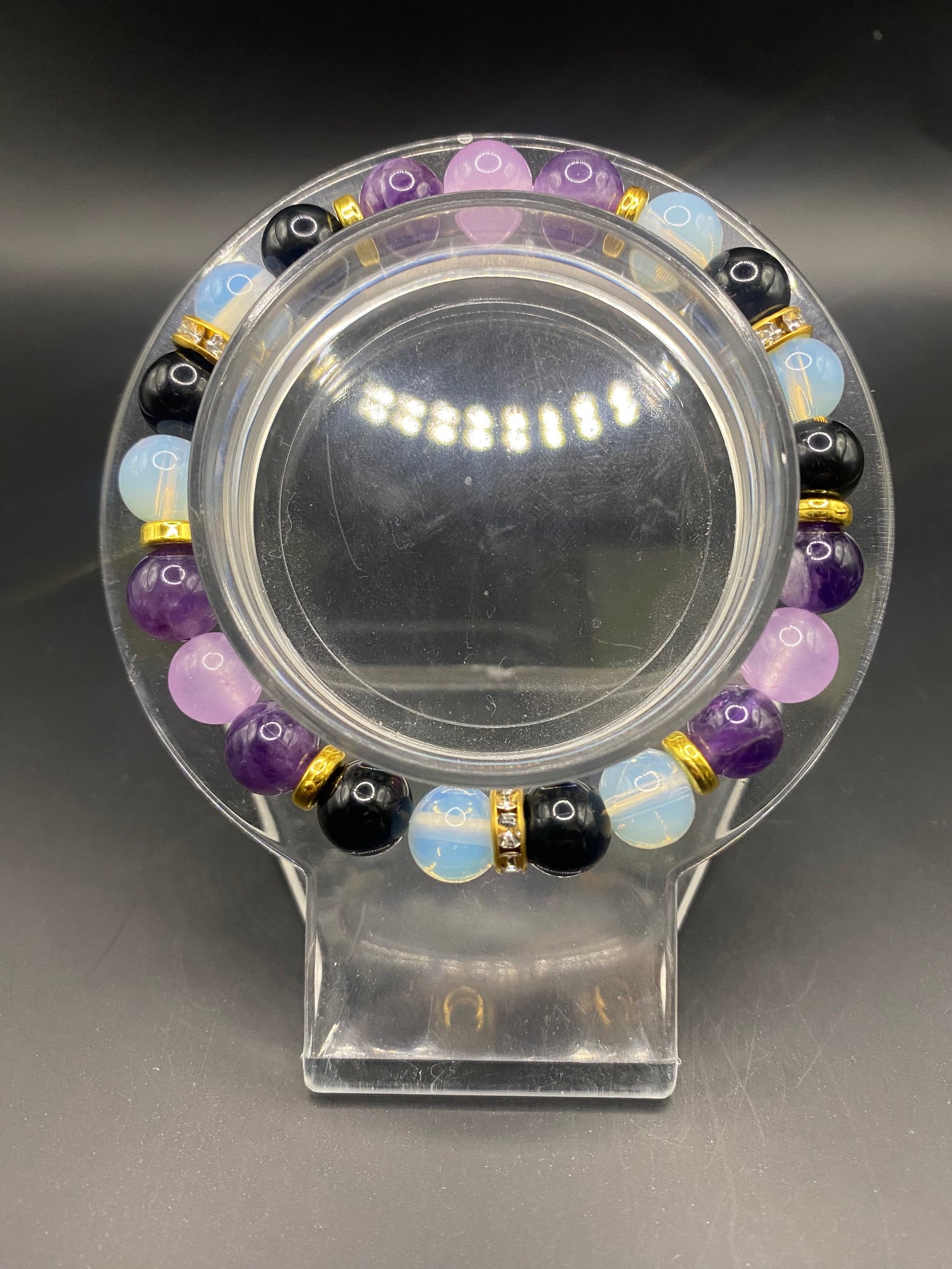 It's made with opalite, obsidian, lavender calcite and amethyst beads with gold colored spacers <3