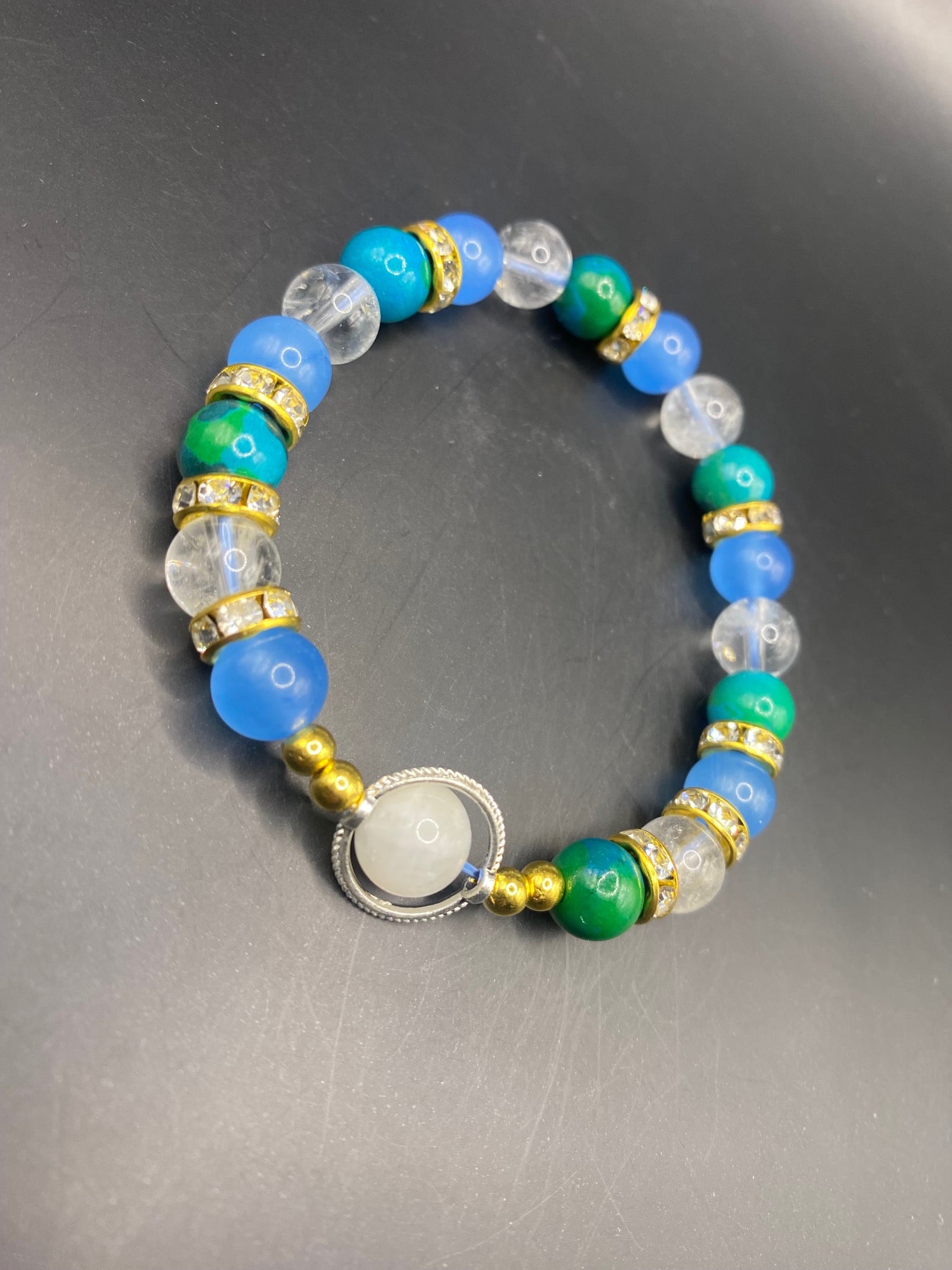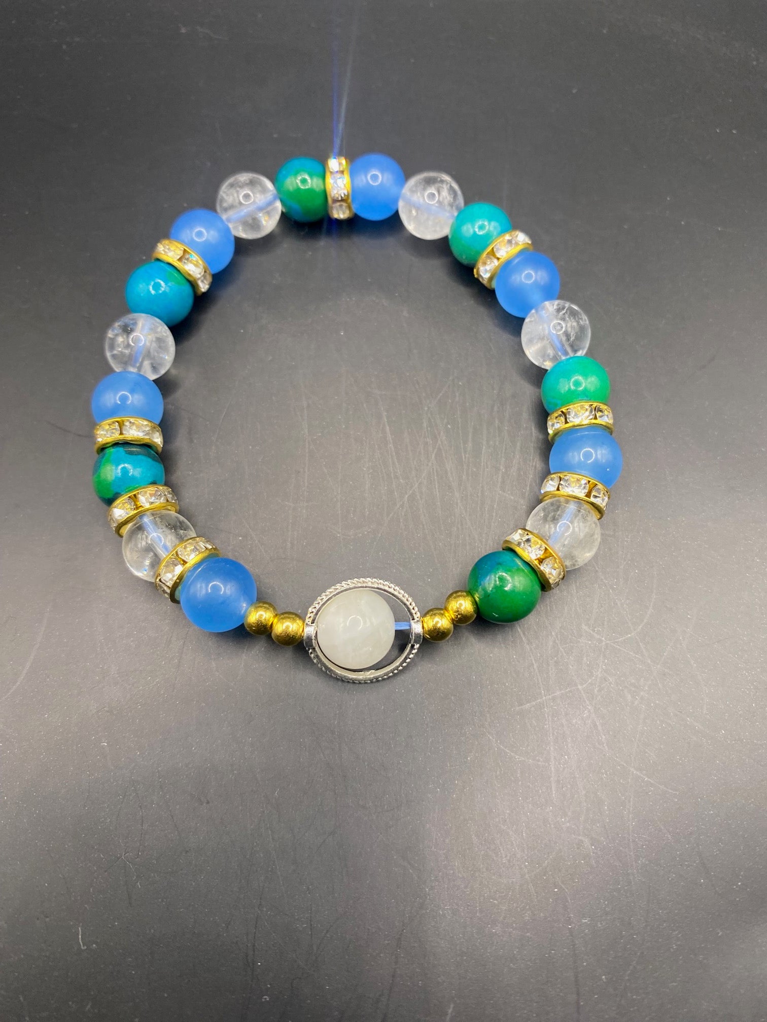It's made with clear quartz, peacock agate, blue chalcedony and a single moonstone with gold colored spacers and a silver ring <3