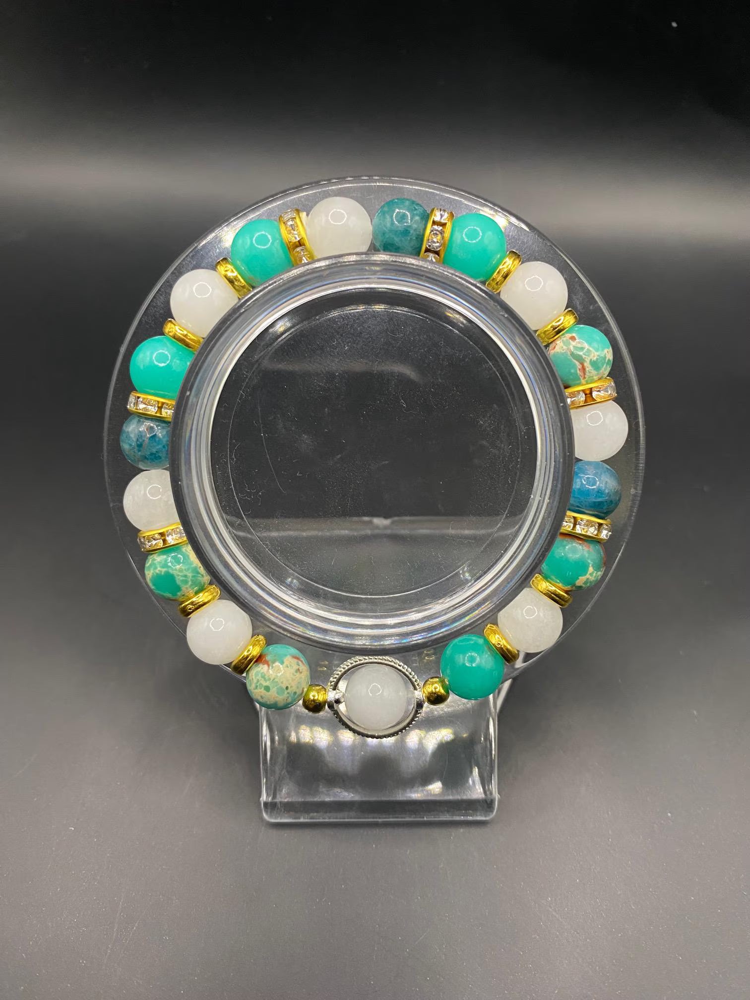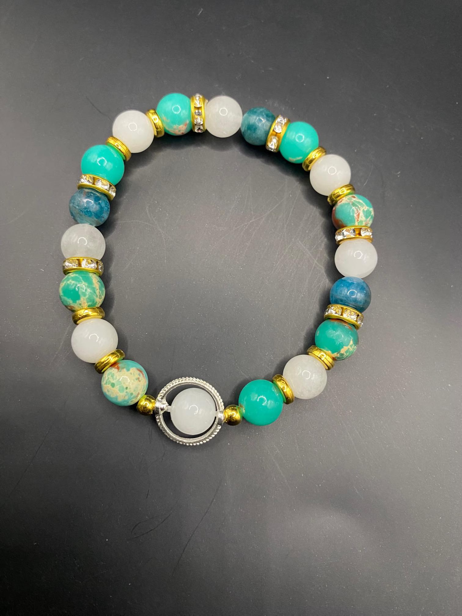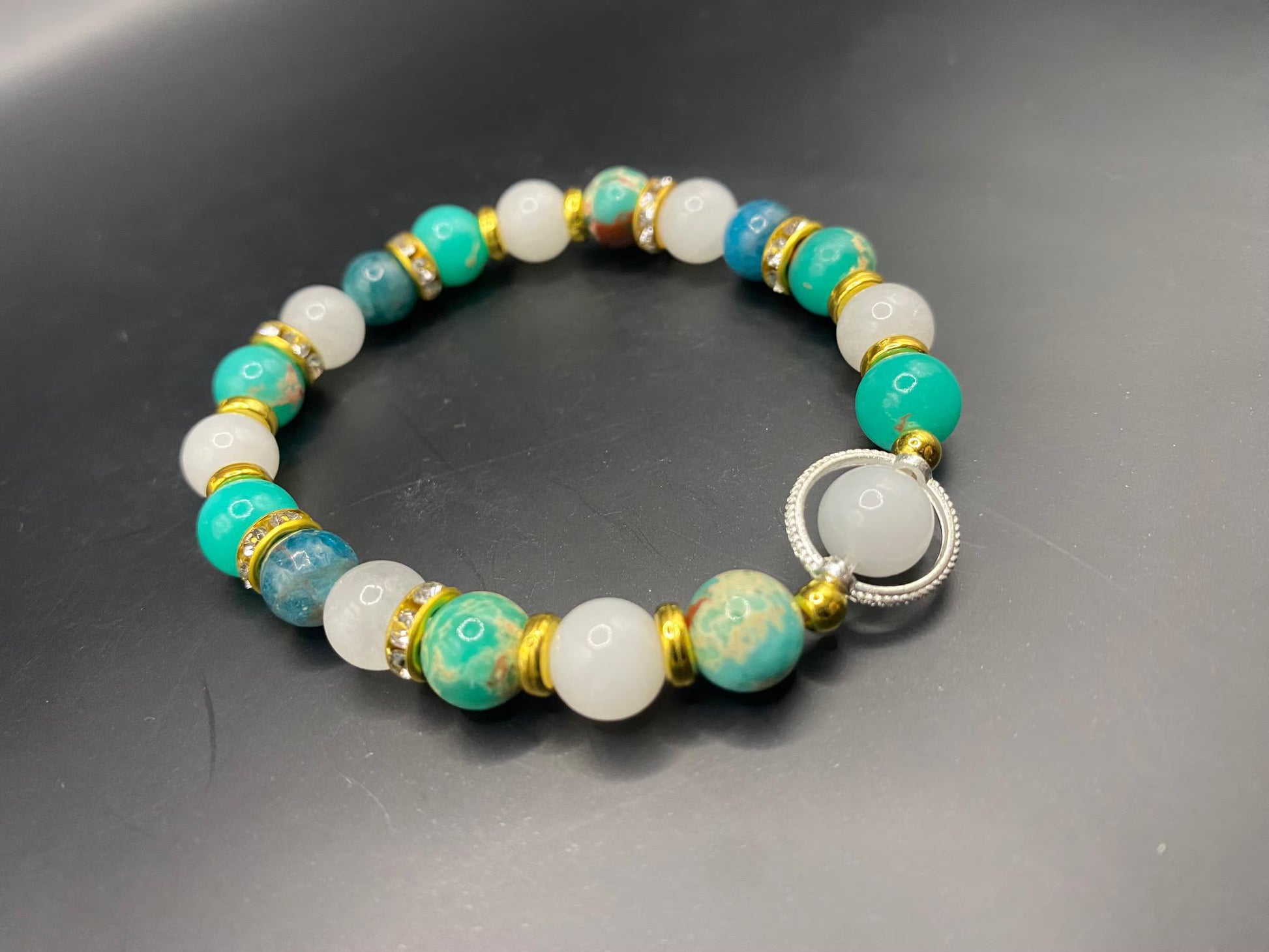 It's made with white jade, blue apatite and shoushan stone and a single moonstone with gold colored spacers and a silver ring <3