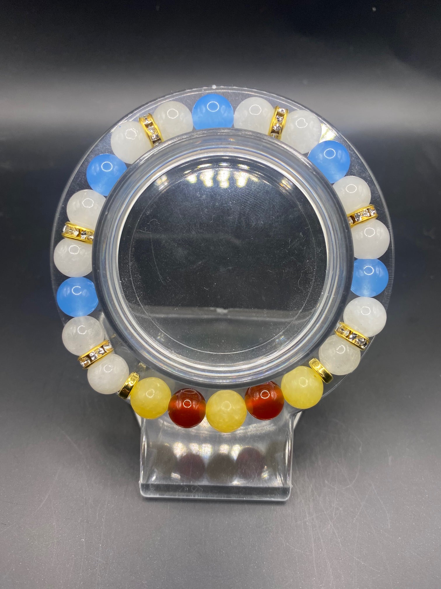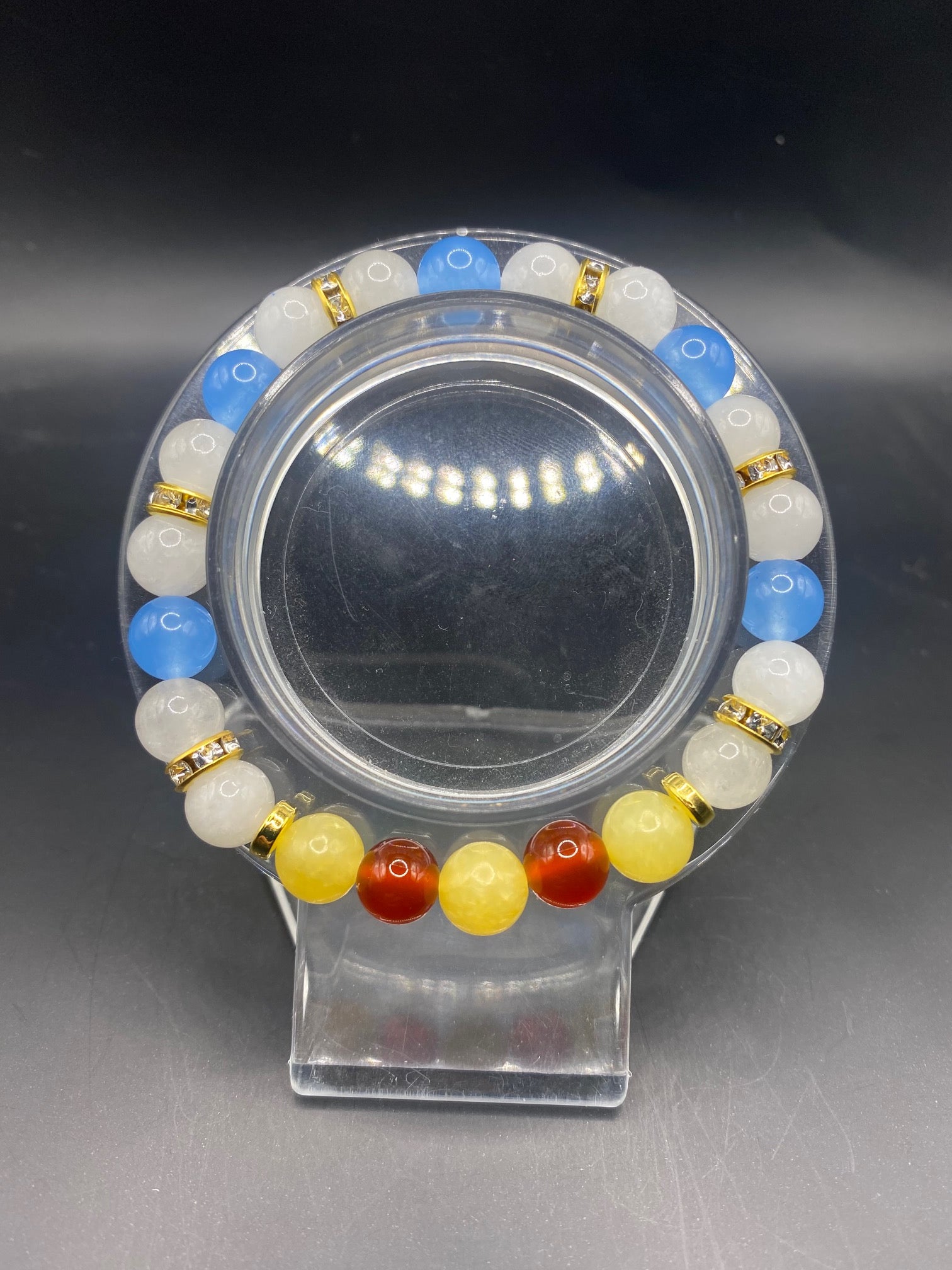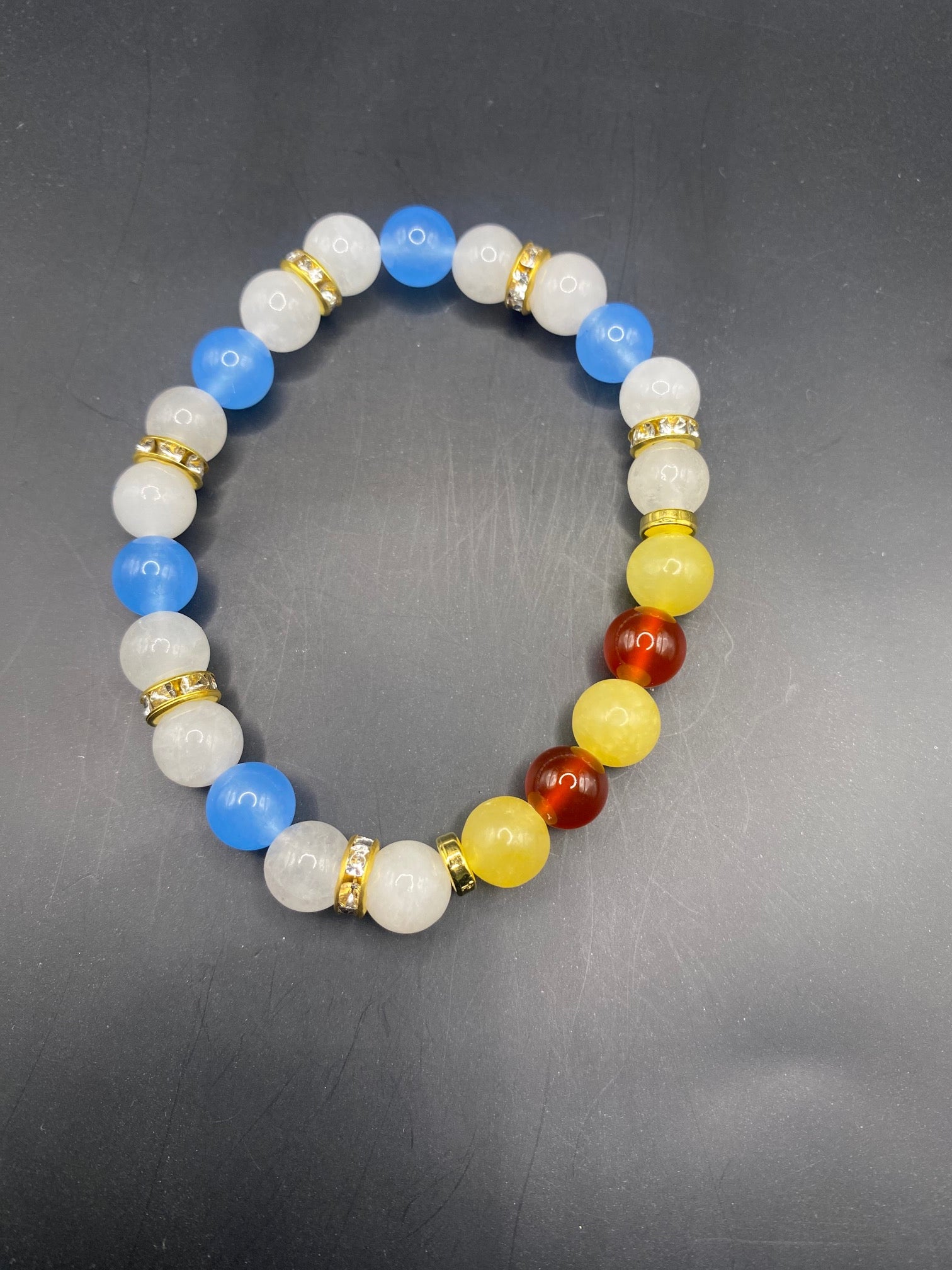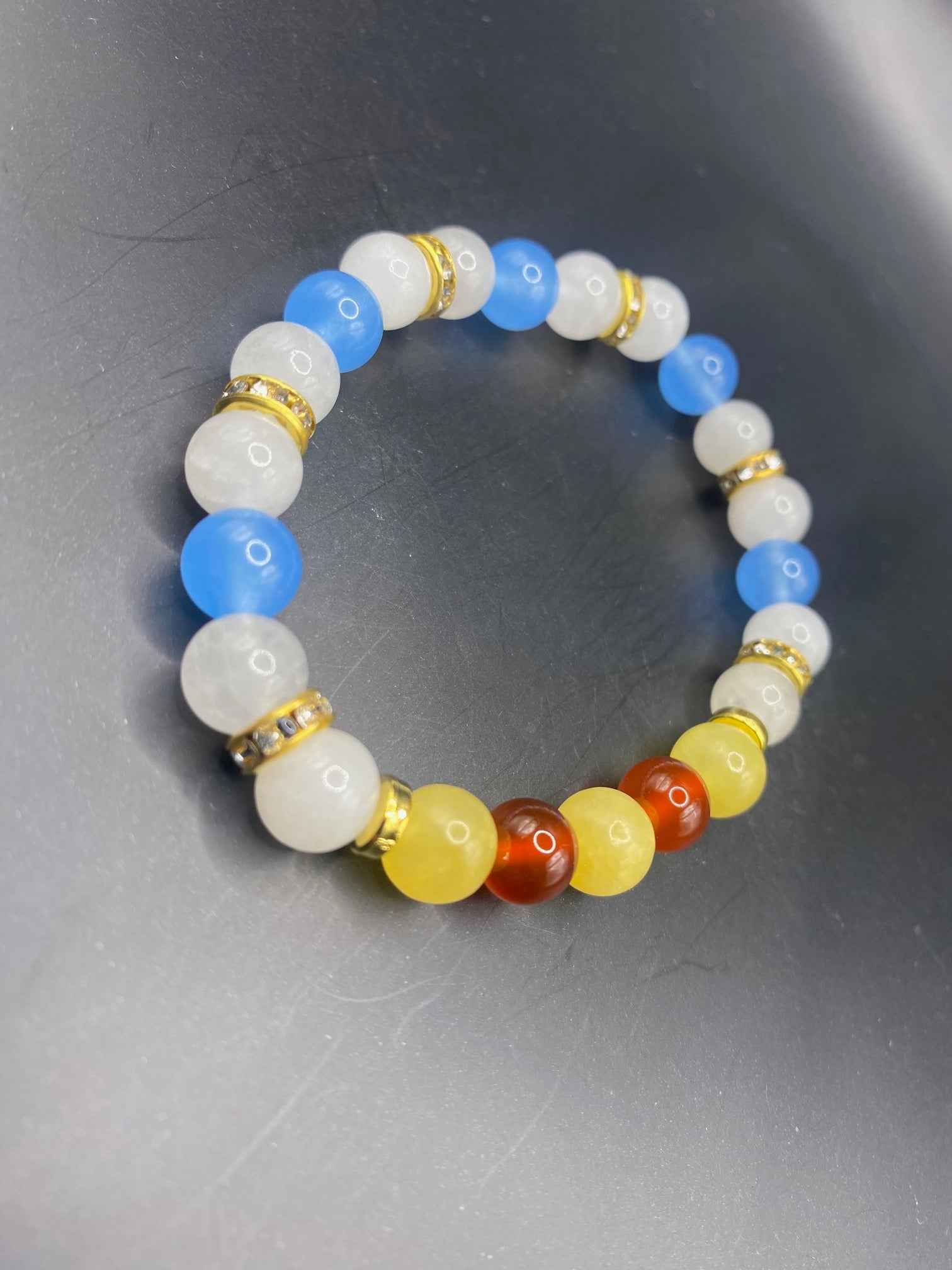 It's made with honey calcite, carnelian, white jade and blue chalcedony stone beads with gold colored spacers <3