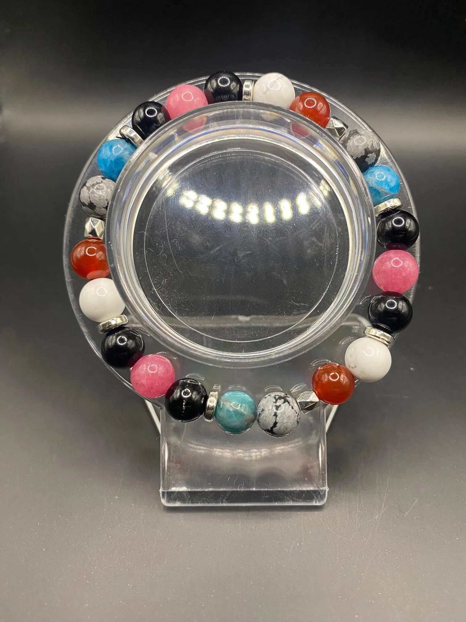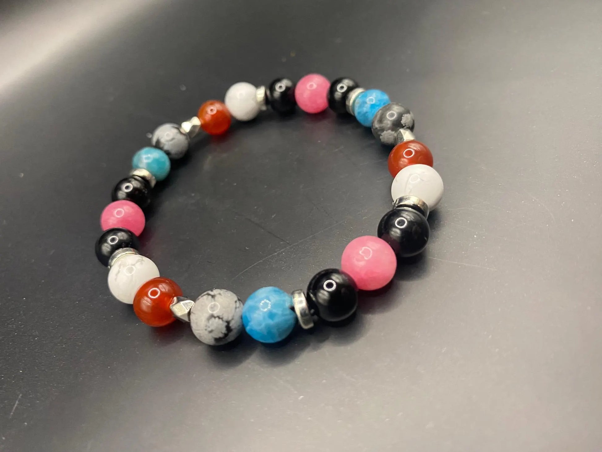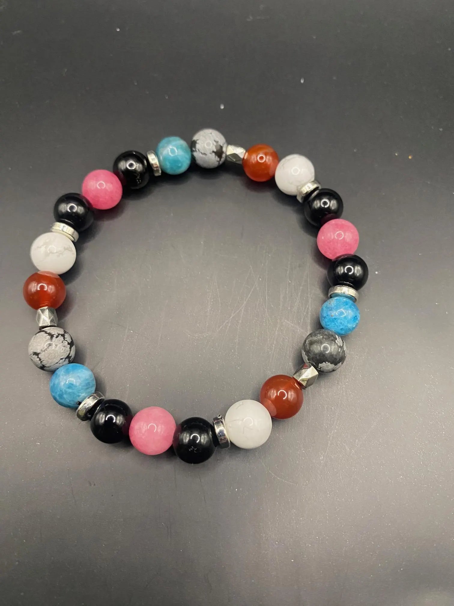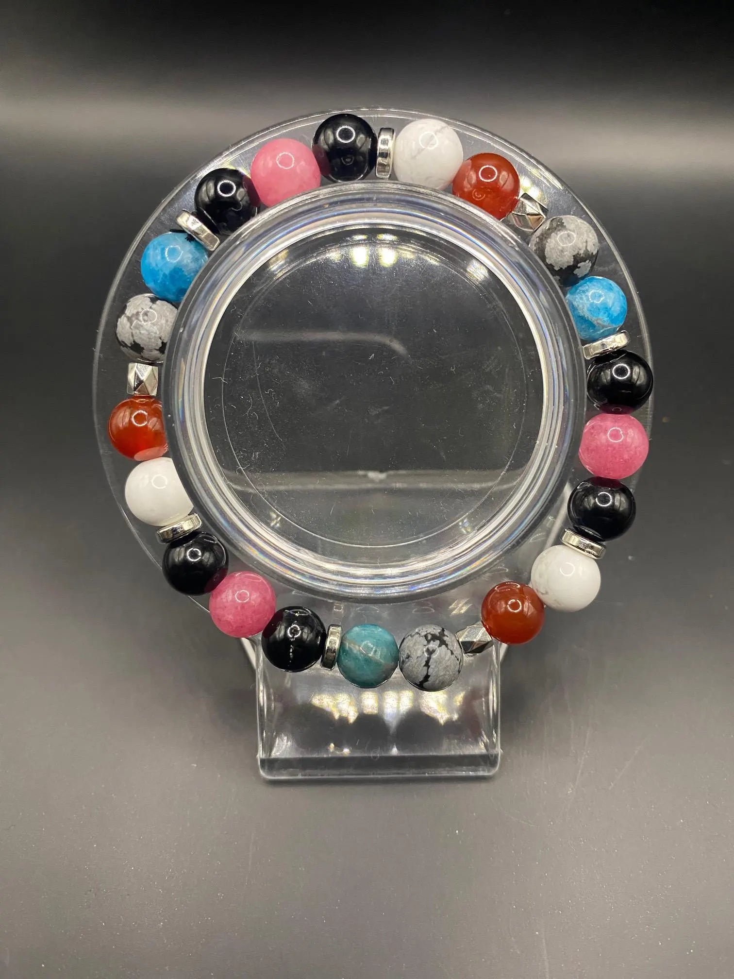 It's made with snowflake obsidian, howlite, carnelian, blue apatite and pink chalcedony stones with gold spacers <3