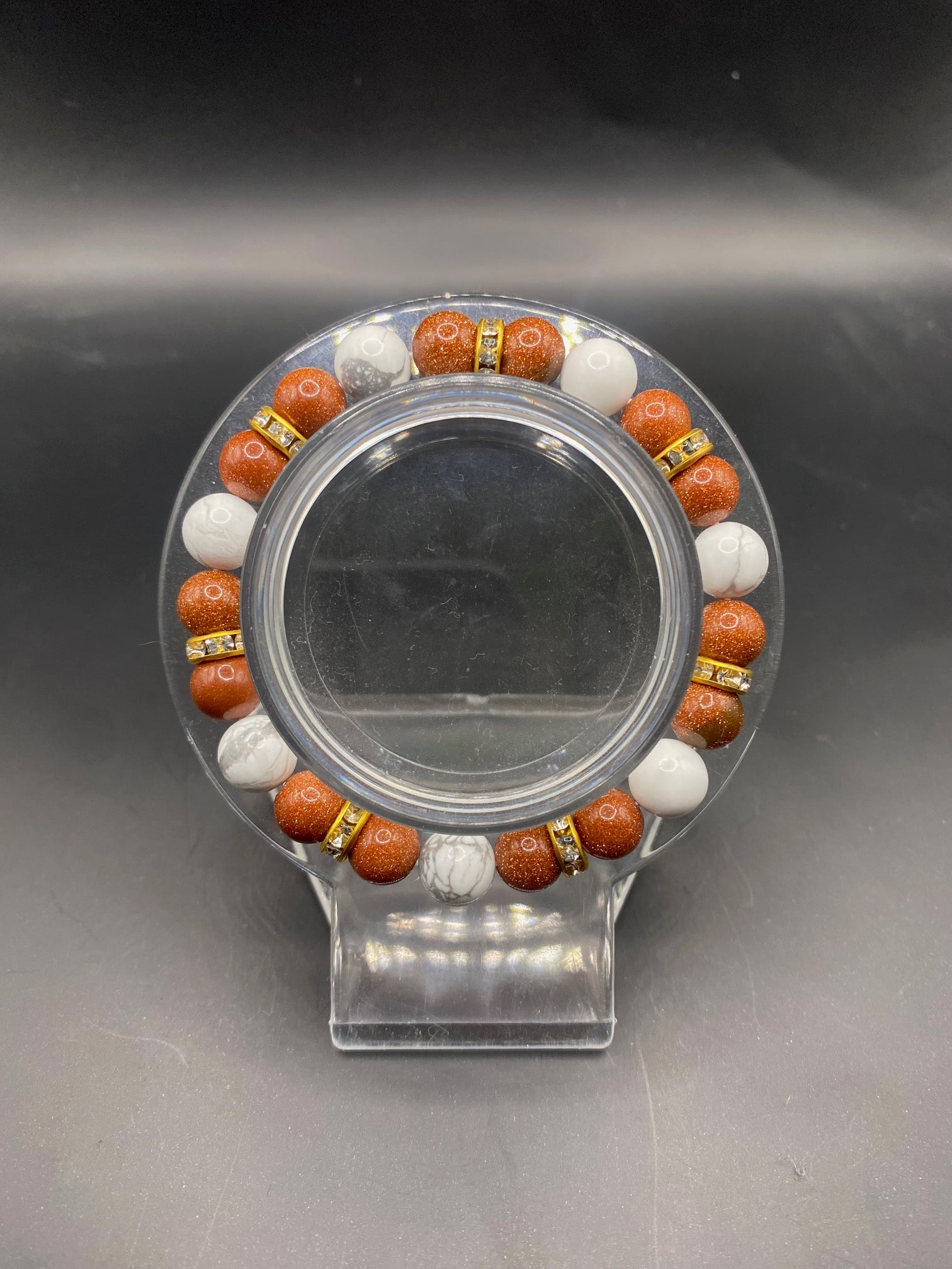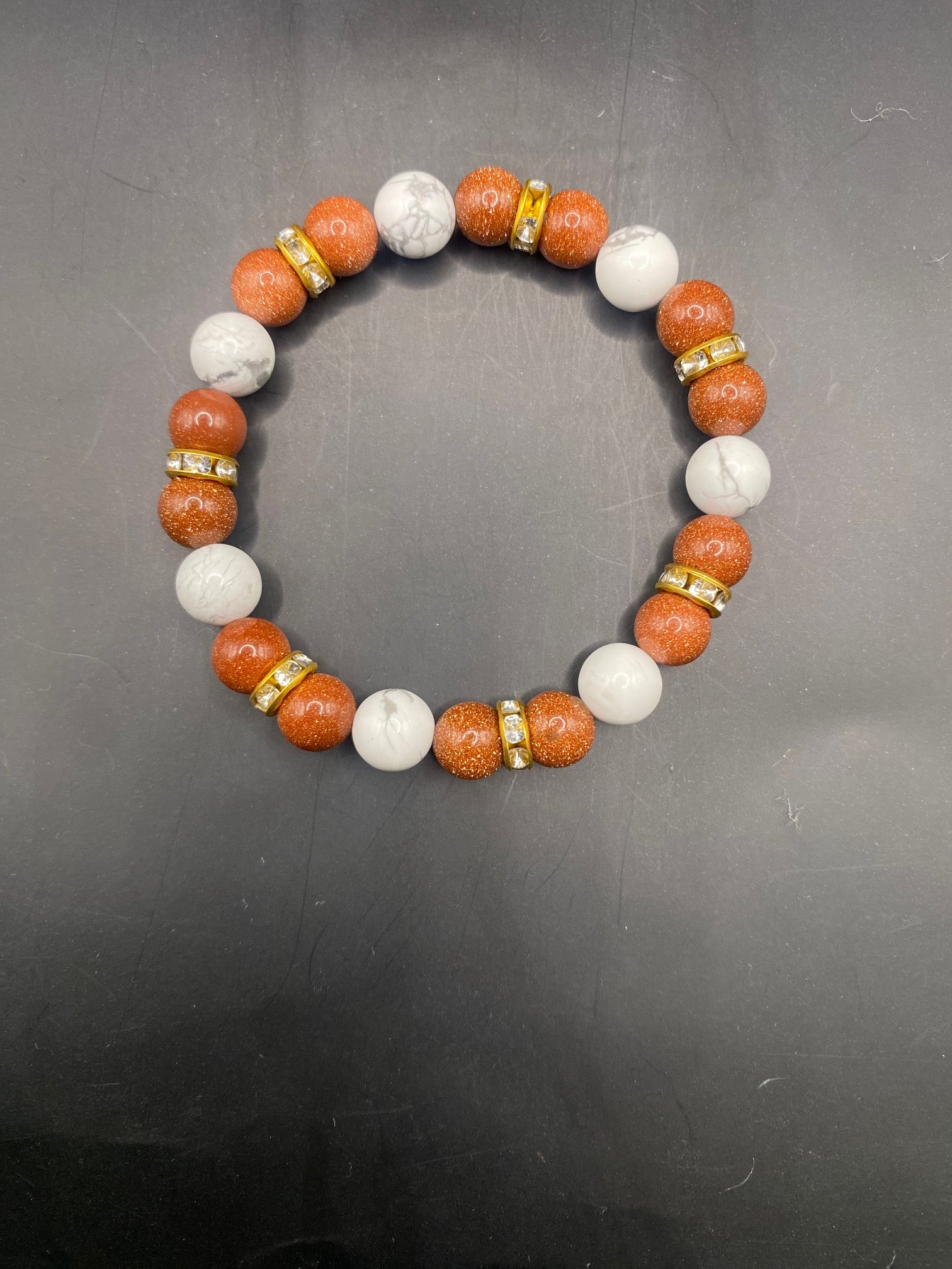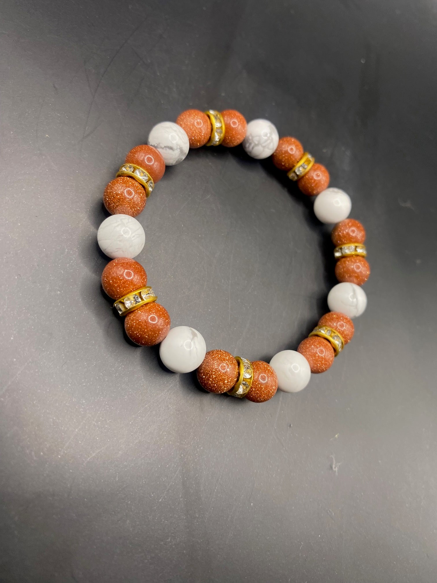 This piece is made using howlite and gold sandstone beads with gold spacers <3