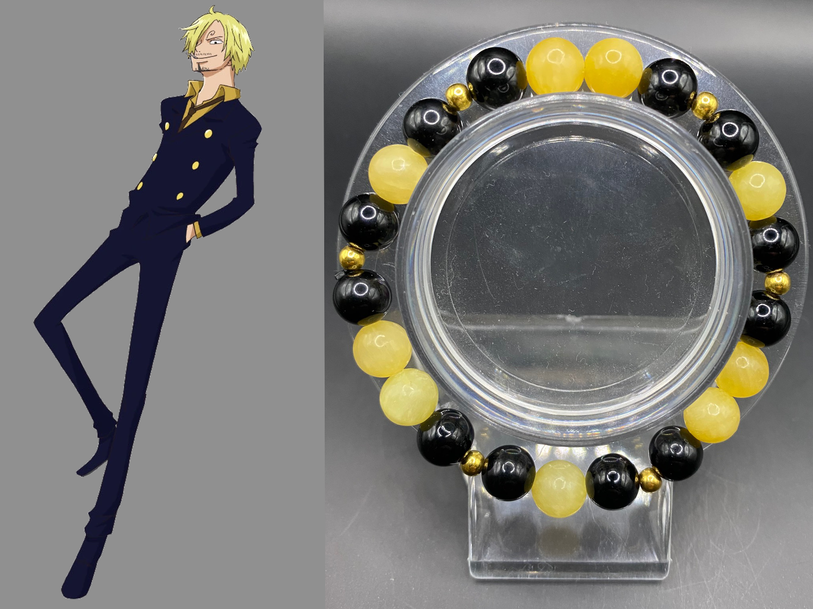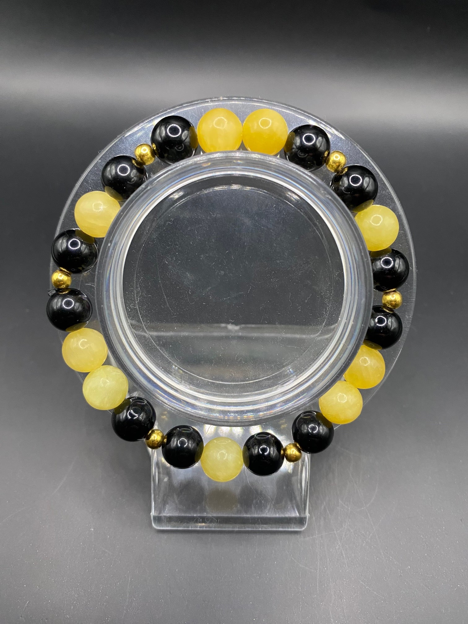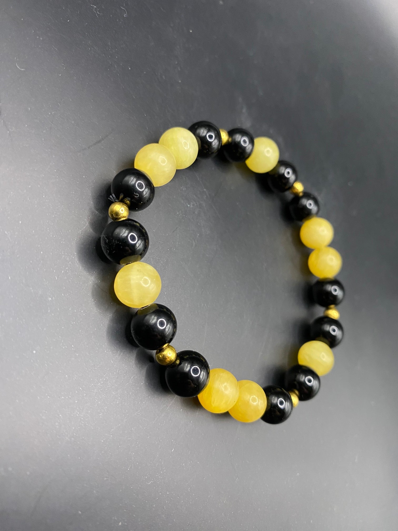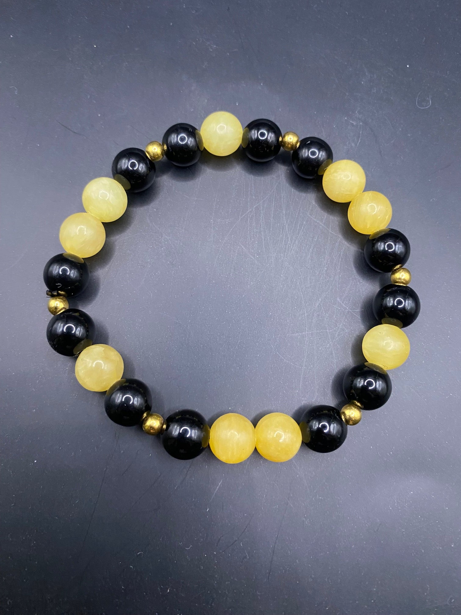 It's made with obsidian honey calcite beads with gold colored spacers <3
