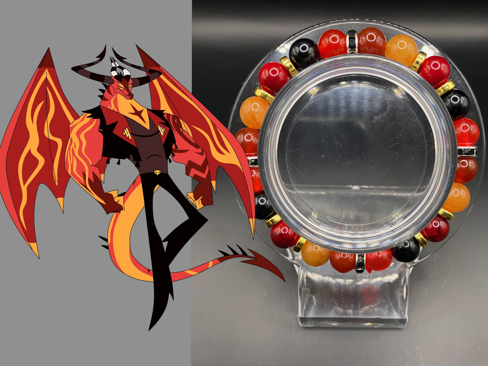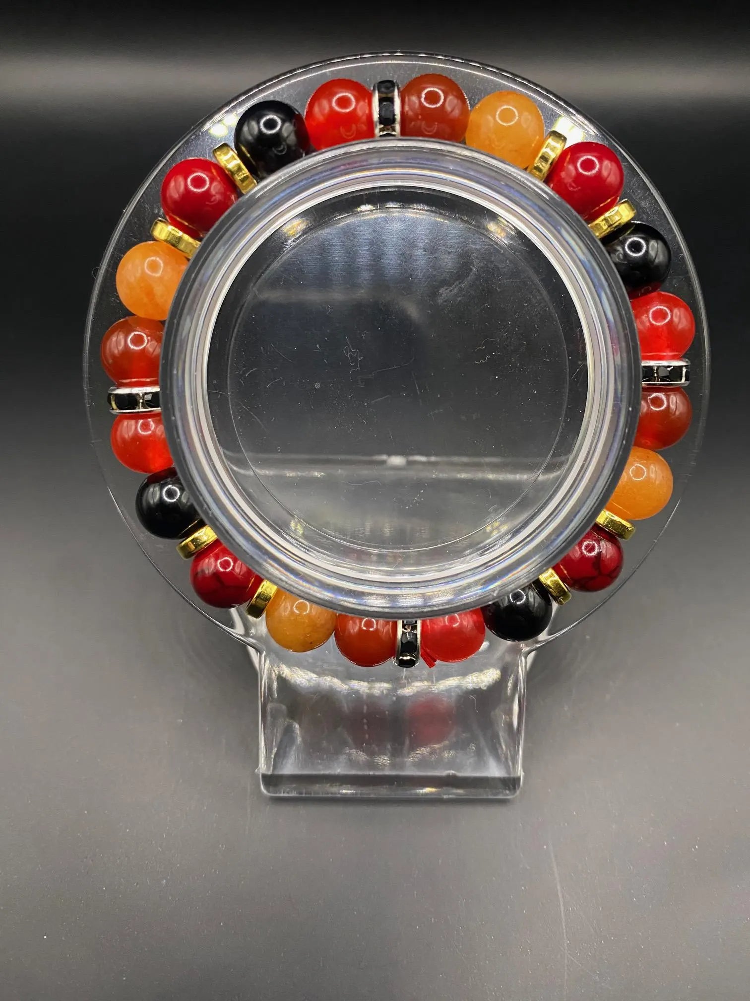 It's made with red coral jade, obsidian, carnelian, red quartz (dyed) and red aventurine beads and gold spacers <3
