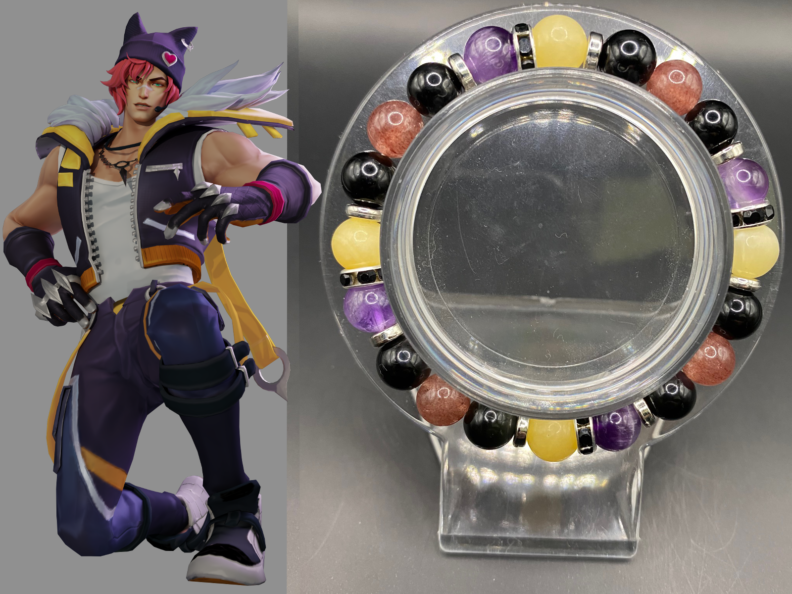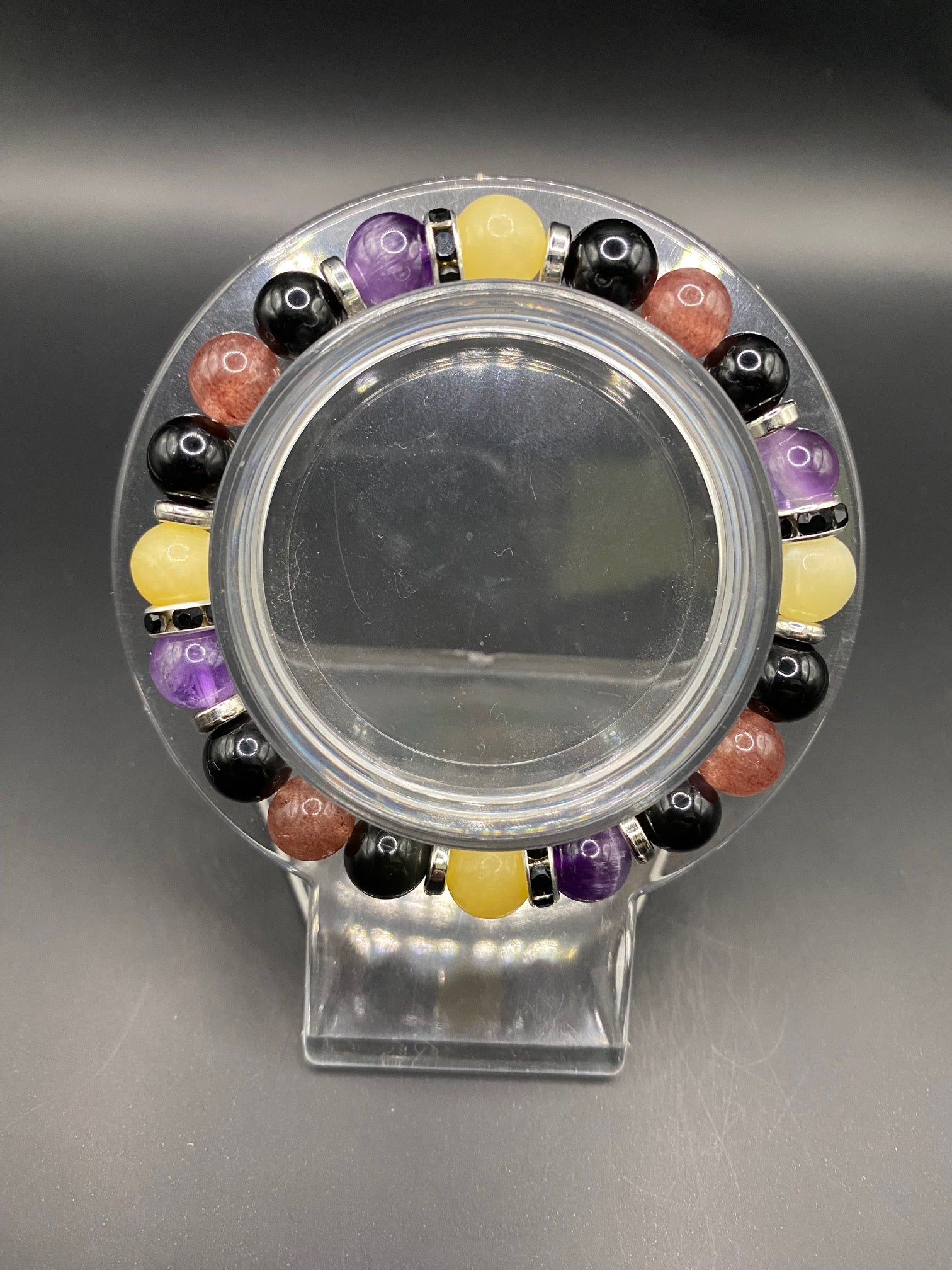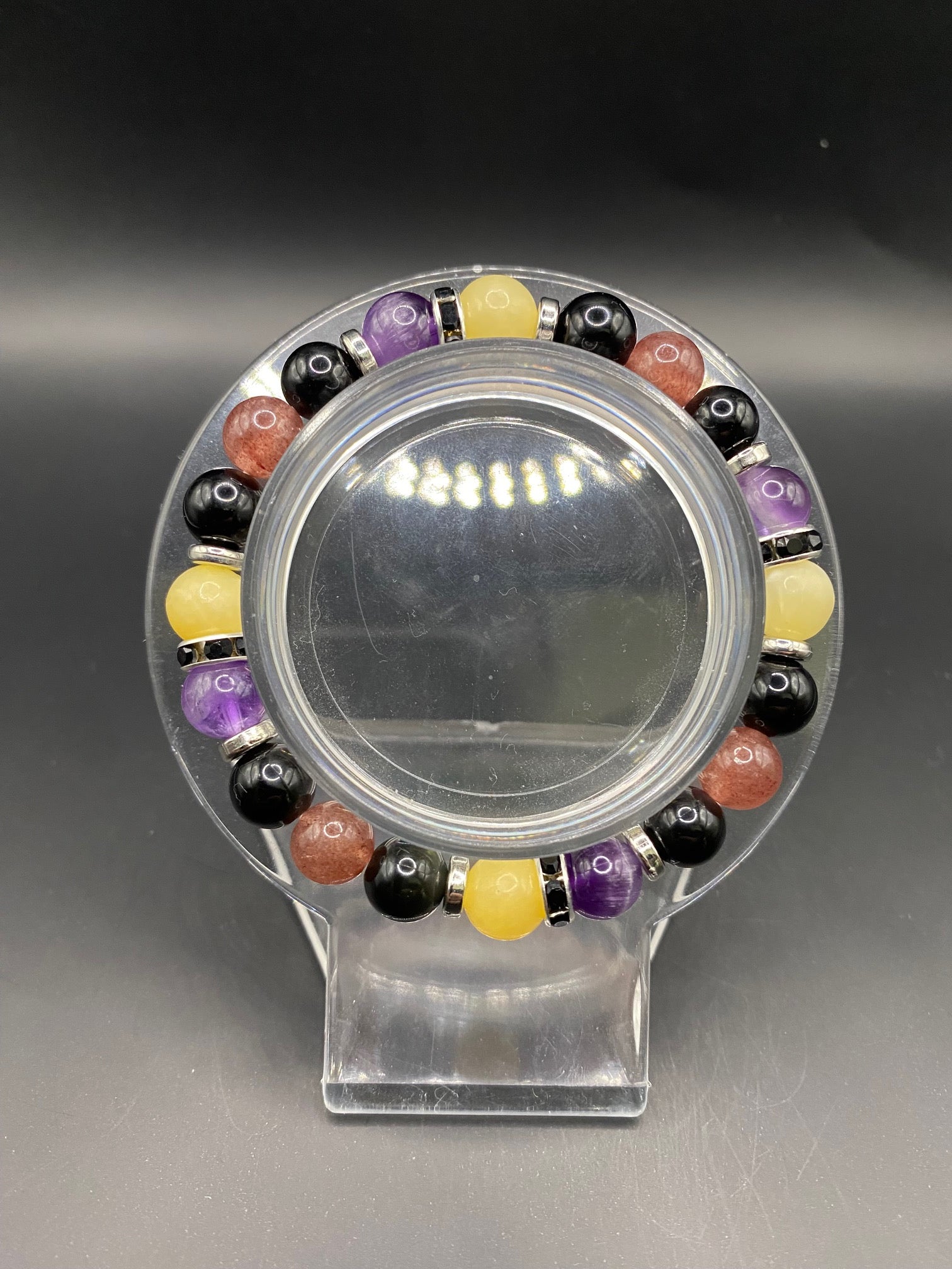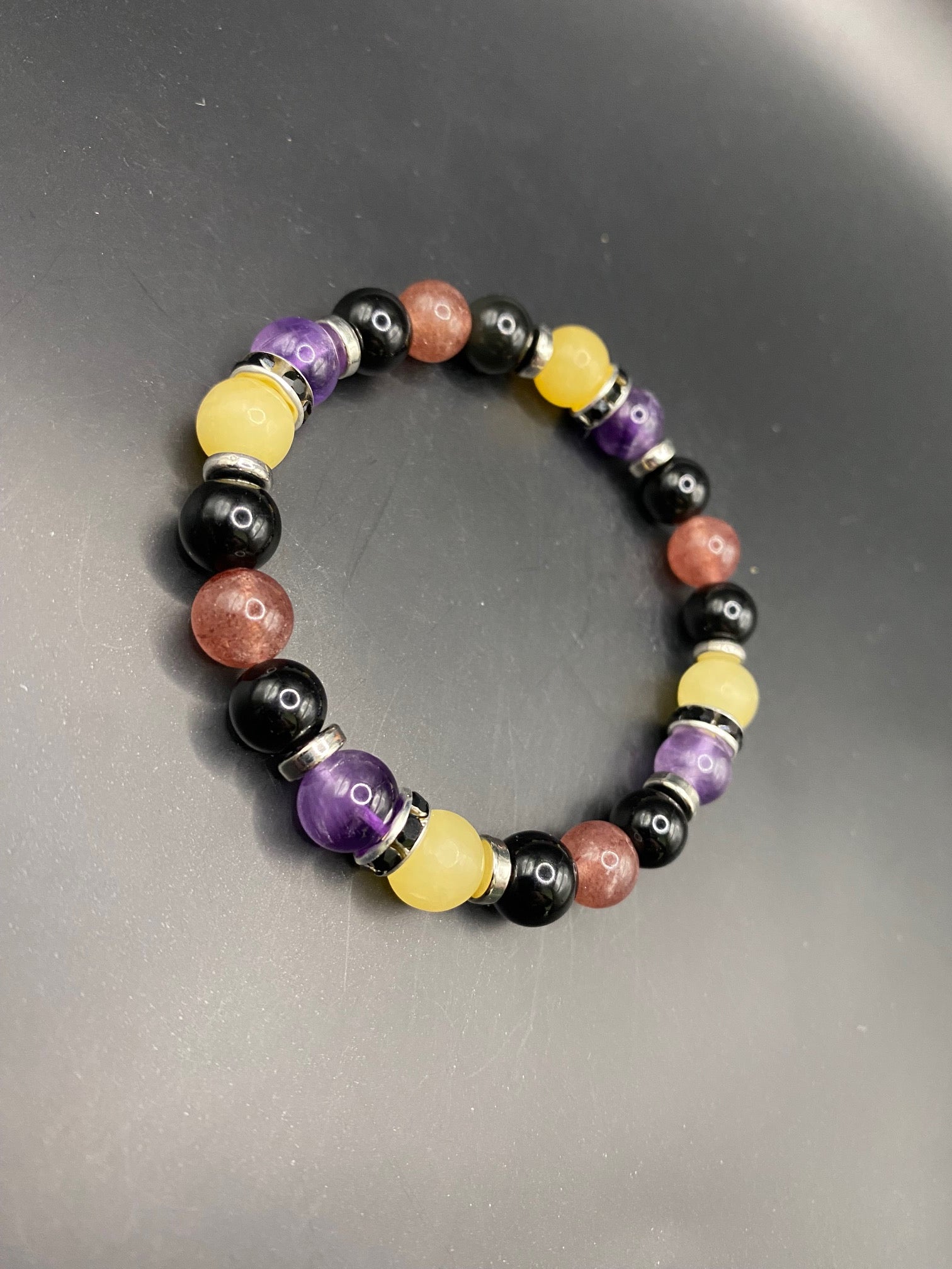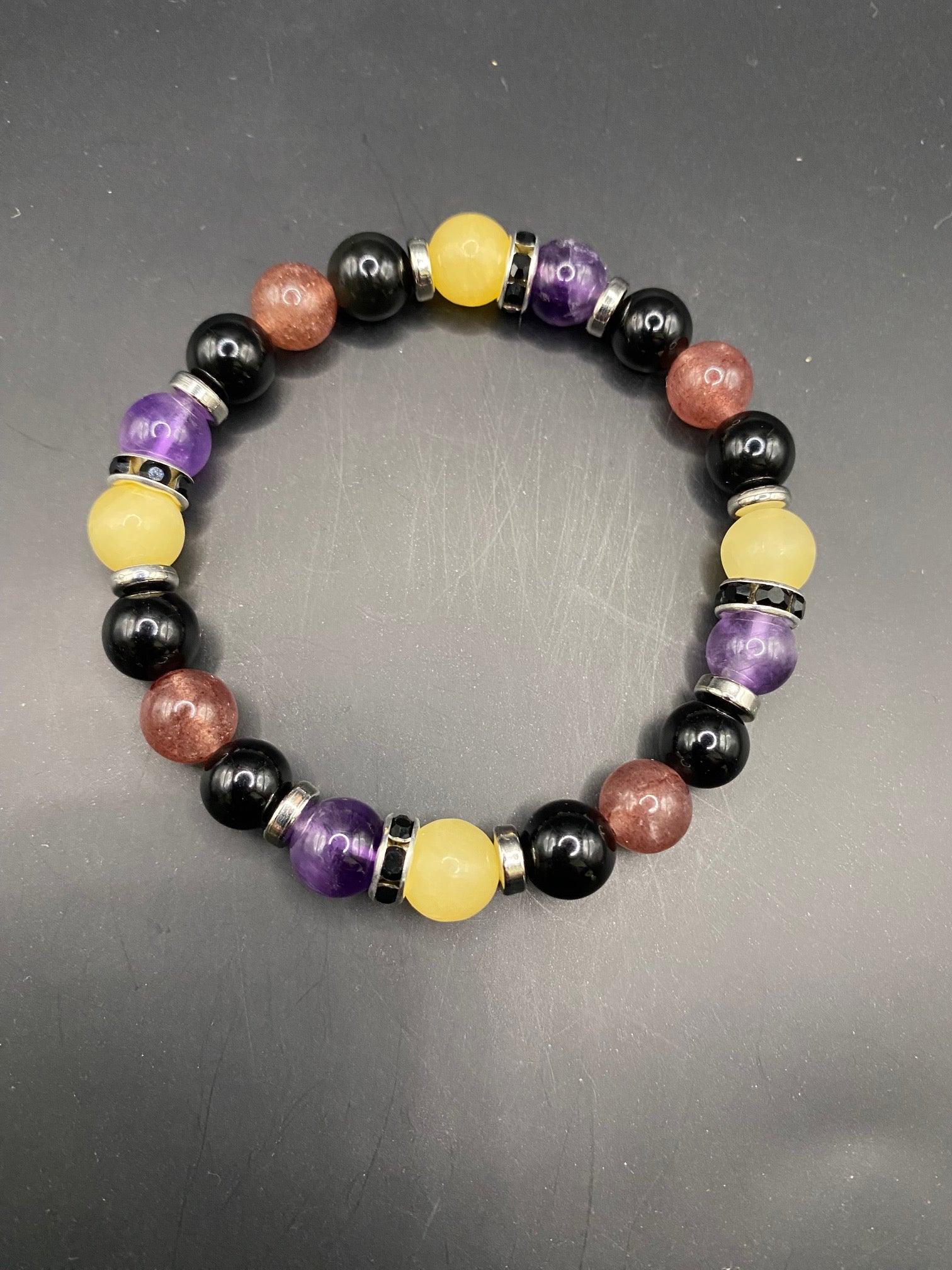 It's made with obsidian, strawberry quartz, honey calcite and amethyst stones with silver spacers <3