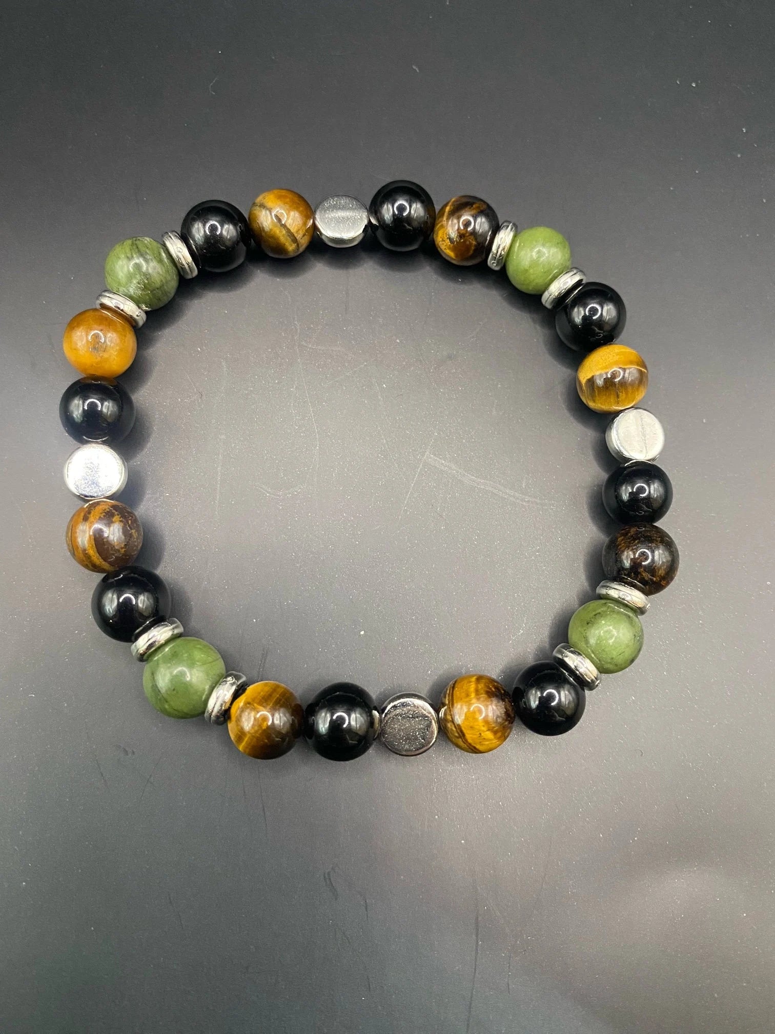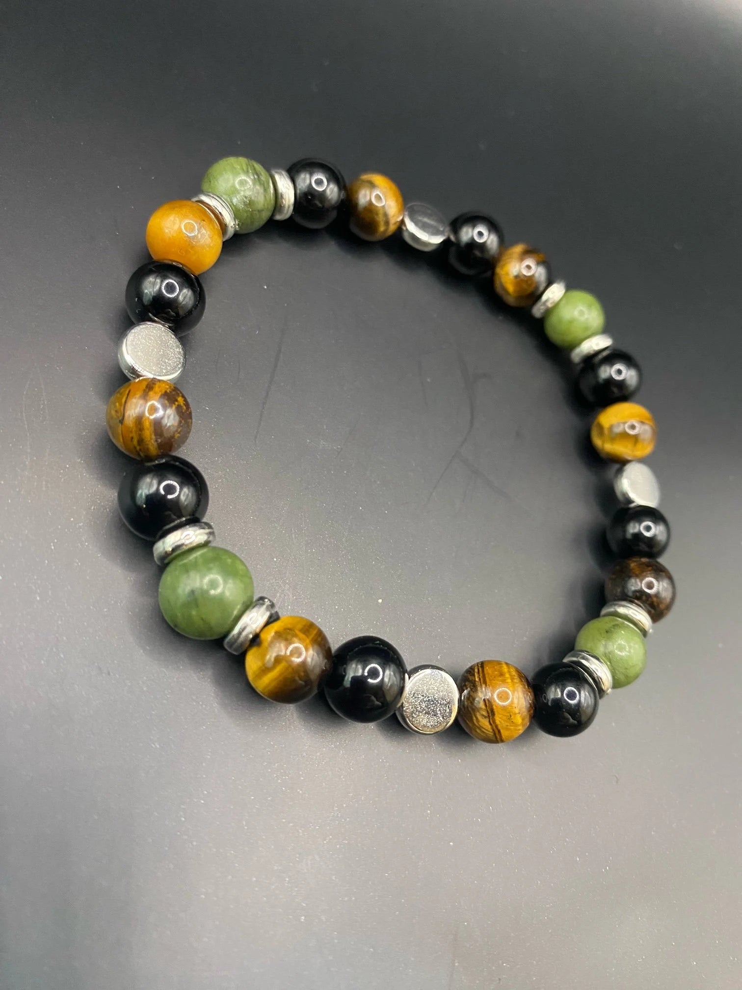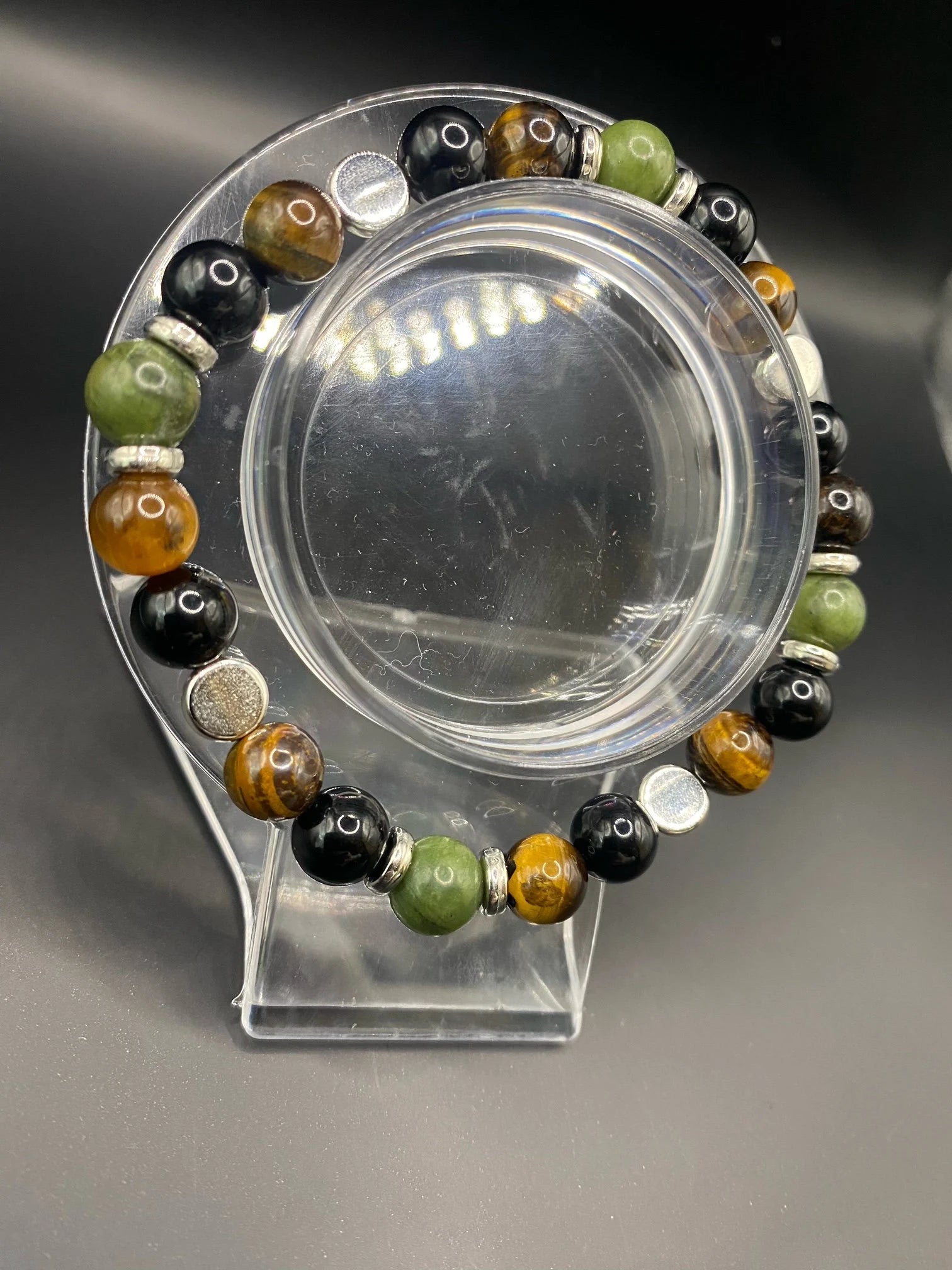 It's made with tigers eye, obsidian and southern jade stone beads with silver colored spacers <3