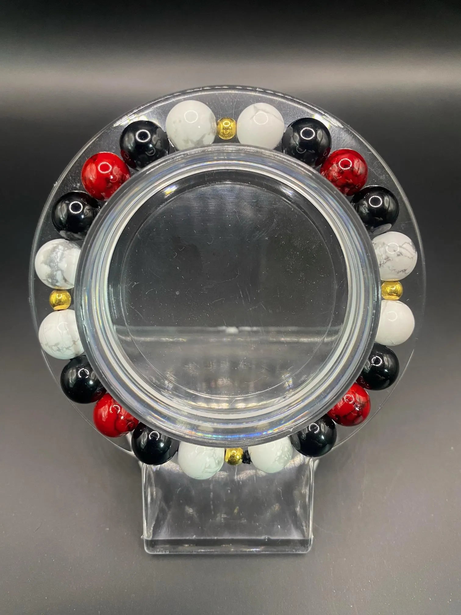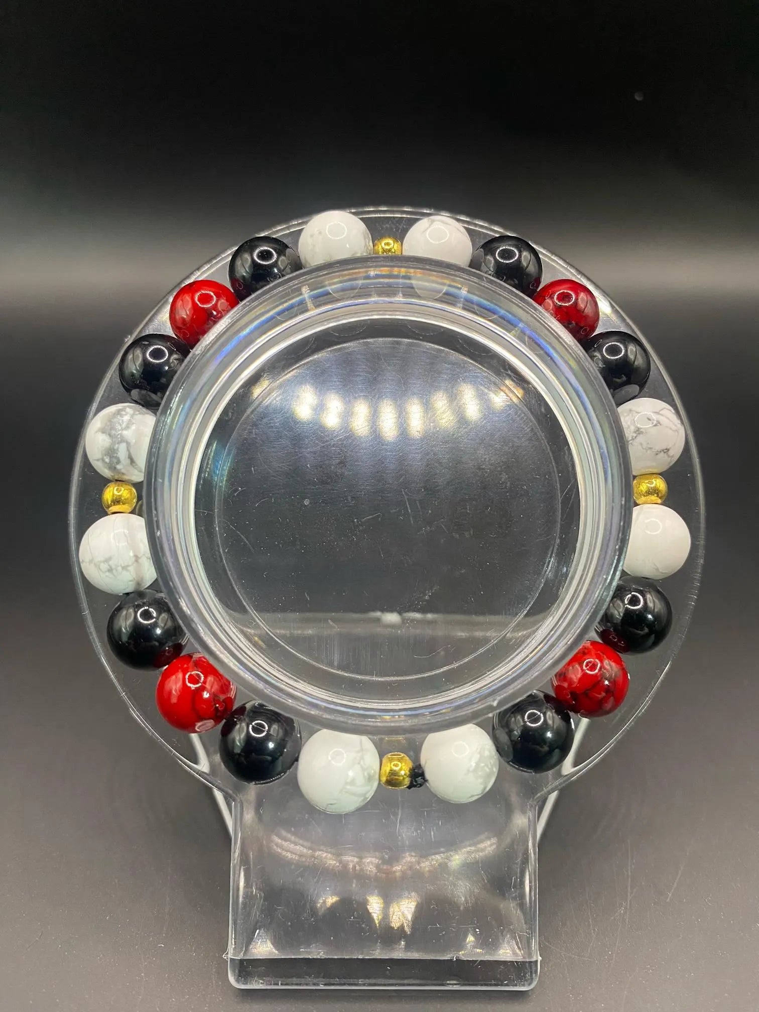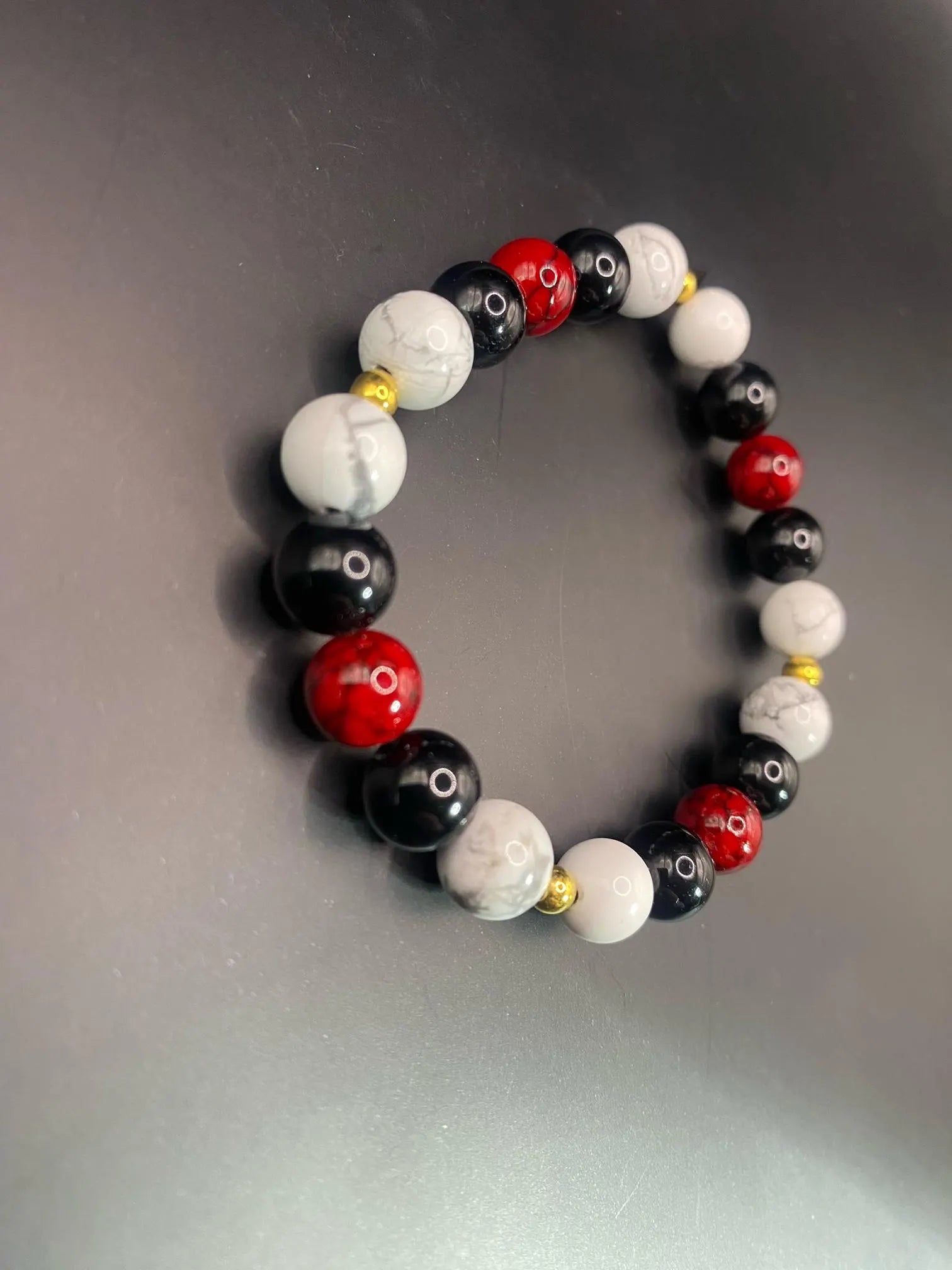 It's made with red coral, obsidian and howlite with gold colored spacers <3
