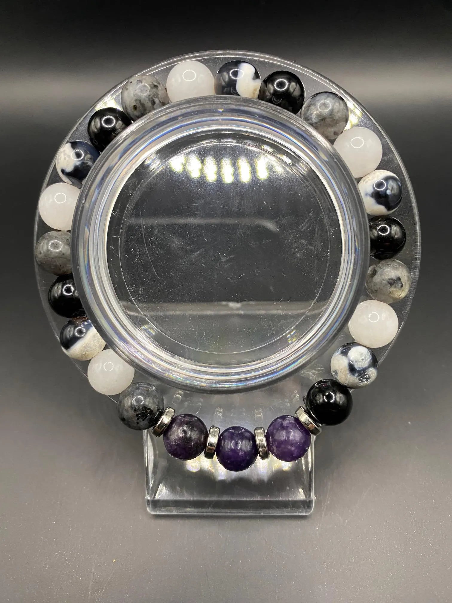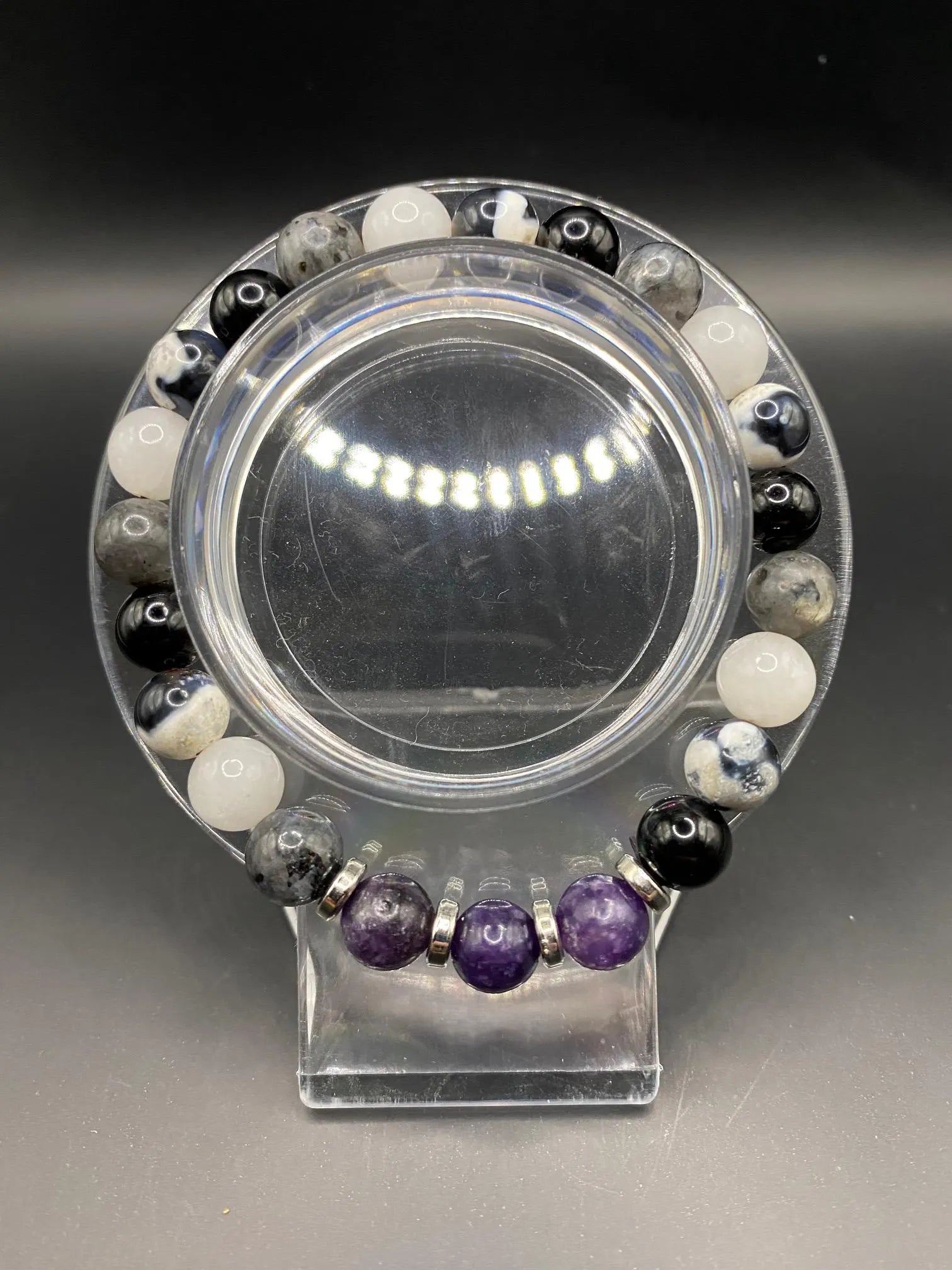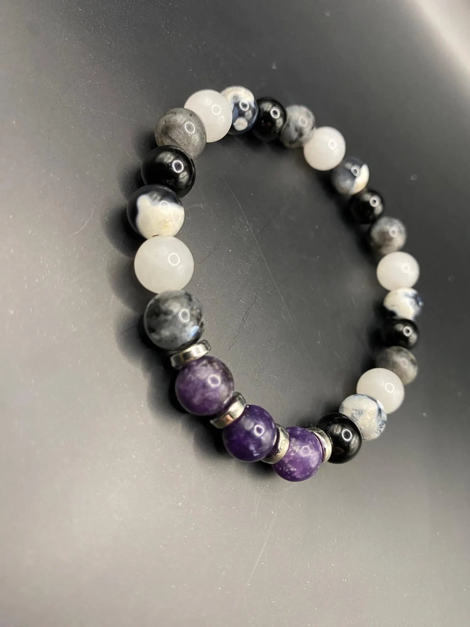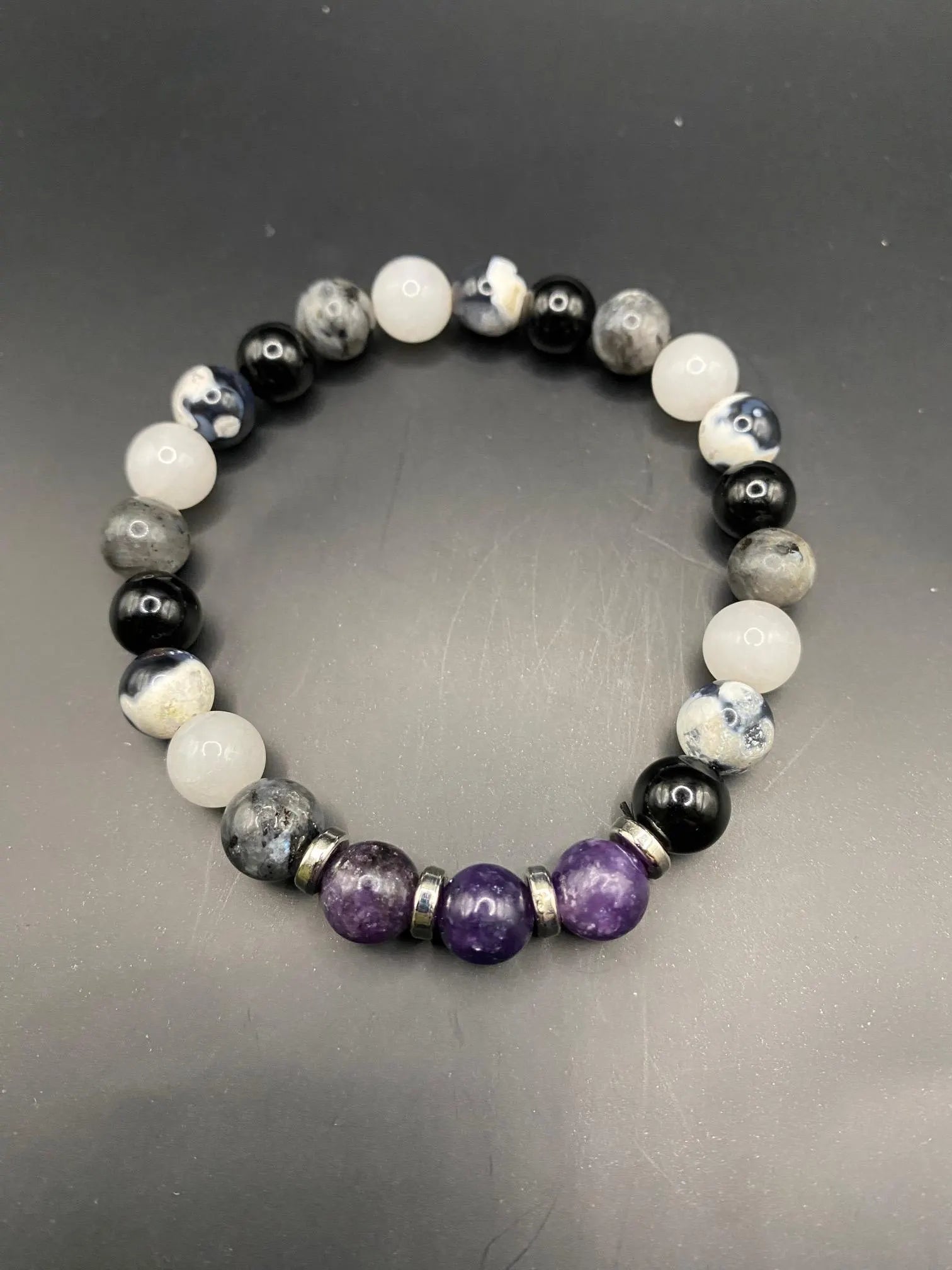 It's made with obsidian, white jade, larvikite, orca agate and high grade lepidolite beads with silver spacers <3
