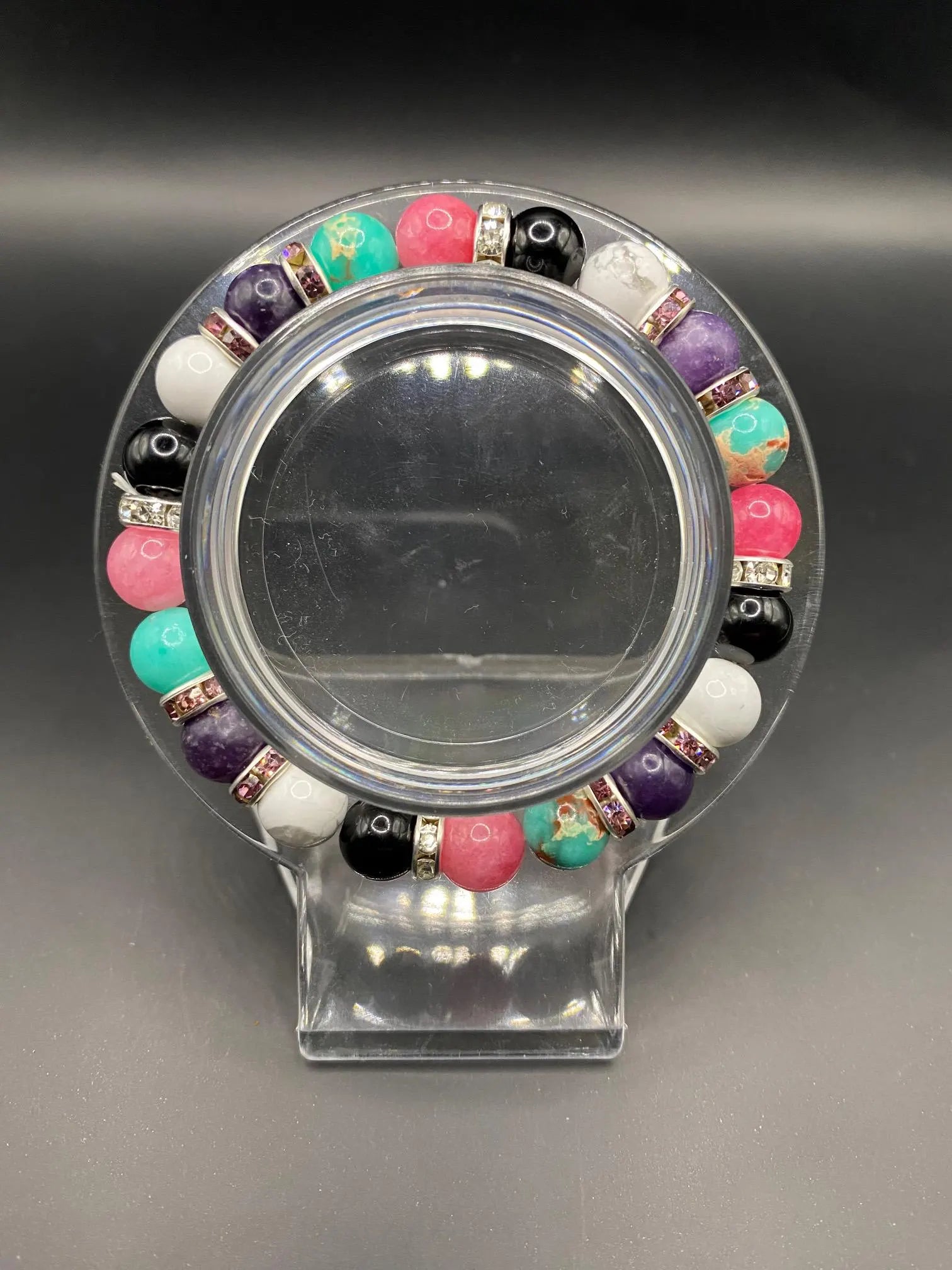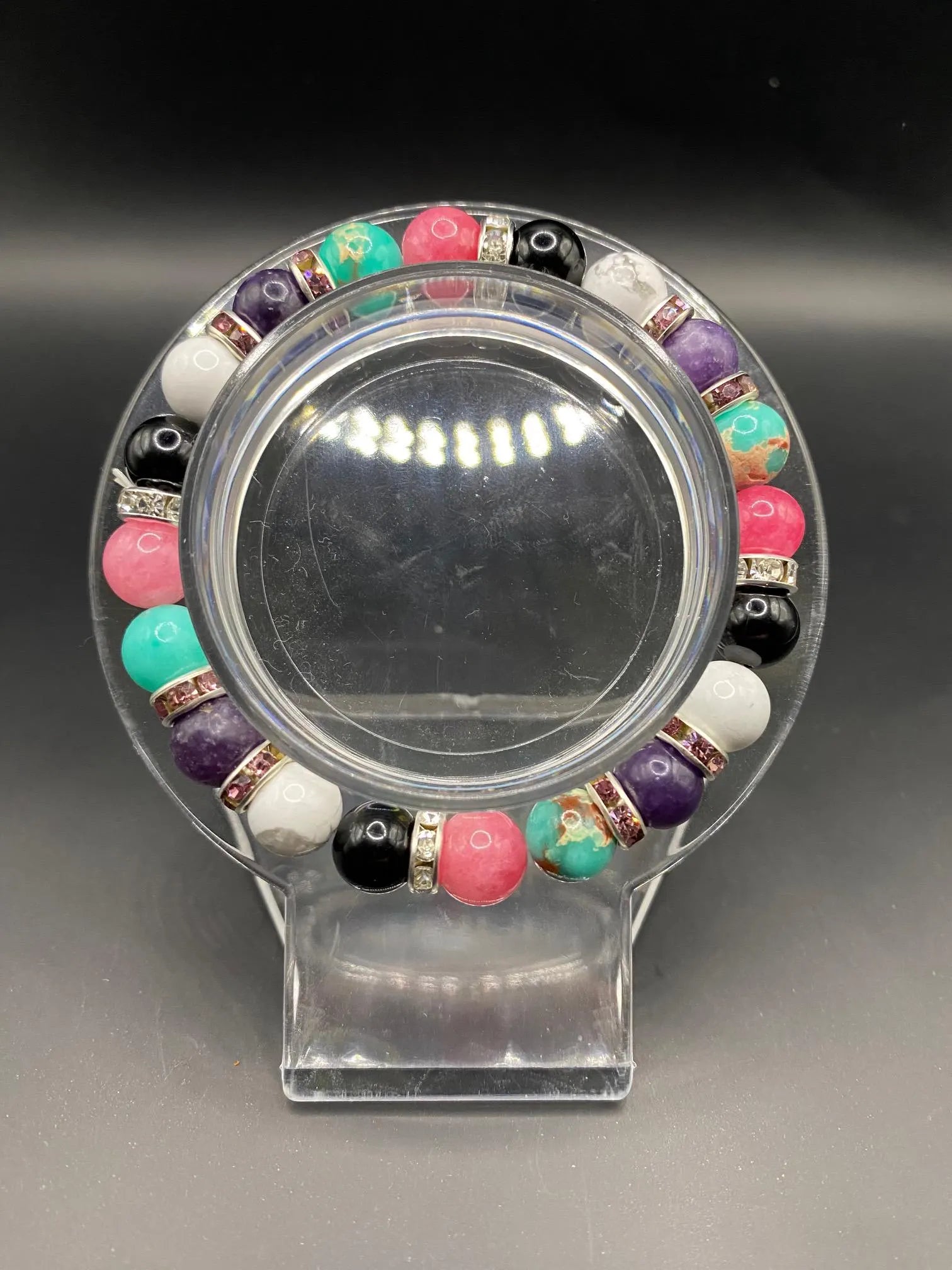 It's made with obsidian, howlite, pink chalcedony, shoushan stone and lepidolite beads with silver spacers <3