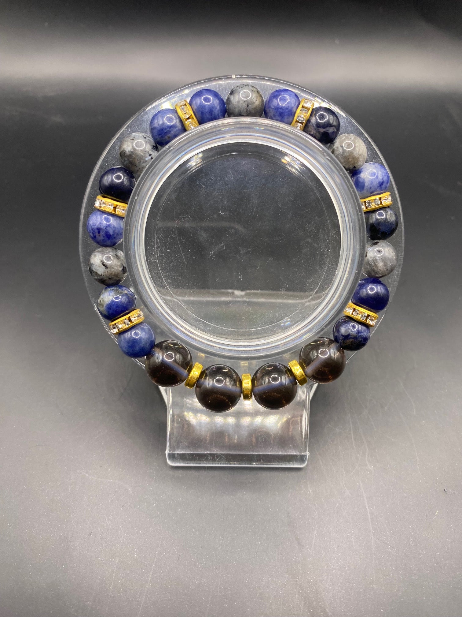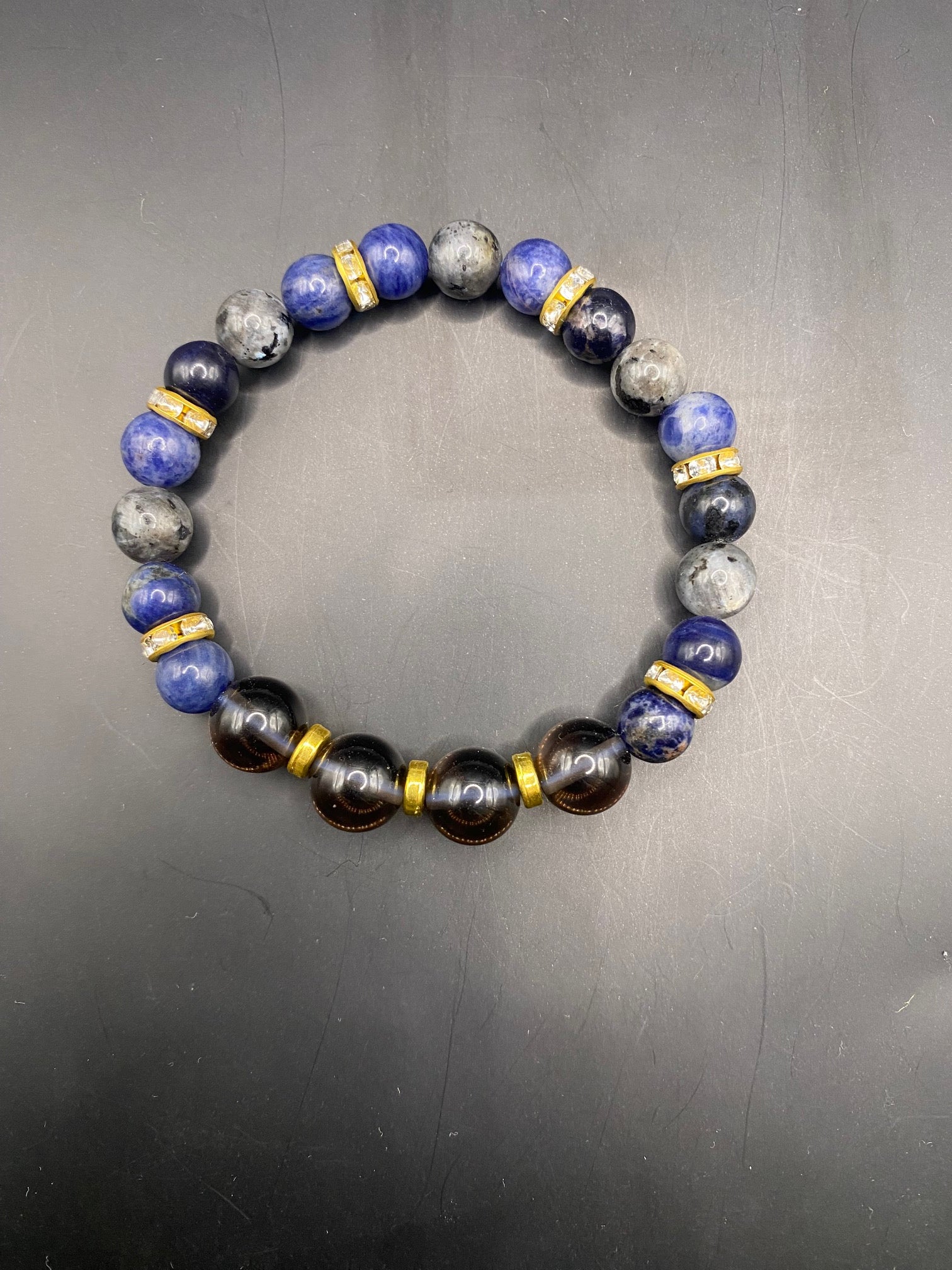This piece is made using smoky quartz, larvikite and sodalite beads with gold spacers <3