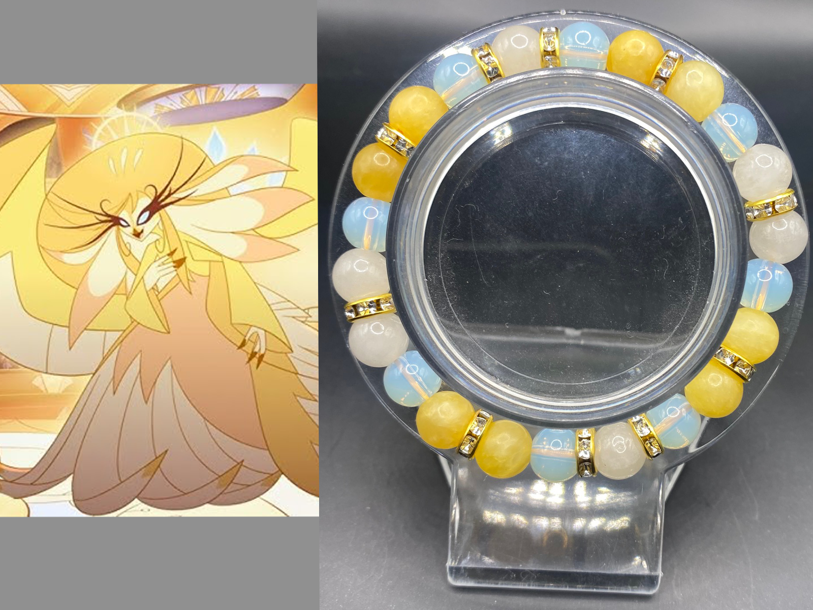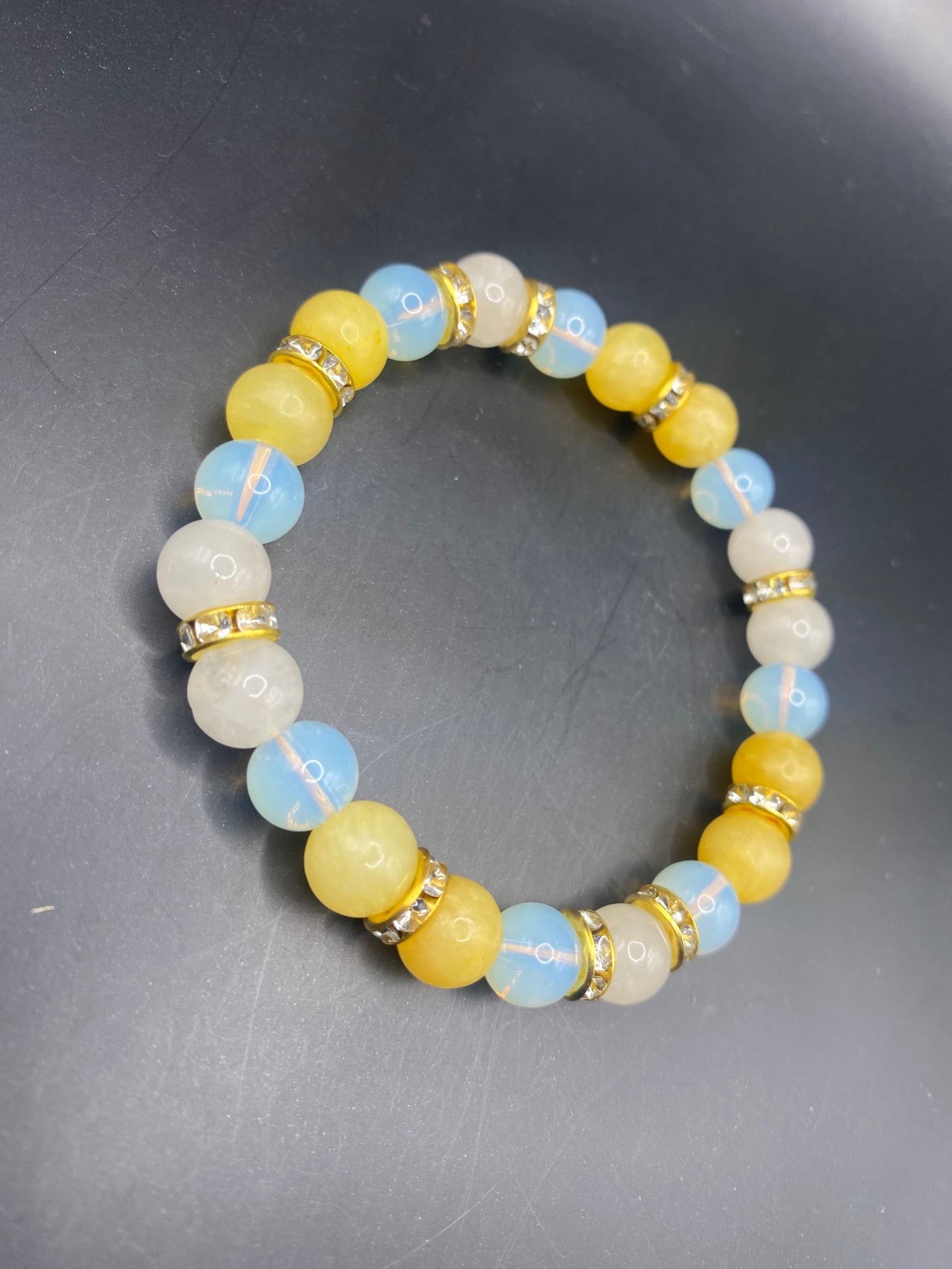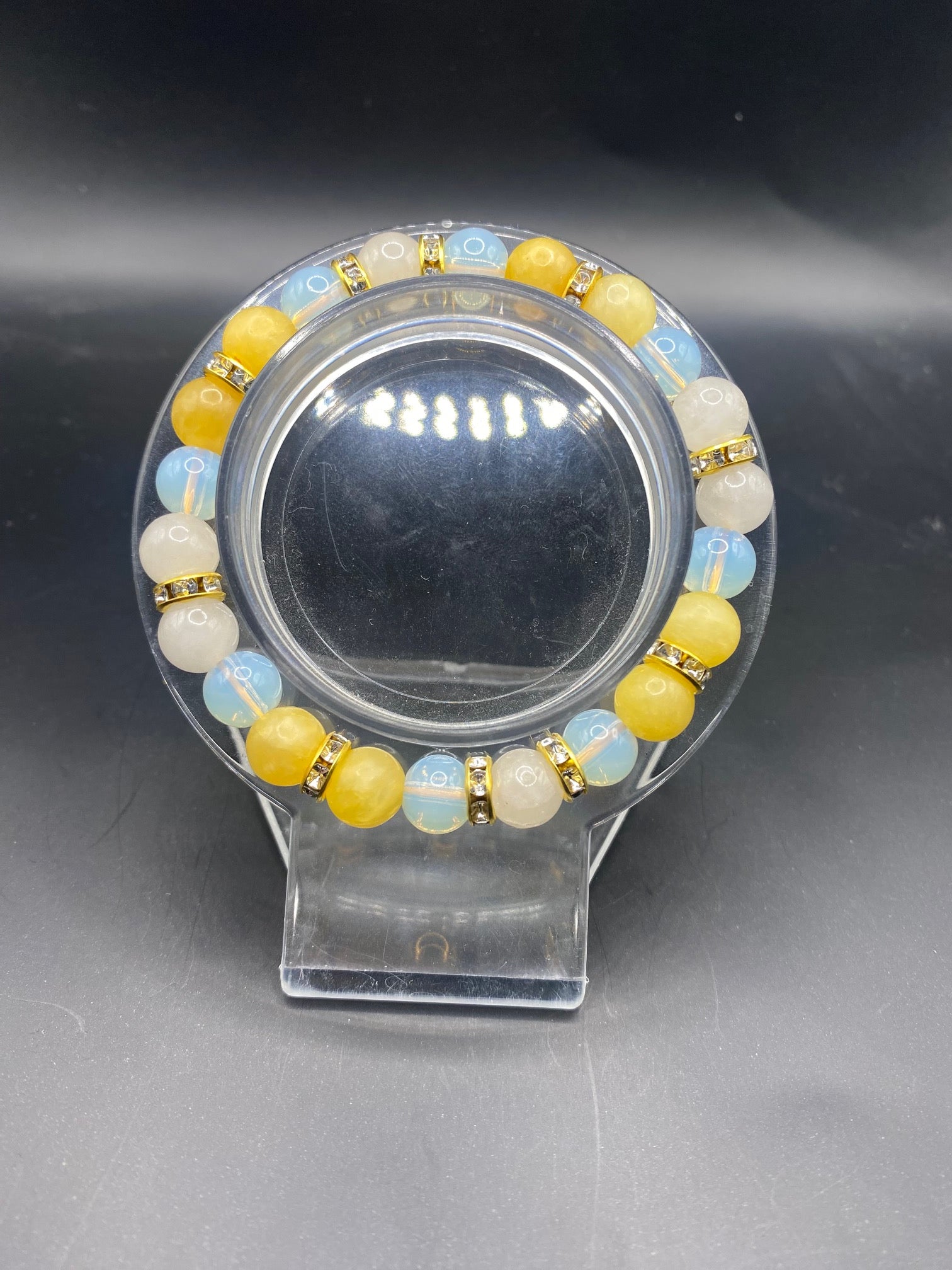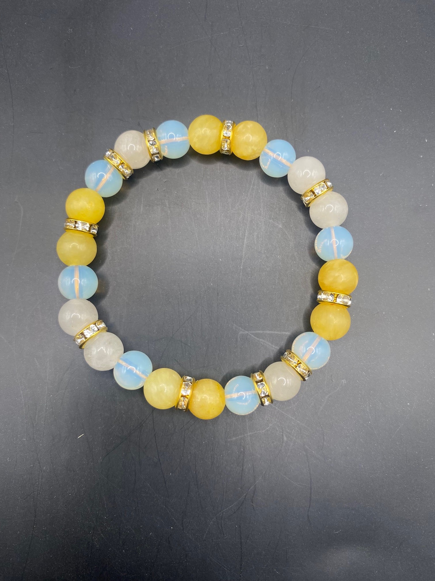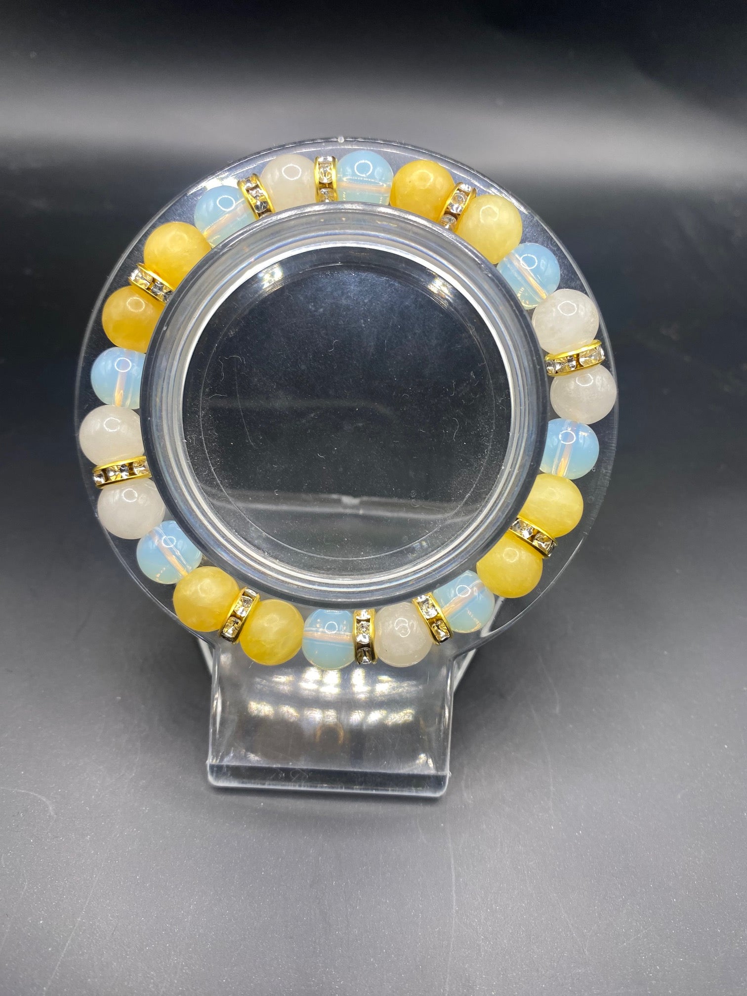 It's made with honey calcite, white jade and opalite stone beads with gold colored spacers <3