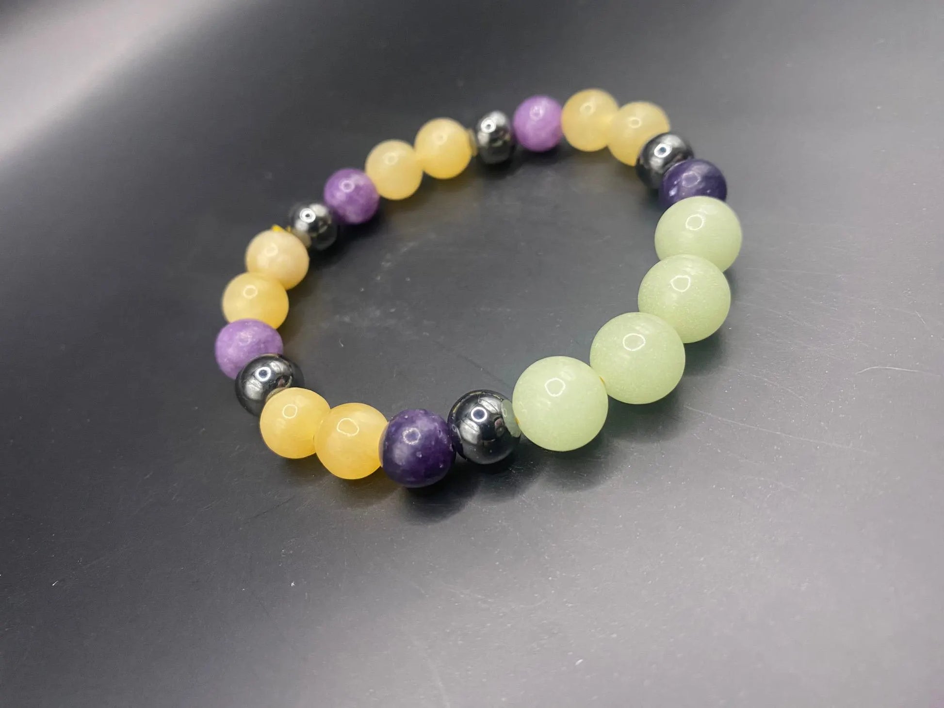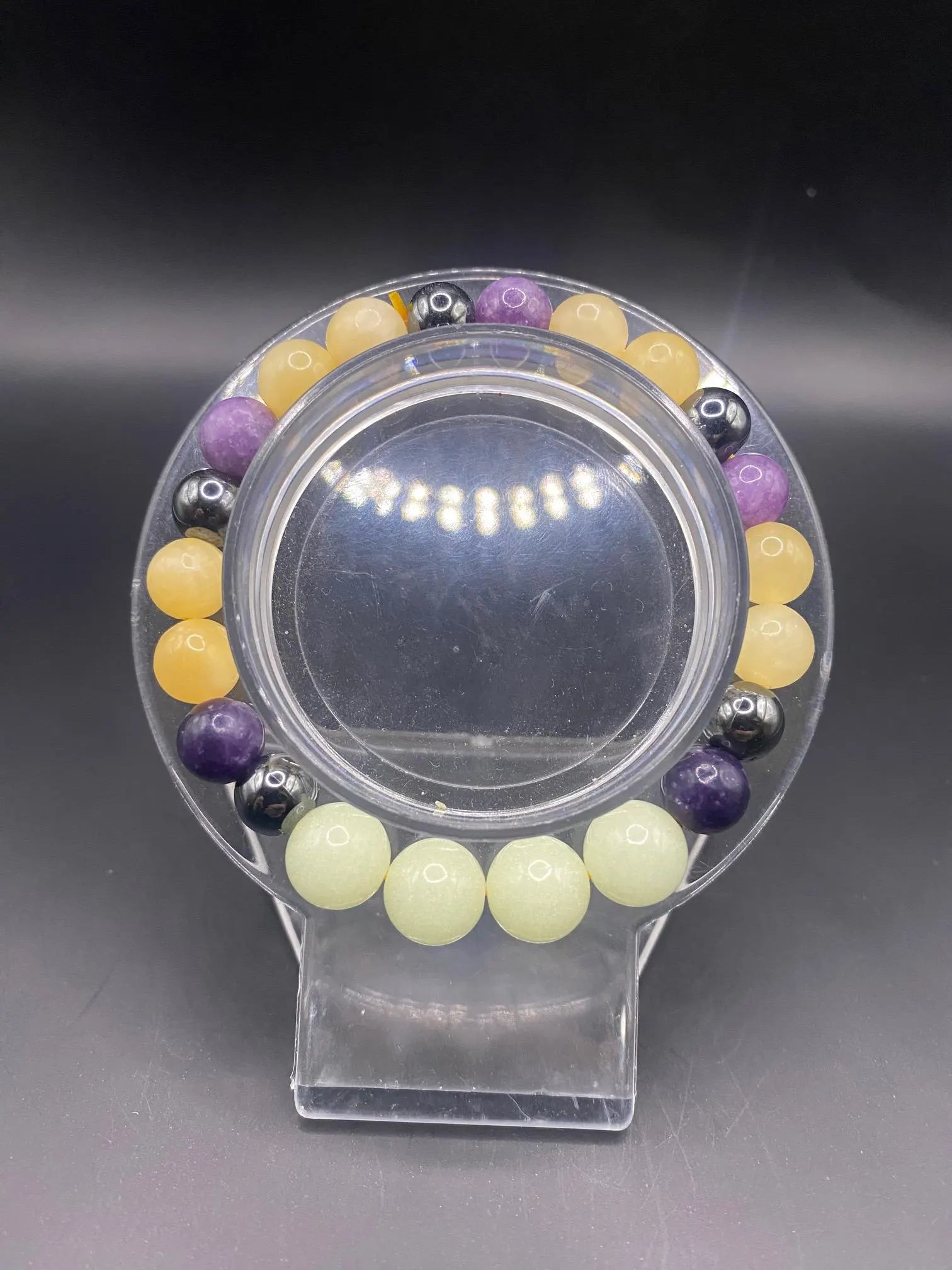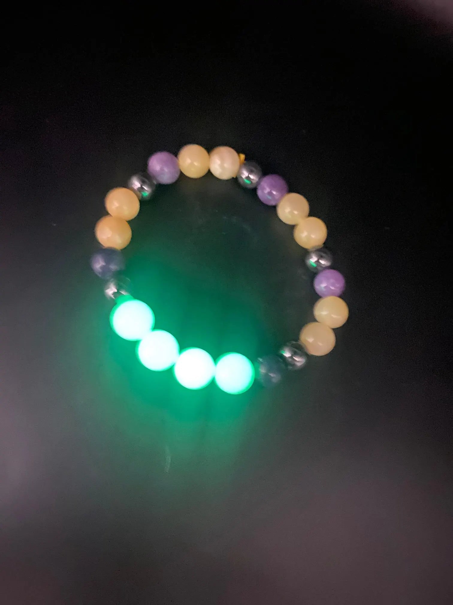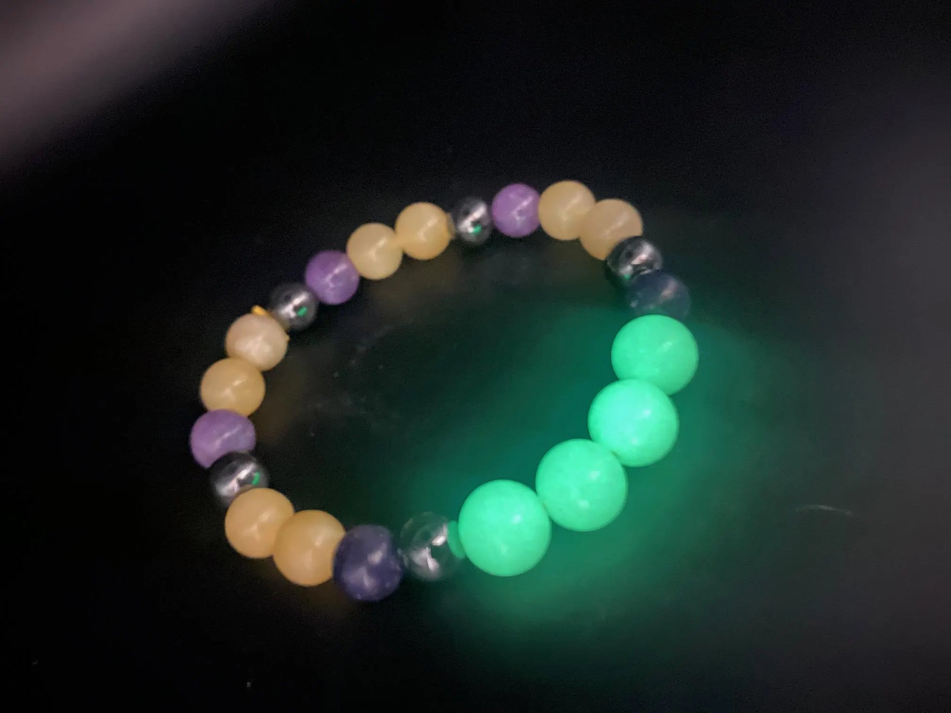 It's made with hematite, honey calcite, lepidolite and luminous (GLOWS under UV!) stone beads <3