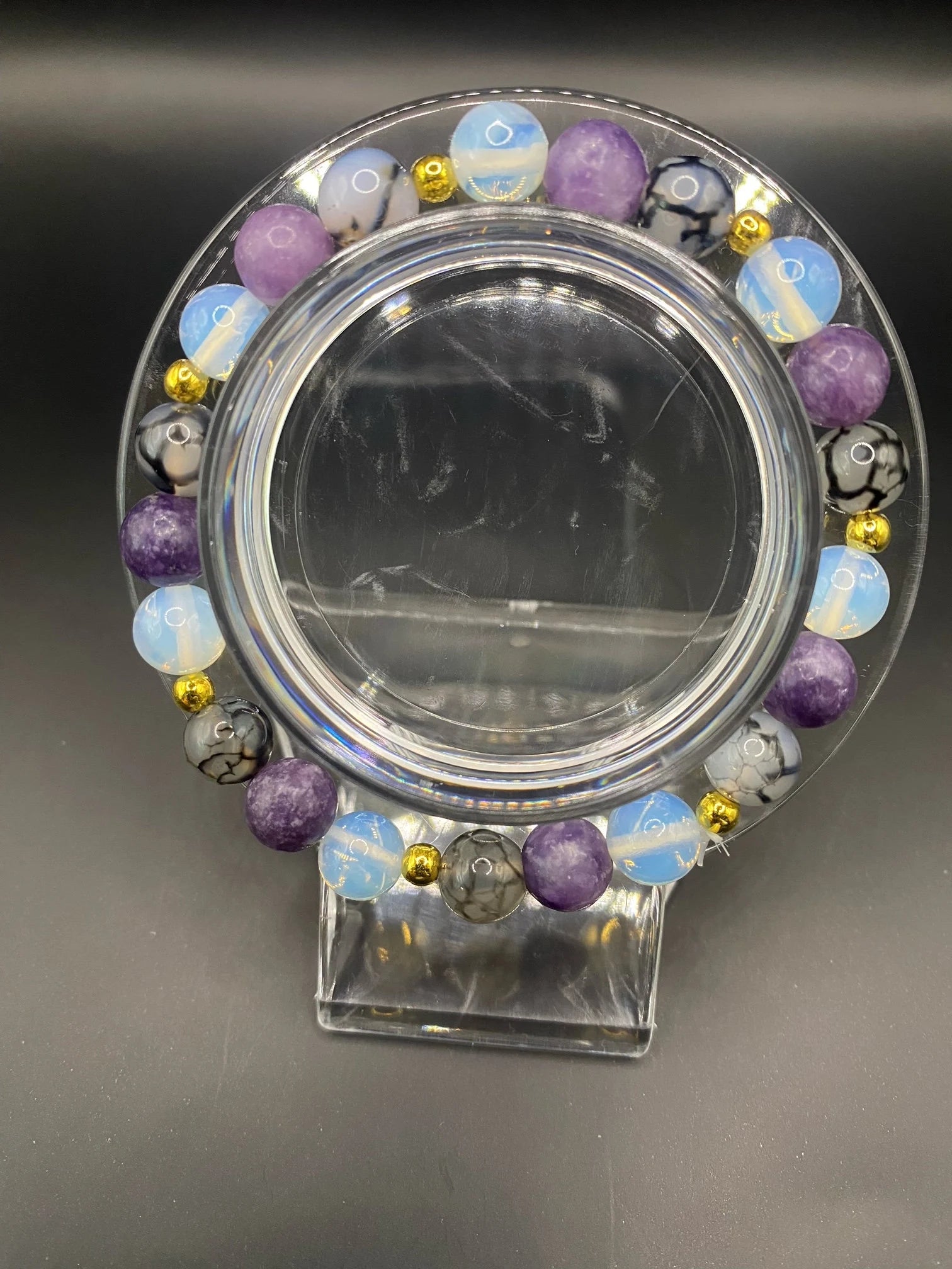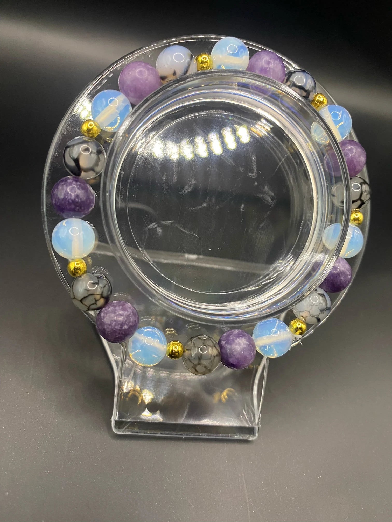 It's made with lepidolite, dragon's vein agate and opalite with gold colored spacers <3