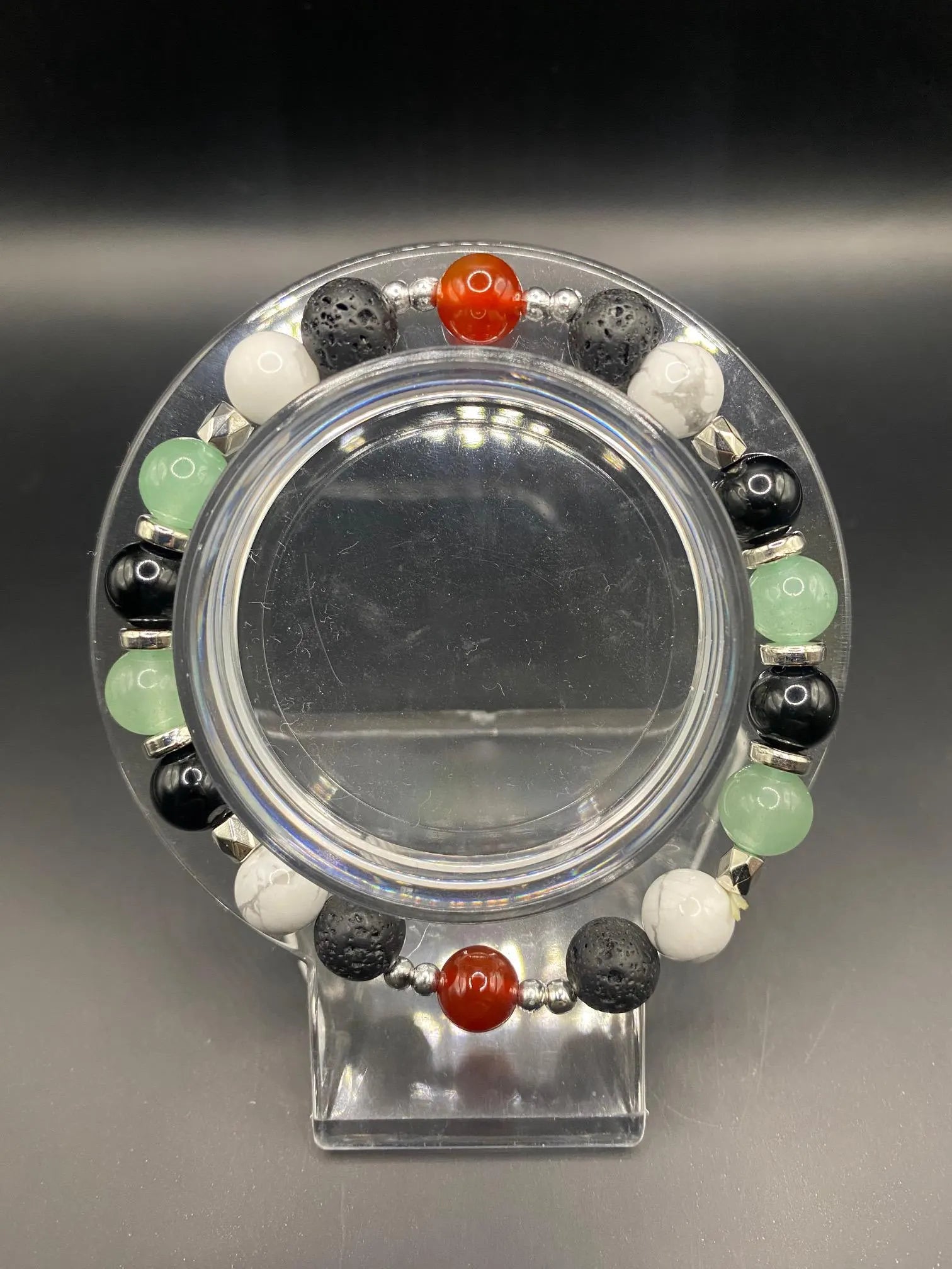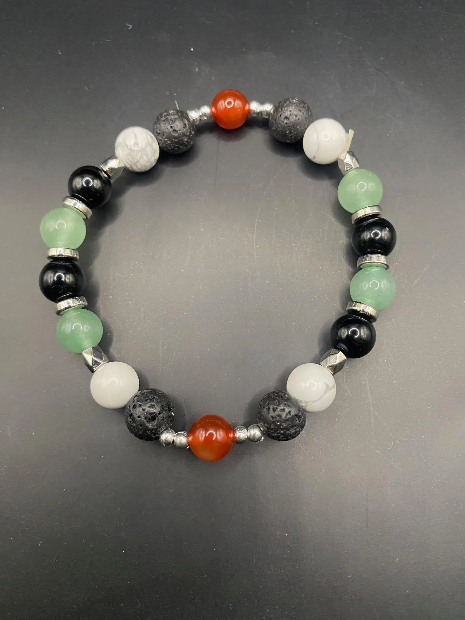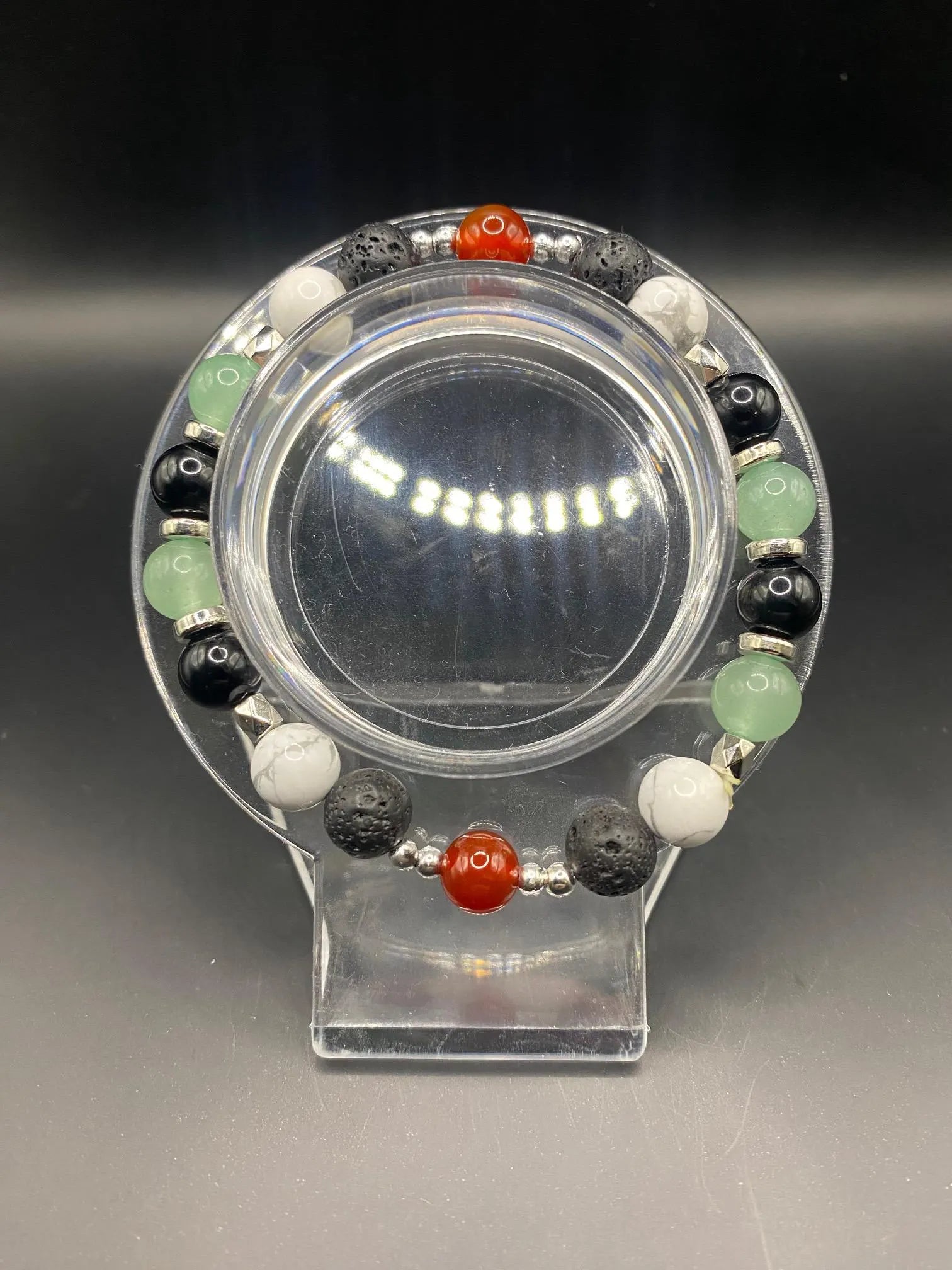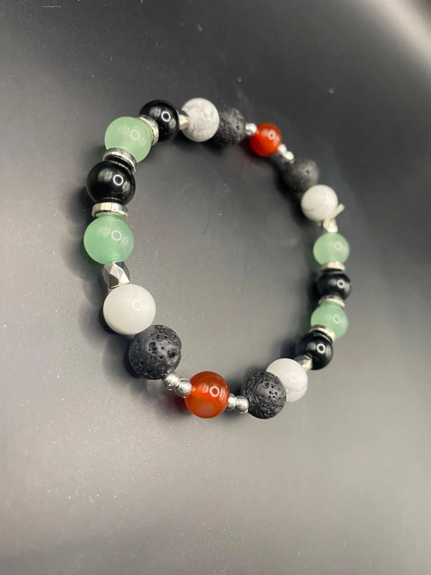 It's made with obsidian, green aventurine, howlite, lava rock and carnelian beads and silver spacers <3