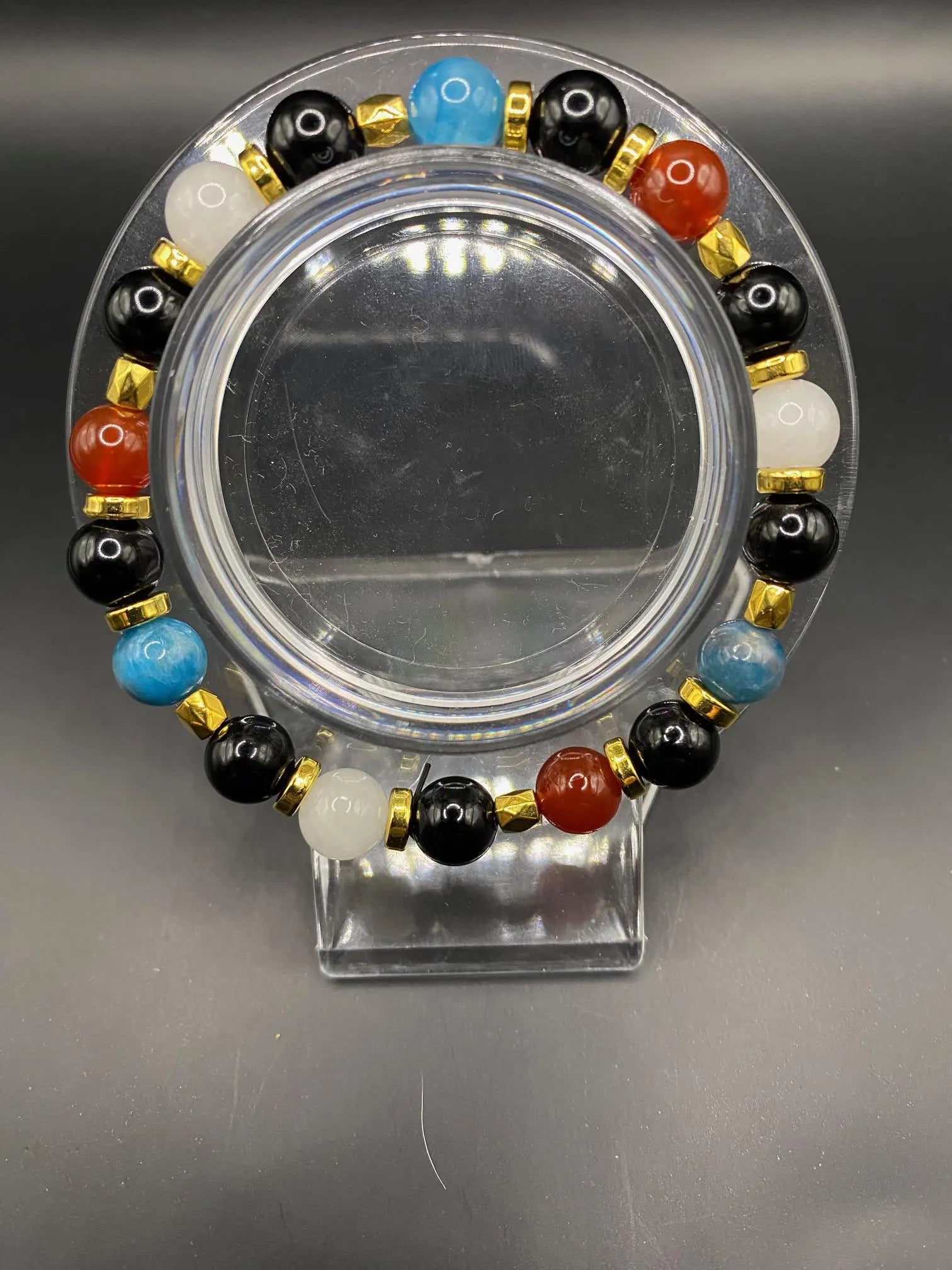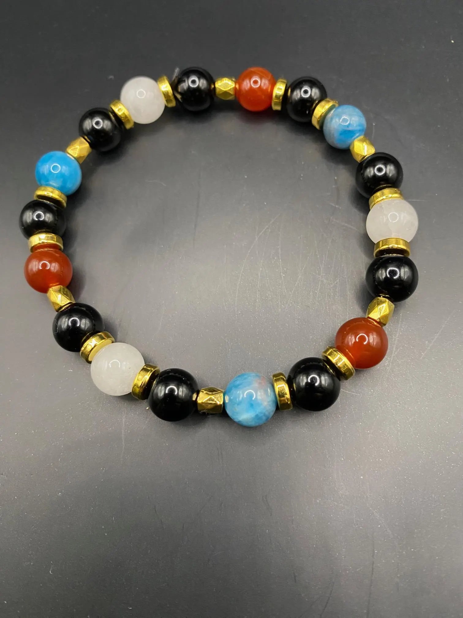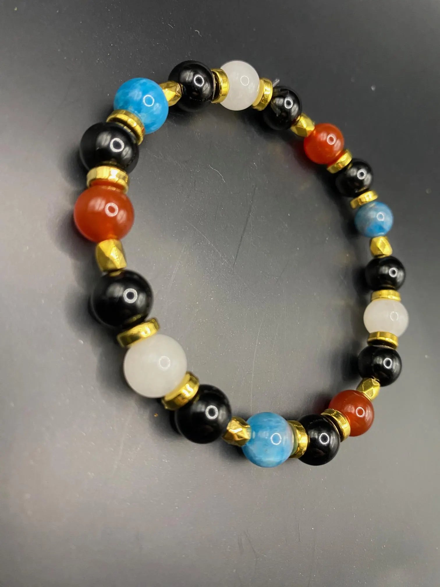It's made with obsidian, white jade, apatite and carnelian beads with gold spacers <3