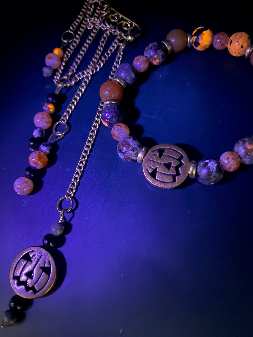The ear cuff is made with yooperlite (GLOWS under UV), black agate and glass beads with a gold base and a single metal pumpkin charm
