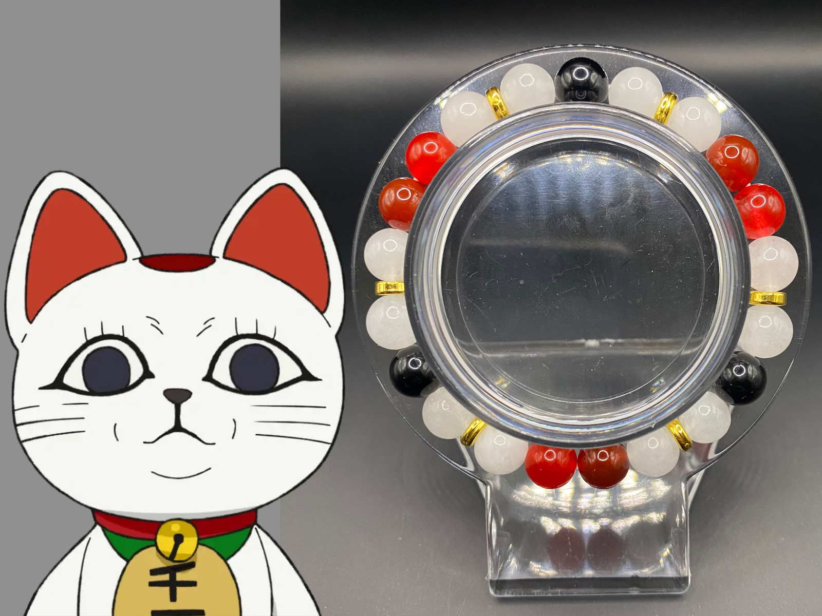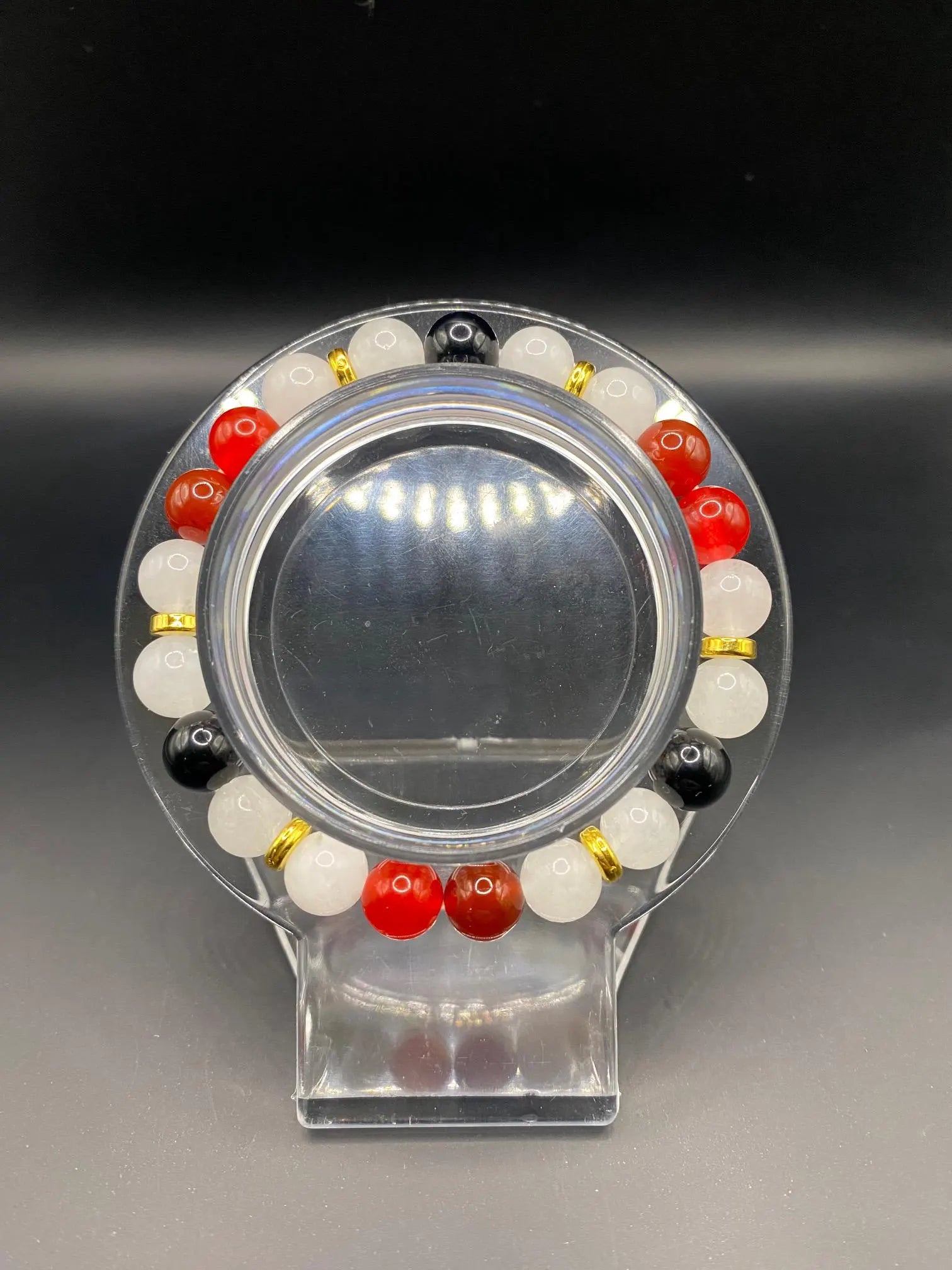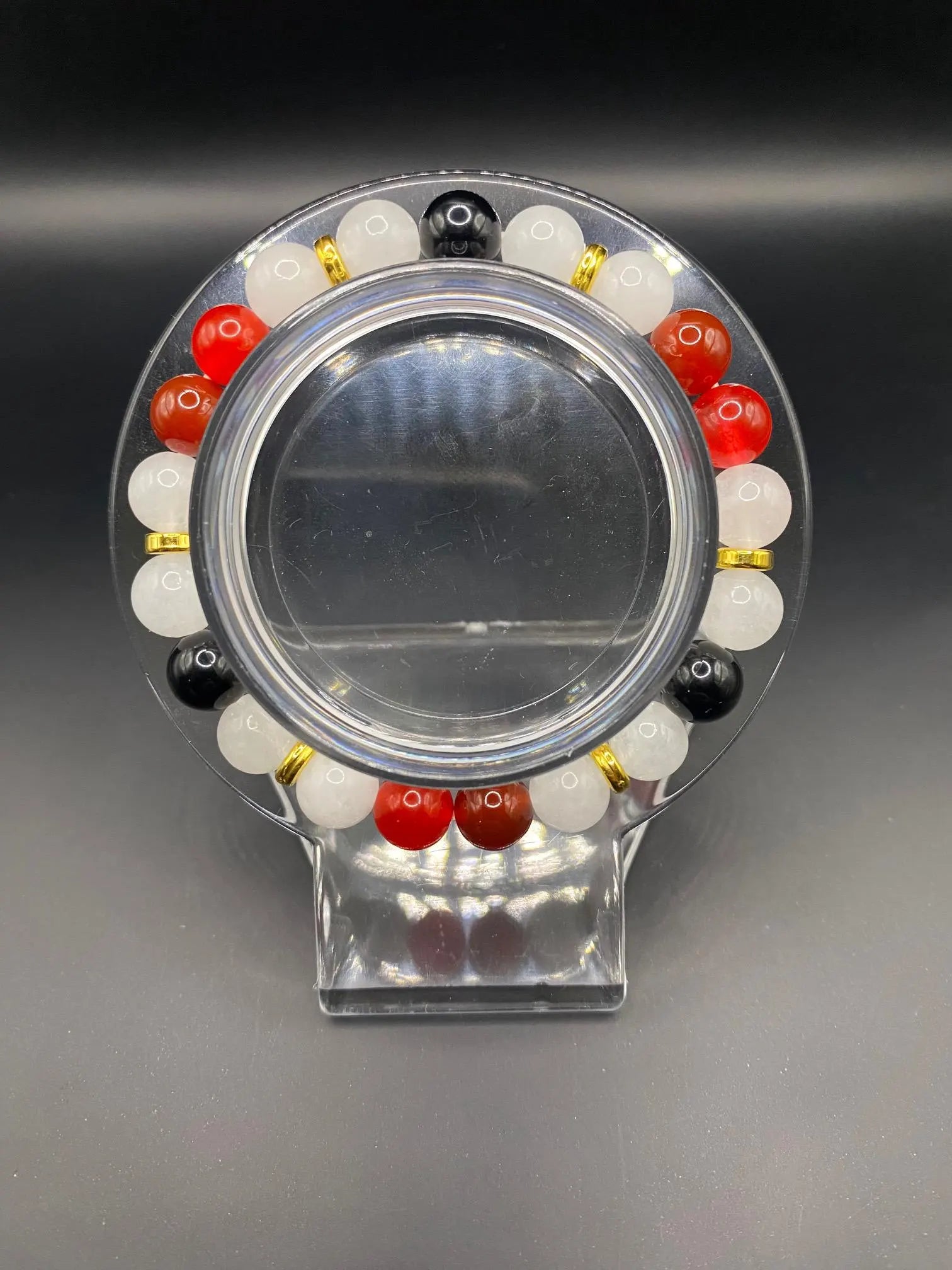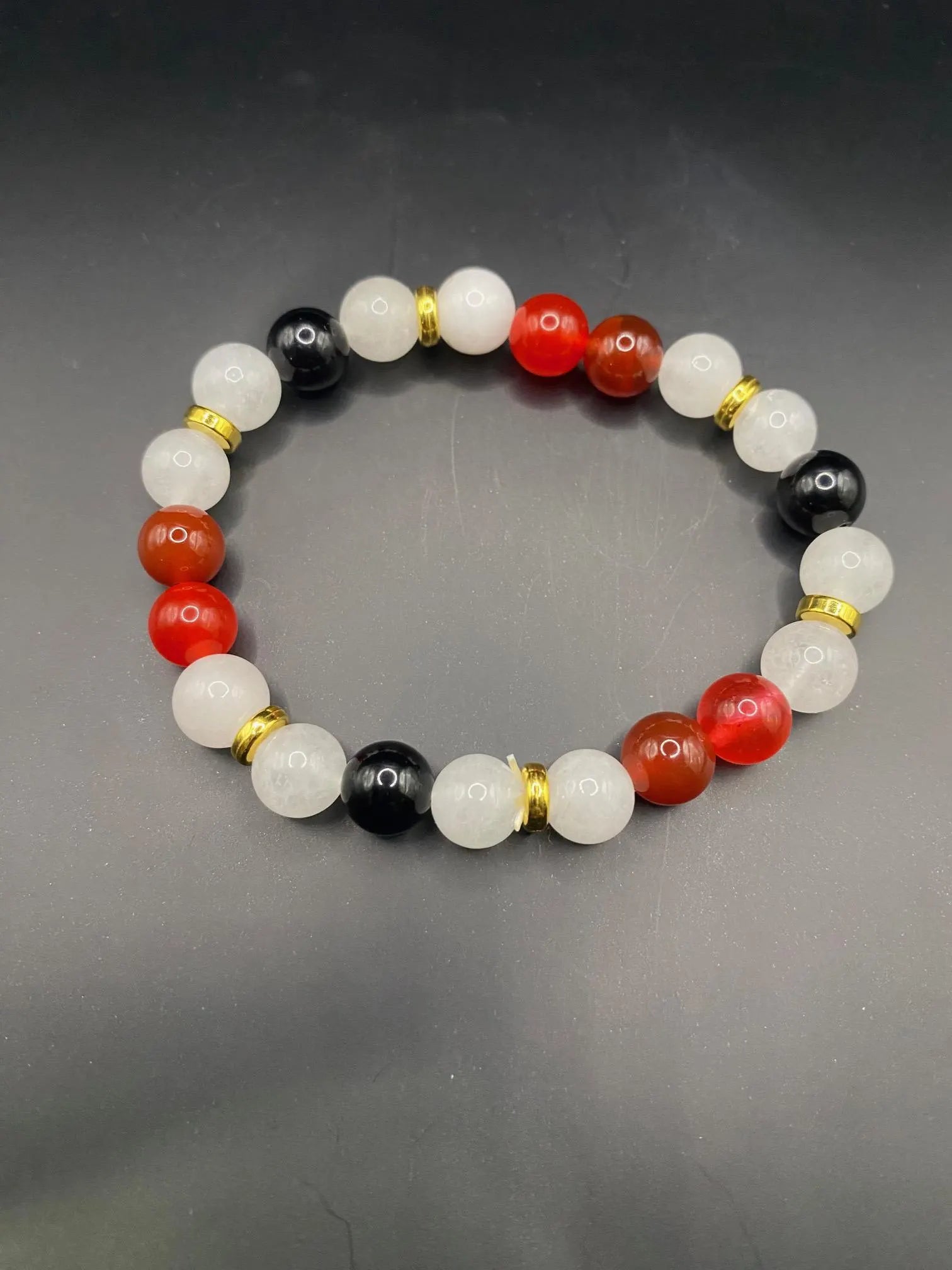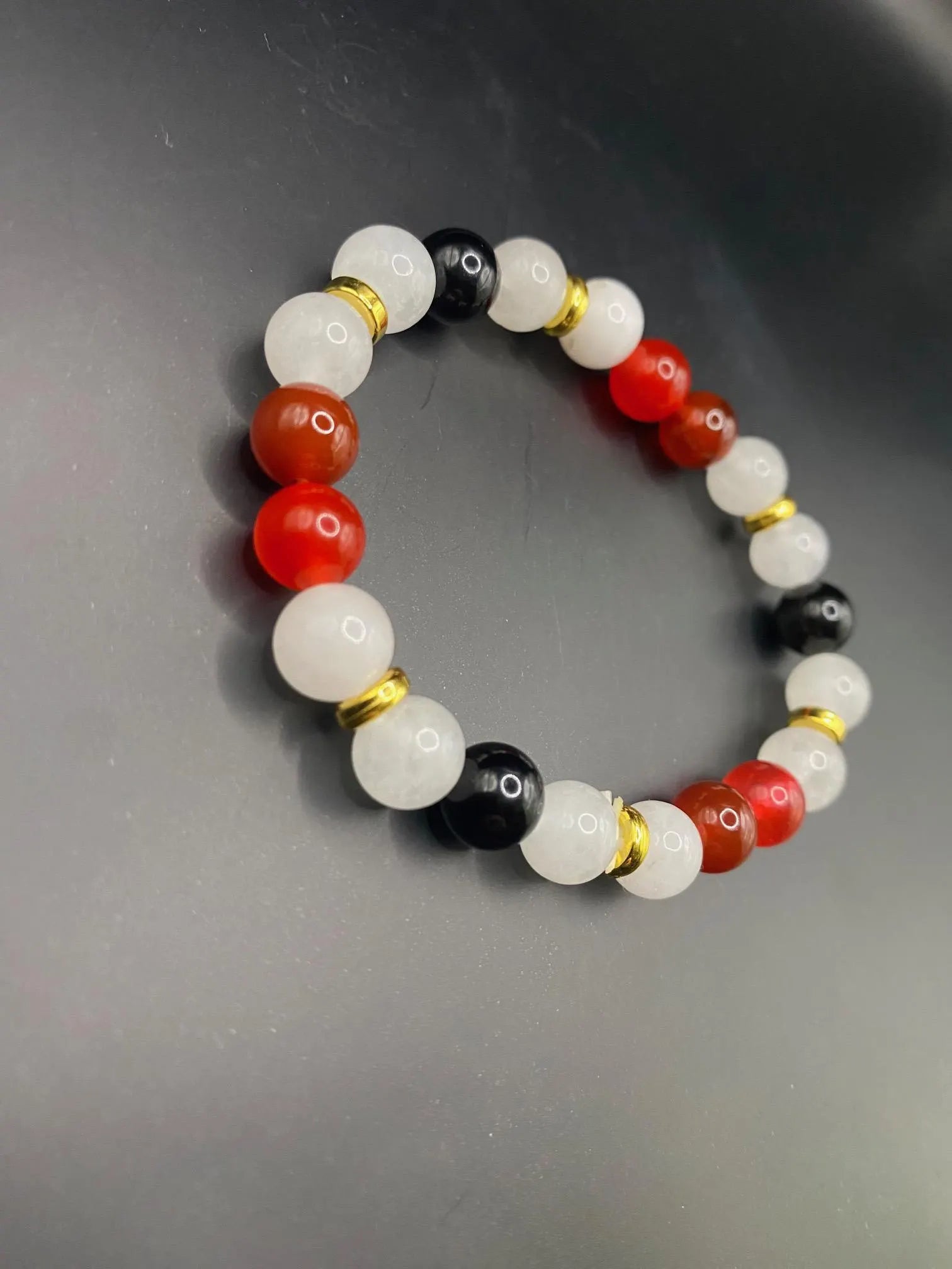 It's made with red coral jade, obsidian, white jade, and carnelian beads and gold spacers <3