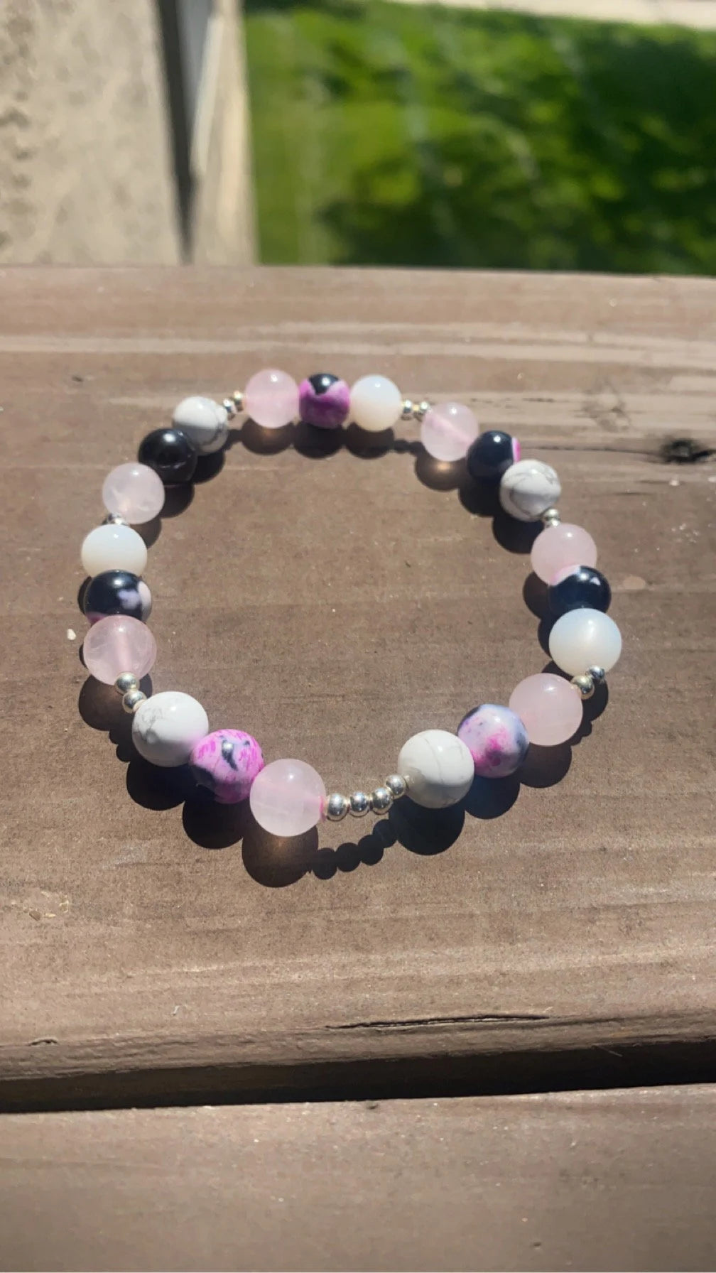 It's made with moonstone, howlite, rose quartz and orca agate stones with silver colored spacers <3