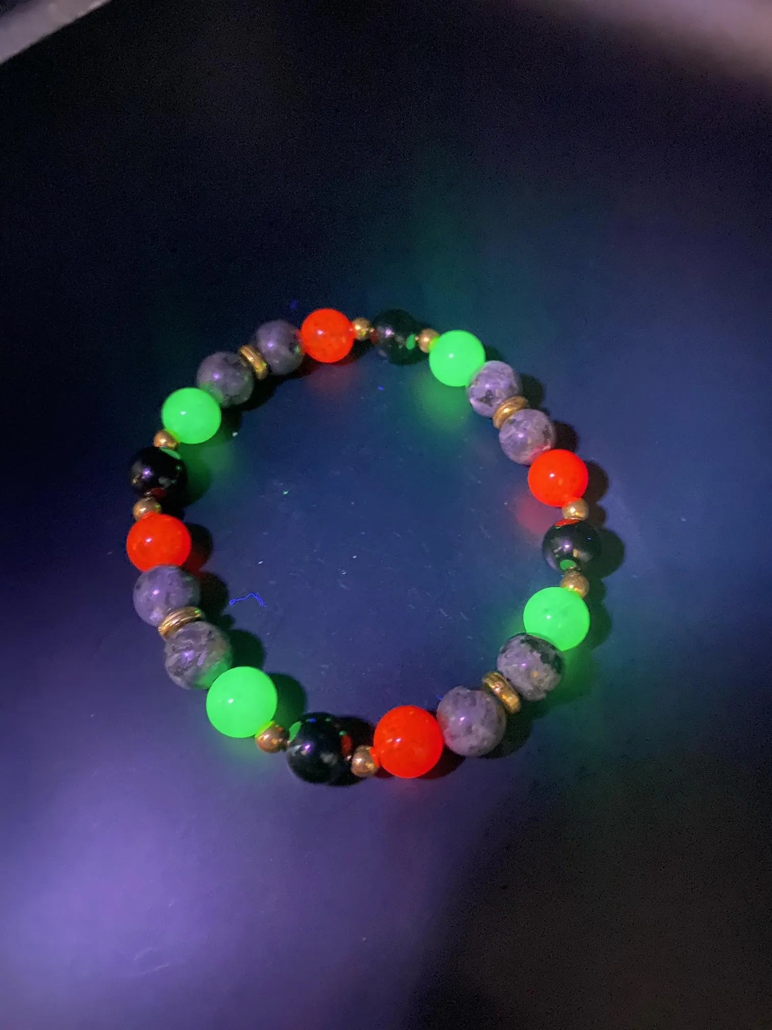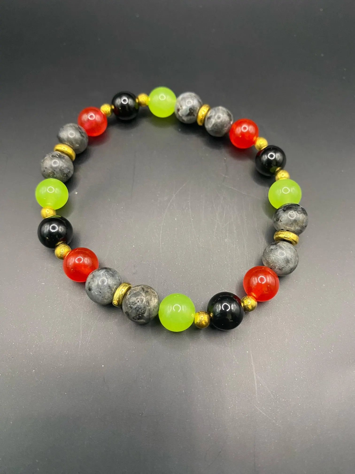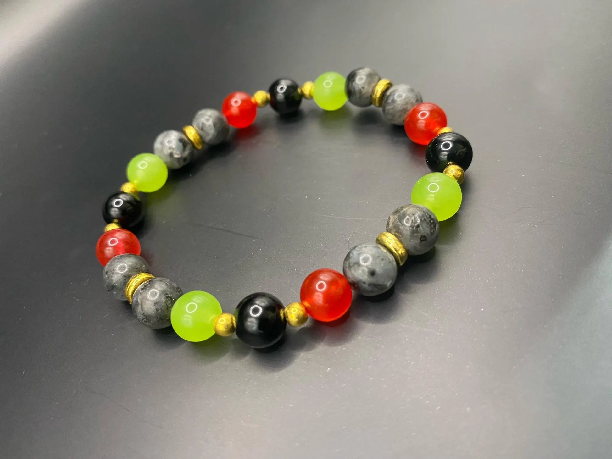 It's made with larvikite, obsidian and green and read chalcedony (Glows un UV!) beads with gold spacers <3