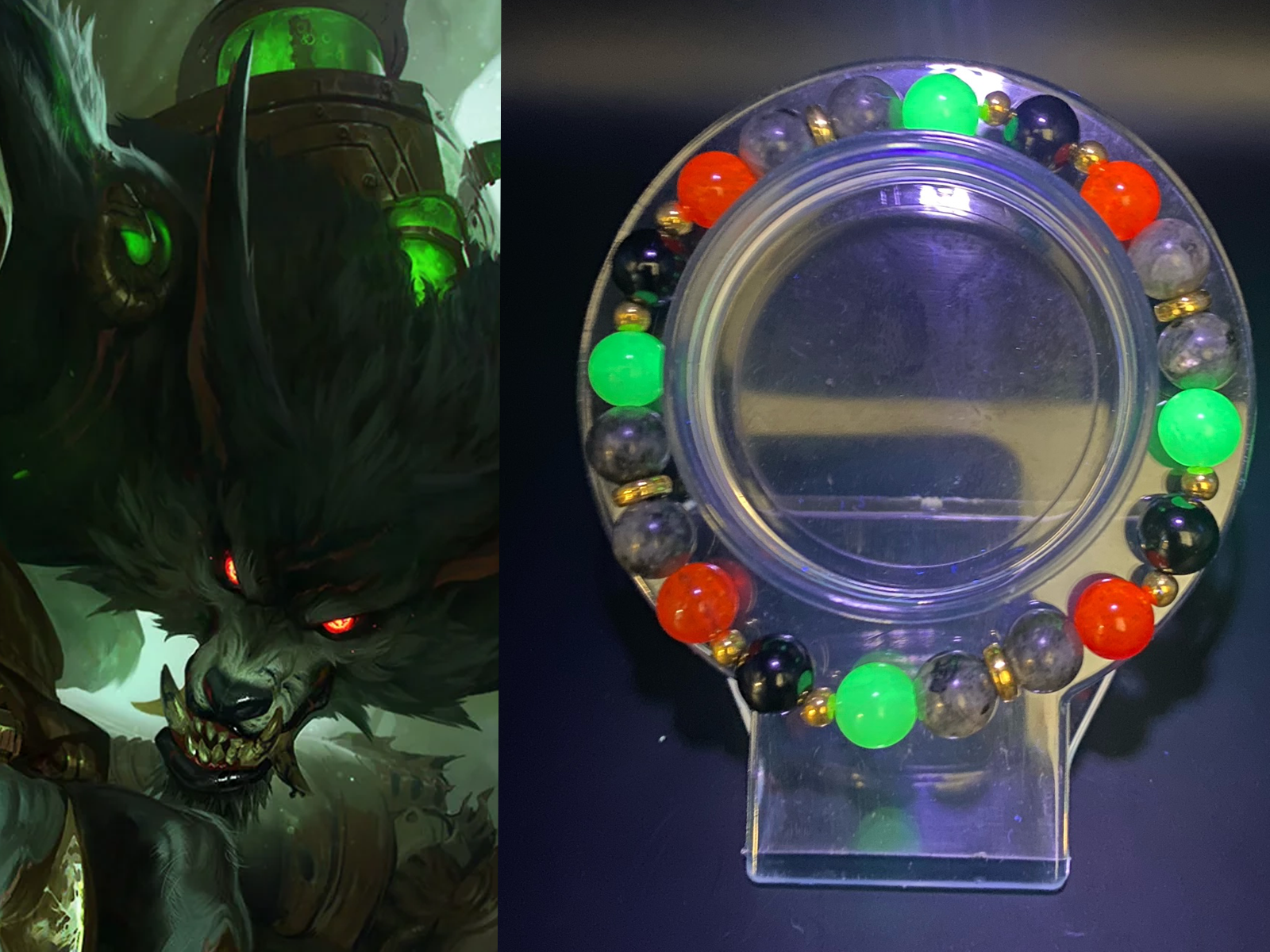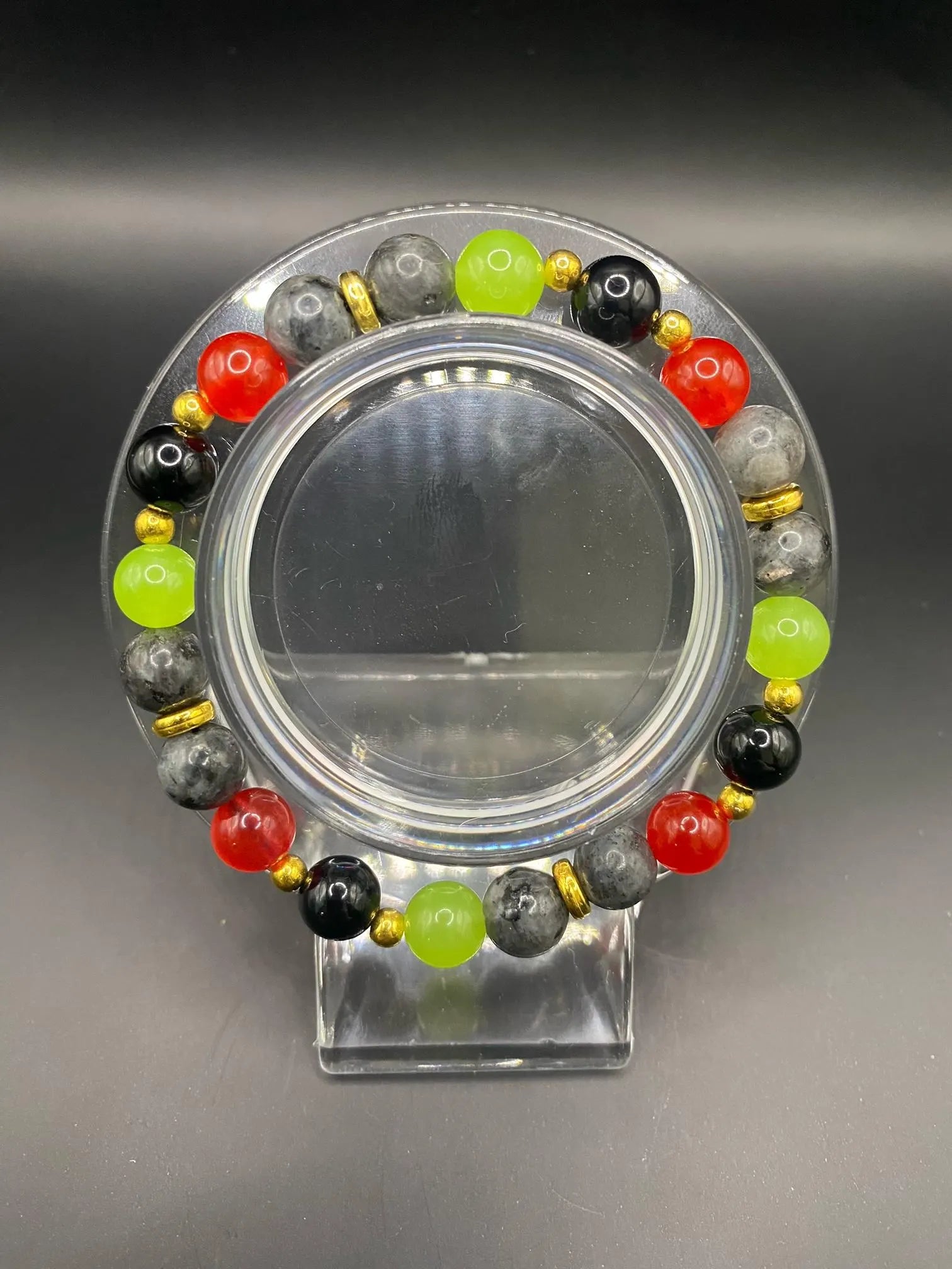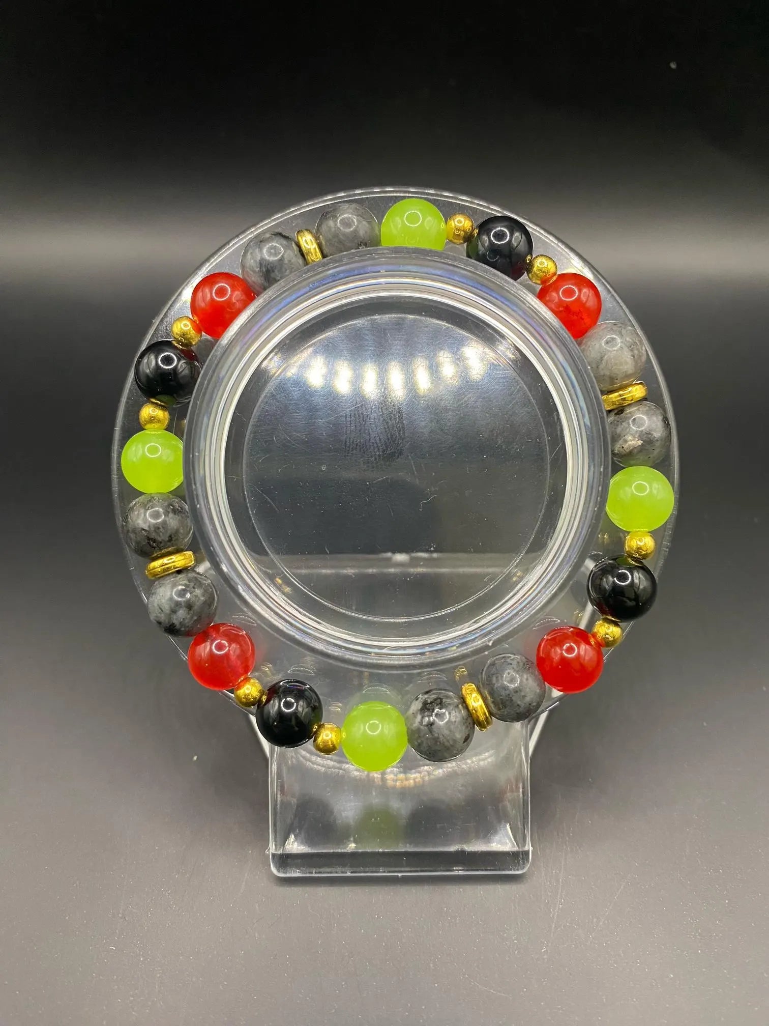 It's made with larvikite, obsidian and green and read chalcedony (Glows un UV!) beads with gold spacers <3
