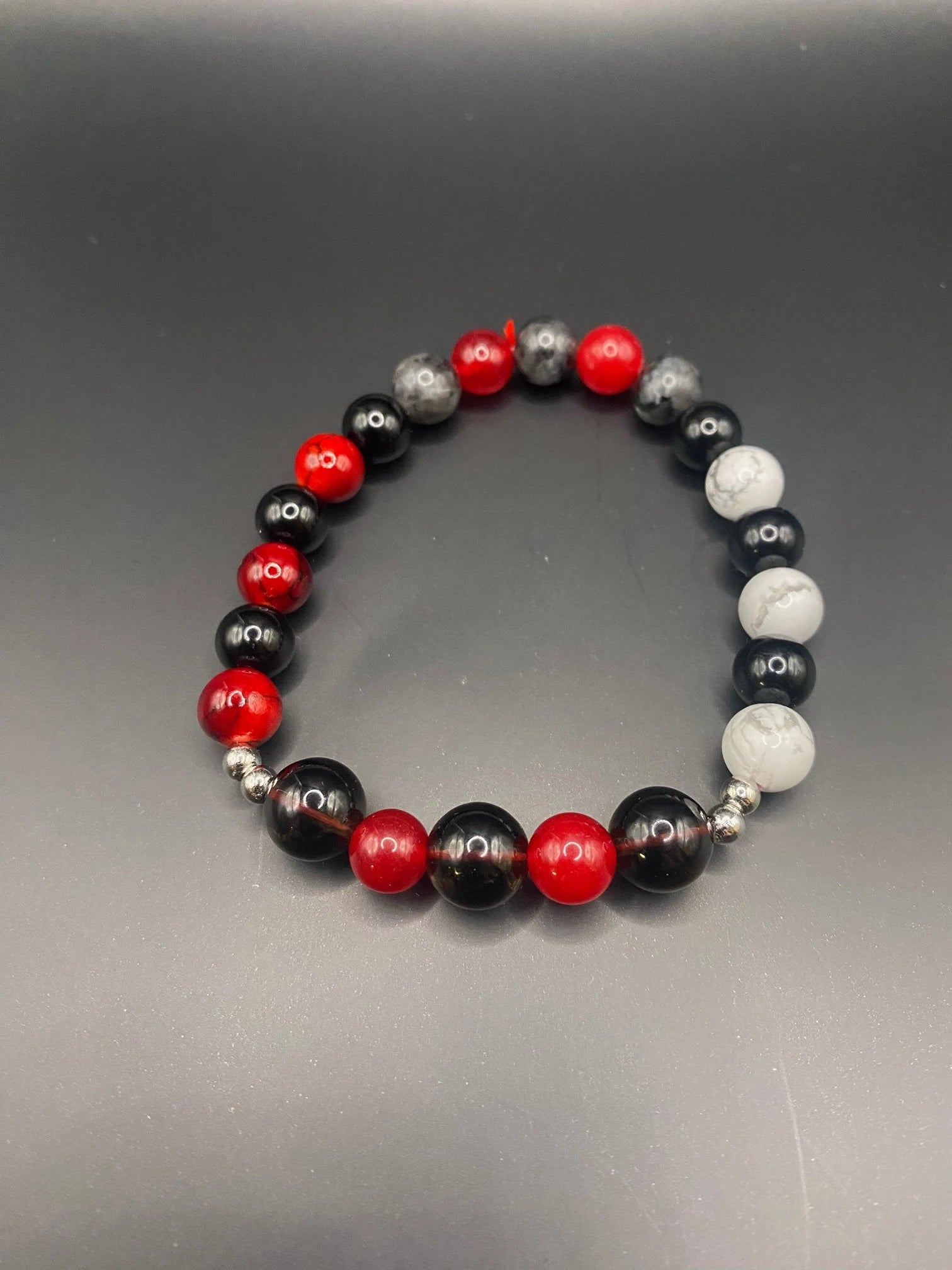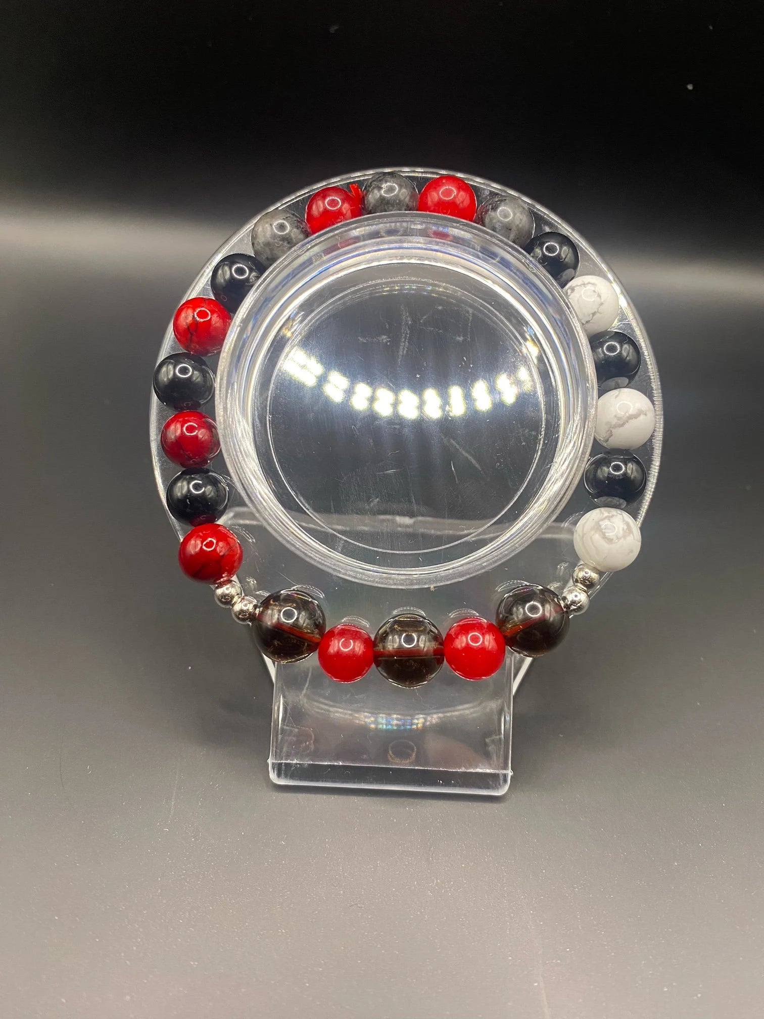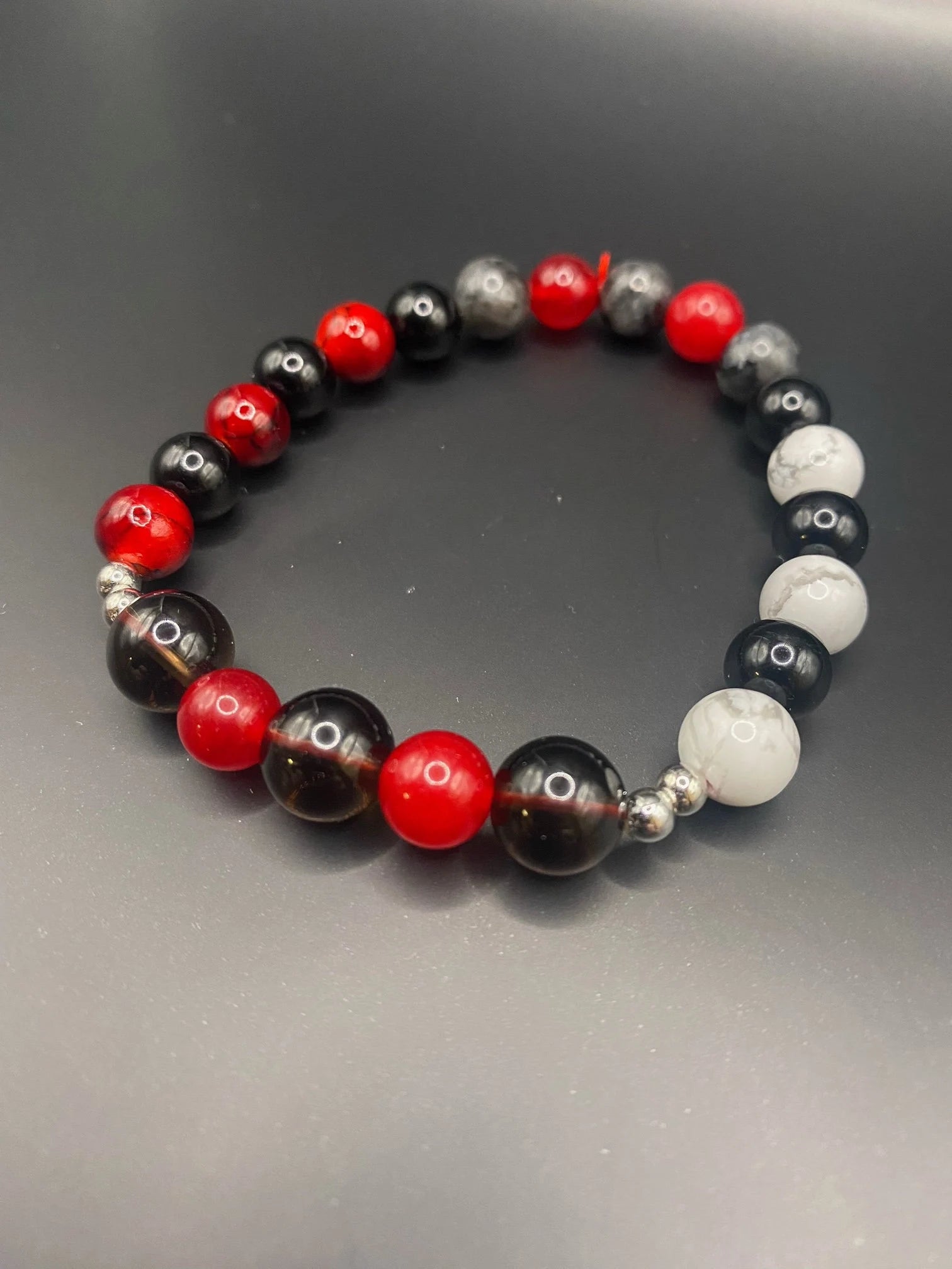 It's made with obsidian, howlite, red coral, red quartz (dyed), larvikite and smoky quartz with silver spacers <3