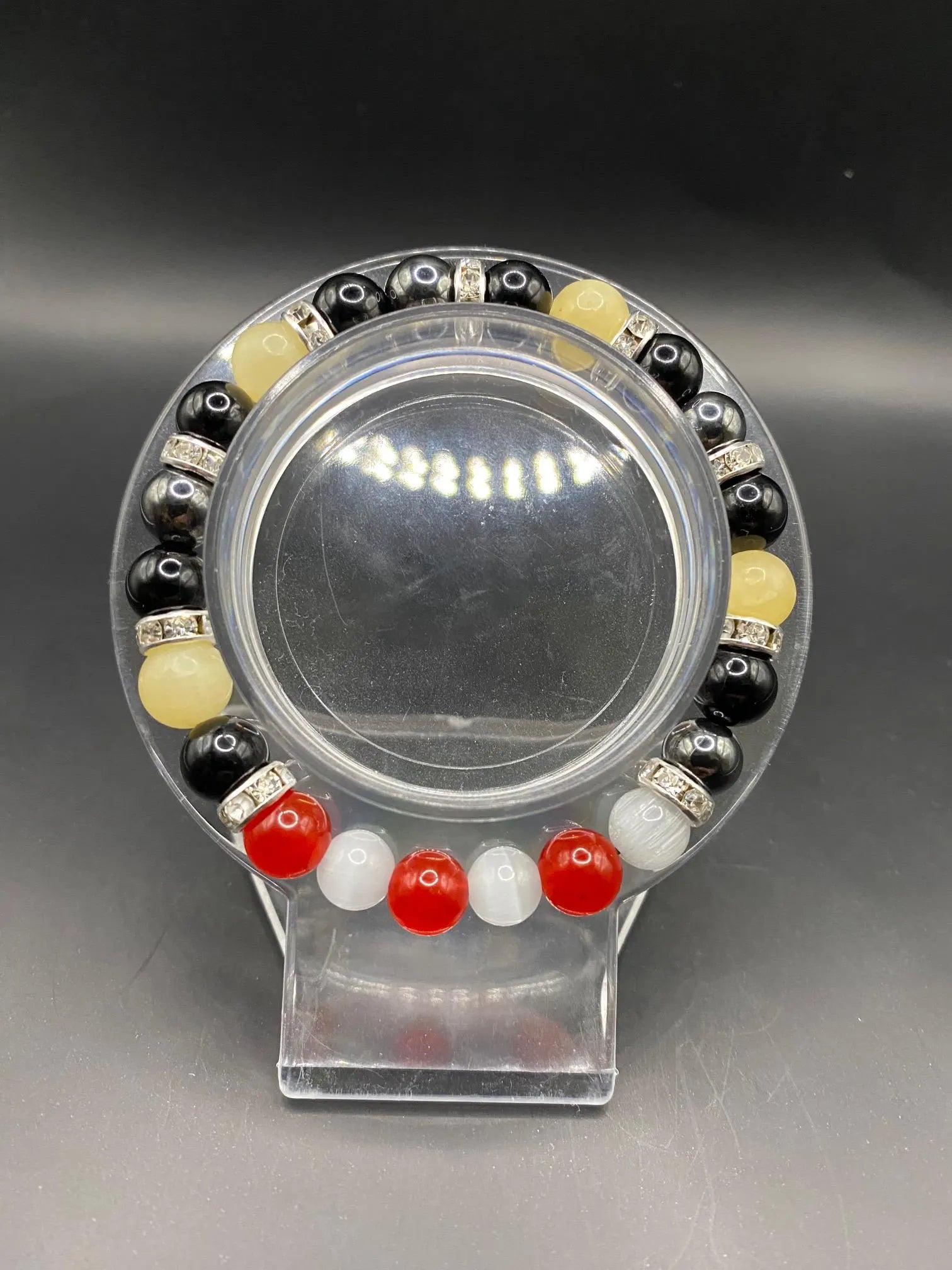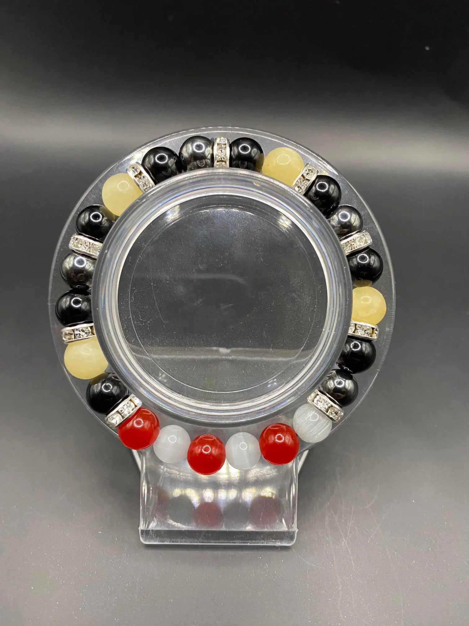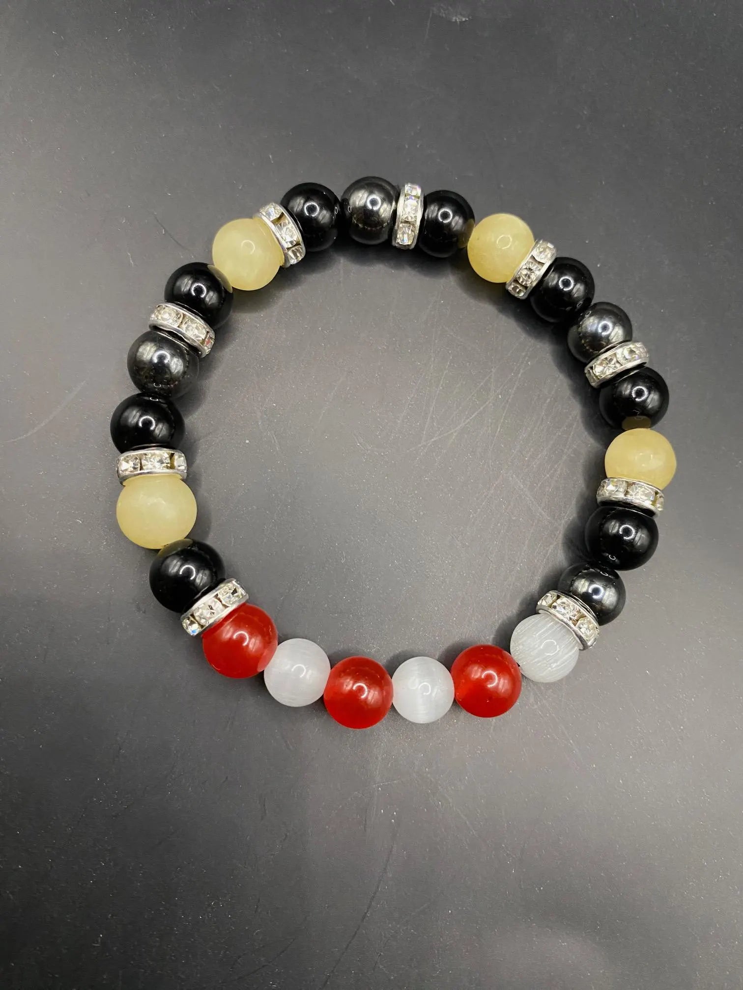 It's made with obsidian, hematite, honey calcite, white cats eye and red coral jade stones with silver spacers <3